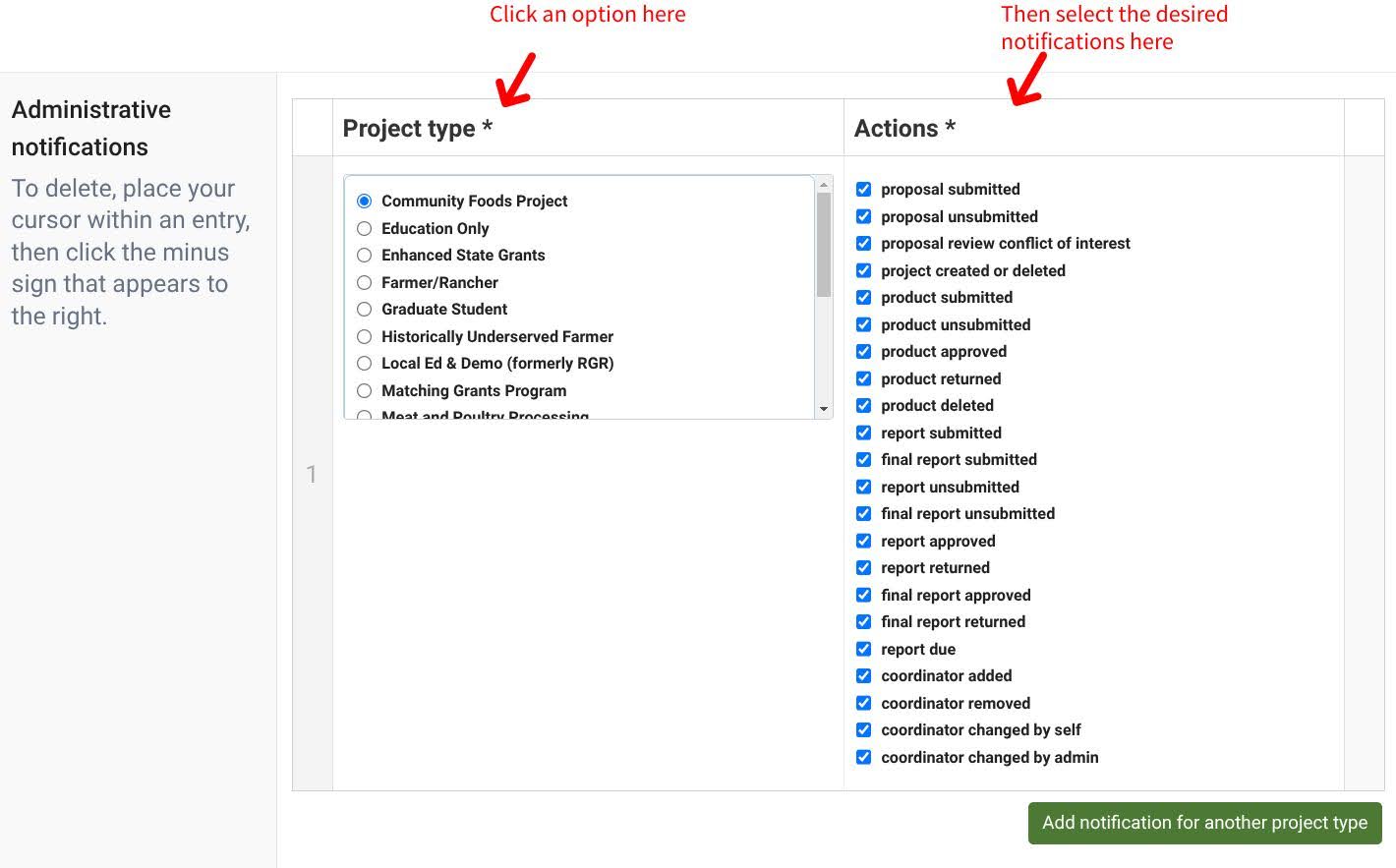 - Select a project type and all the notifications you would like to receive for that project type: