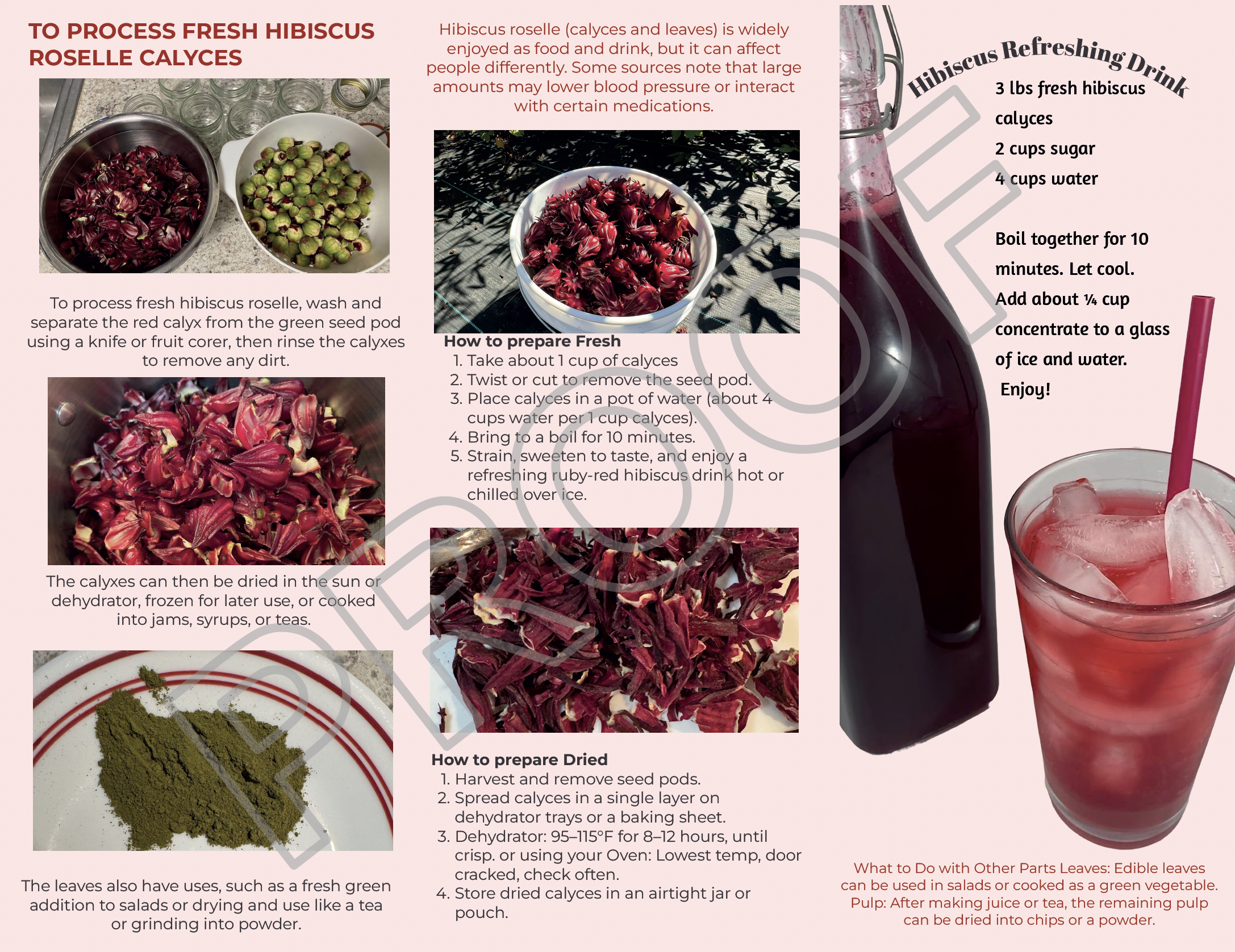Brochure with recipes and ways to enjoy Hibiscus roselle as a drink hot or cold .