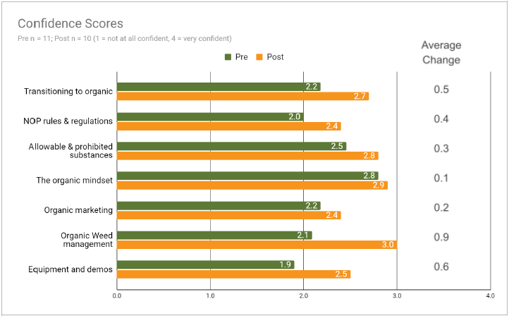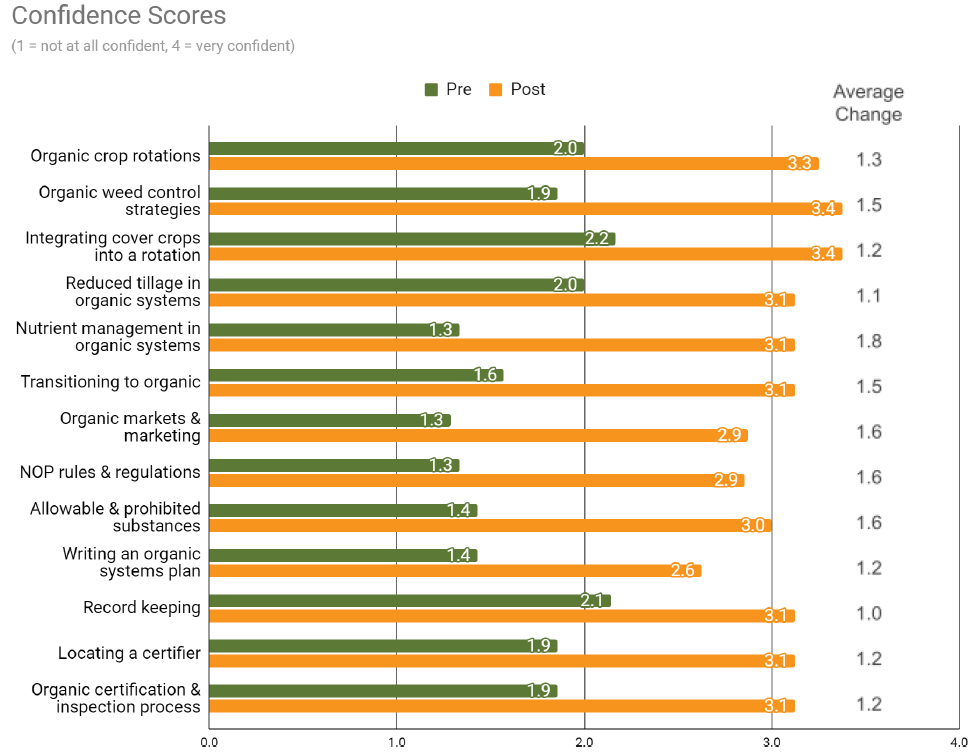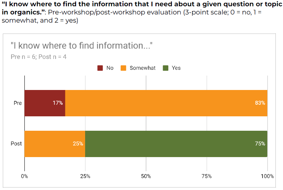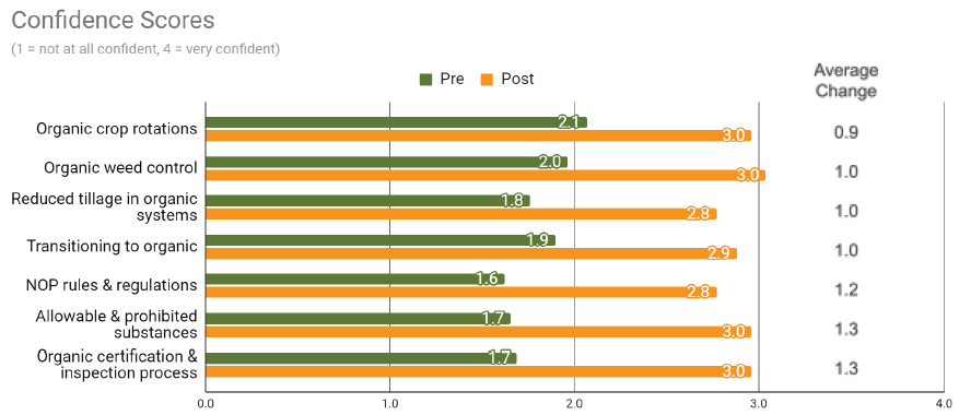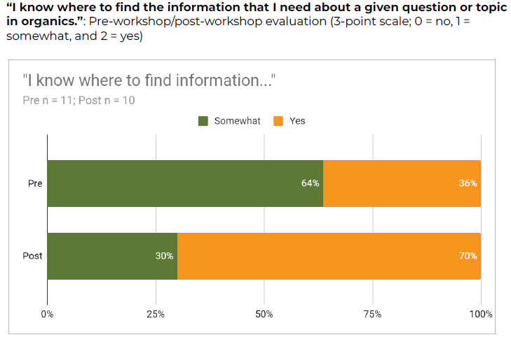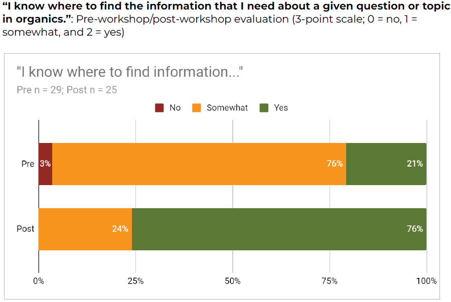 We are taking a distributed approach to the training methods that we provide. We offer online self-paced courses, a facilitated hybrid training course, durable resources such as fact sheets, and in-person stand-alone training. With this proposed project, we aim to provide high impact, in-person professional development training because we believe in-person interaction is vital to increasing the adoption of organic methods and creating a robust organic community among agricultural professionals.