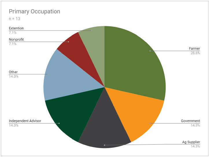 Agricultural professionals participating in each of eight local on-farm trainings, includes agronomists, Certified Crop Consultants, Extension educators, NRCS staff, ag. retail consultants, private consultants, NGO educators |