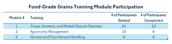 All three Food-Grade Grains Training Modules launched September 30, 2025. Project partners promoted the modules via live webinars, newsletters, social media, and word of mouth across their membership and networks. The training modules landing page is hosted on the Artisan Grain Collaborative’s website which features a host of resources and was the best option for long-term longevity and use of the modules.
