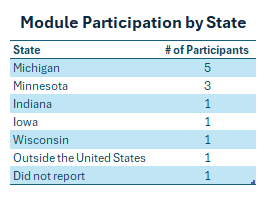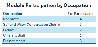 Participants were primarily from the states of Michigan and Minnesota and worked at nonprofits or Soil and Water Conservation Districts.
