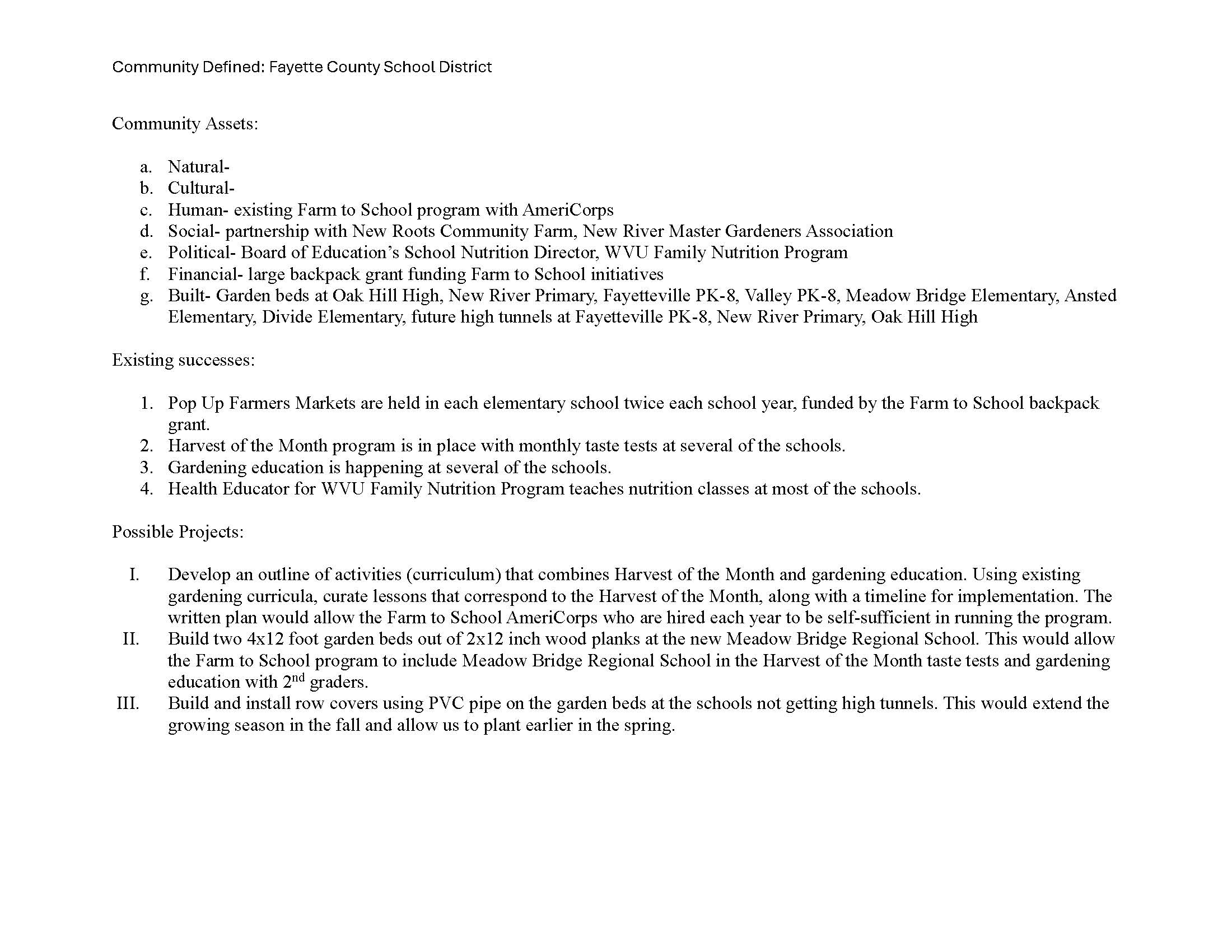 Participants were invited to join a network of Farm to School practitioners across the state. This network meets four times annually, to share successes, troubleshoot challenges, and learn from one another. These quarterly peer network gatherings provided opportunities to introduce experts in the field and help connect to existing resources. This peer-learning network has morphed into a larger state wide network of roughly 120 individuals, rebuilding the start of the farm to school system in West Virginia. This is continuing into a formalized support network (the WV Farm to School Alliance/Working Group) that is supported by the Benedum Foundation, the WV Department of Agriculture, and the WV Department of Education.