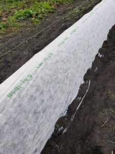 Bed 2 was also 50 feet long and ran north/south. The row was planted with broccoli, cauliflower and green cabbage and covered with lightweight Pro-19 fabric immediately after planting took place.