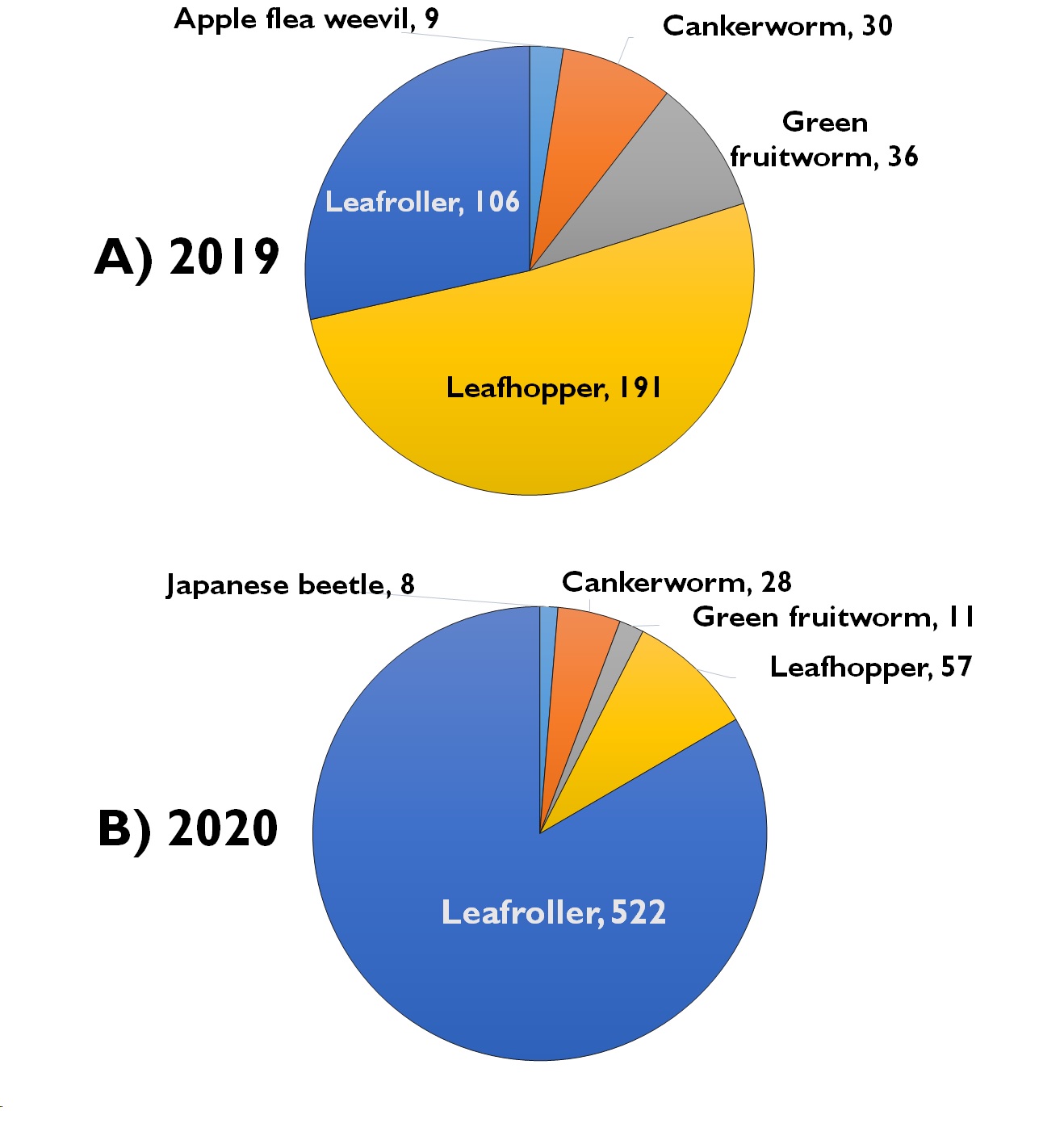 Figure 1. Total foliage insect pests observed in (A) 2019 and (B) 2020.