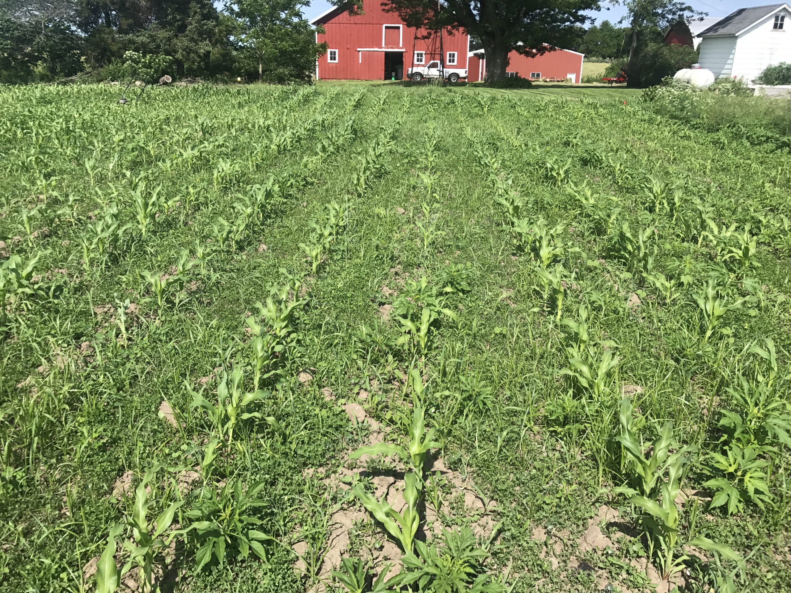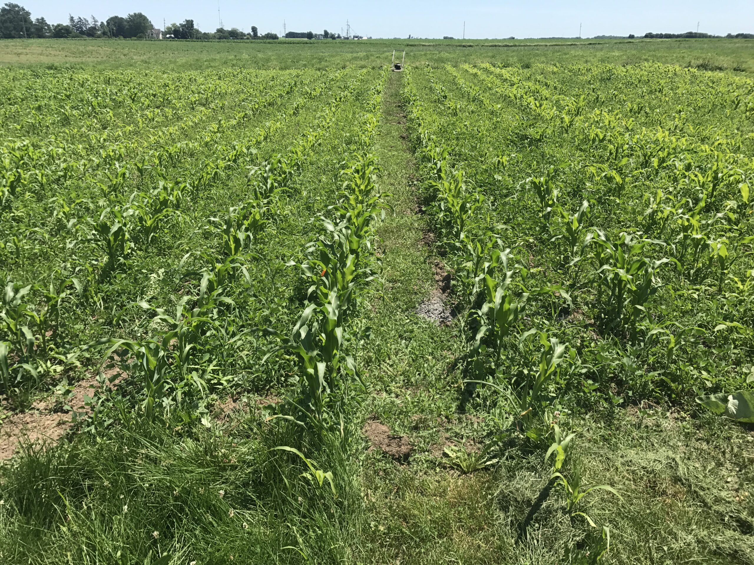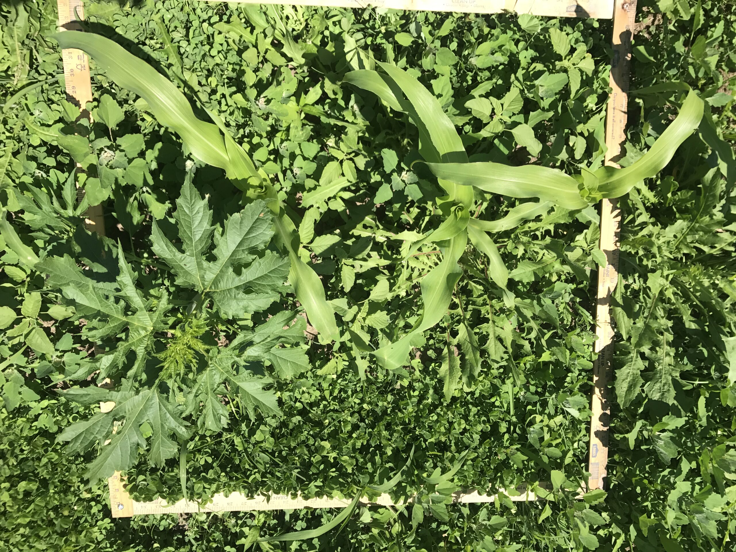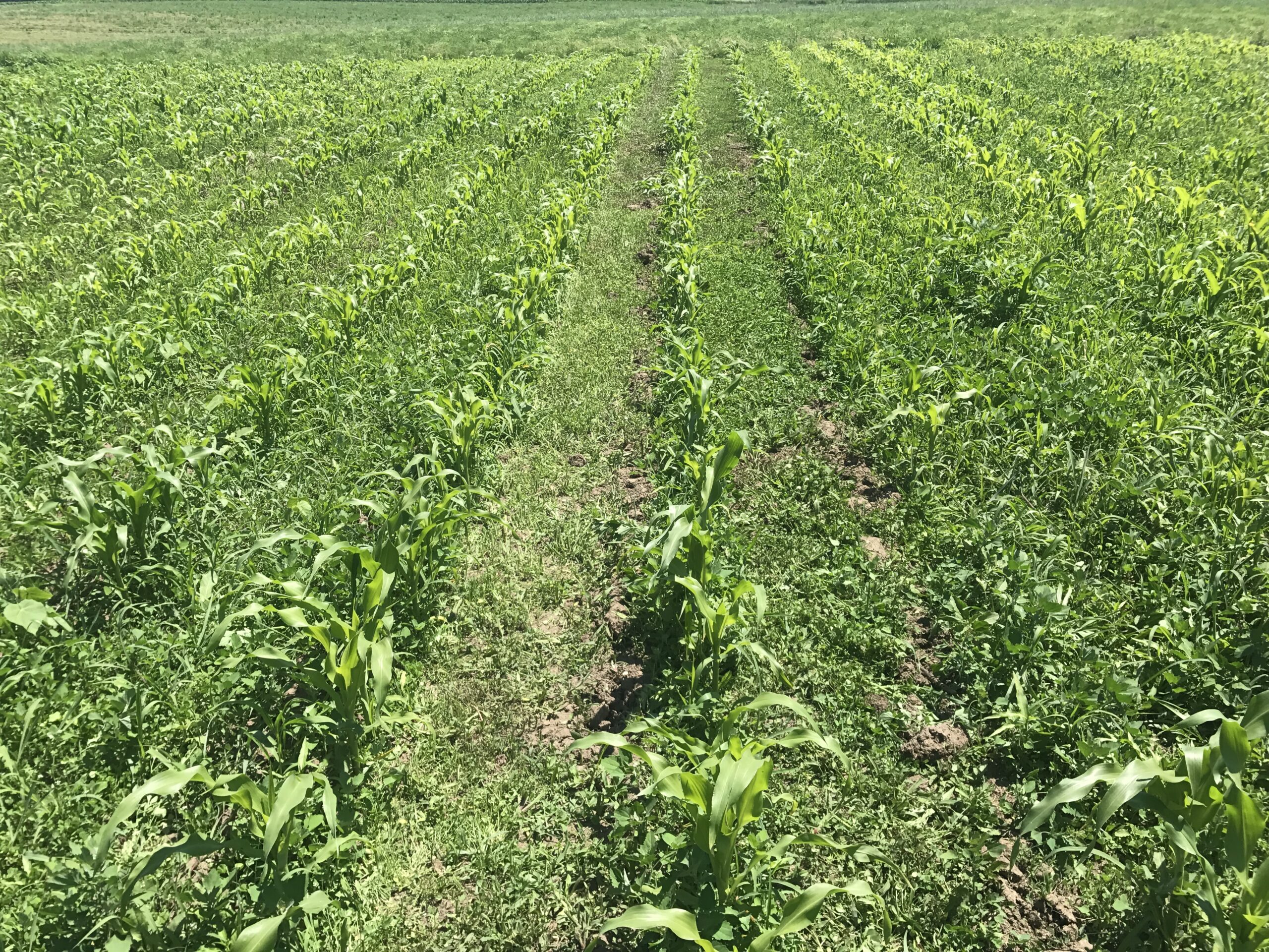 On June 4 I performed a test run of the inter-row crimper unit on both the 2019 and 2020 plots. Some of the weeds were crimped but the grassy species (foxtail) rebounded. Mornings were better for crimping the turgid broadleaf stems, which then dried out in the afternoon sun. The inter-row crimper unit could not be adjusted closer than 4 inches to either side of the corn rows, leaving at least 8 inches of weeds in the corn row. Because of the uneven spacing in the rows due to the six-row planter versus eight-row strip tiller, some of the rows in both the 2019 and 2020 plots could not be crimped. The inter-row crimper unit was effective at crimping the balansa clover between the rows because the balansa stems are hollow and wilt and dry easily once crimped. The balansa, however, along with any other weeds in the row, remained a problem.
