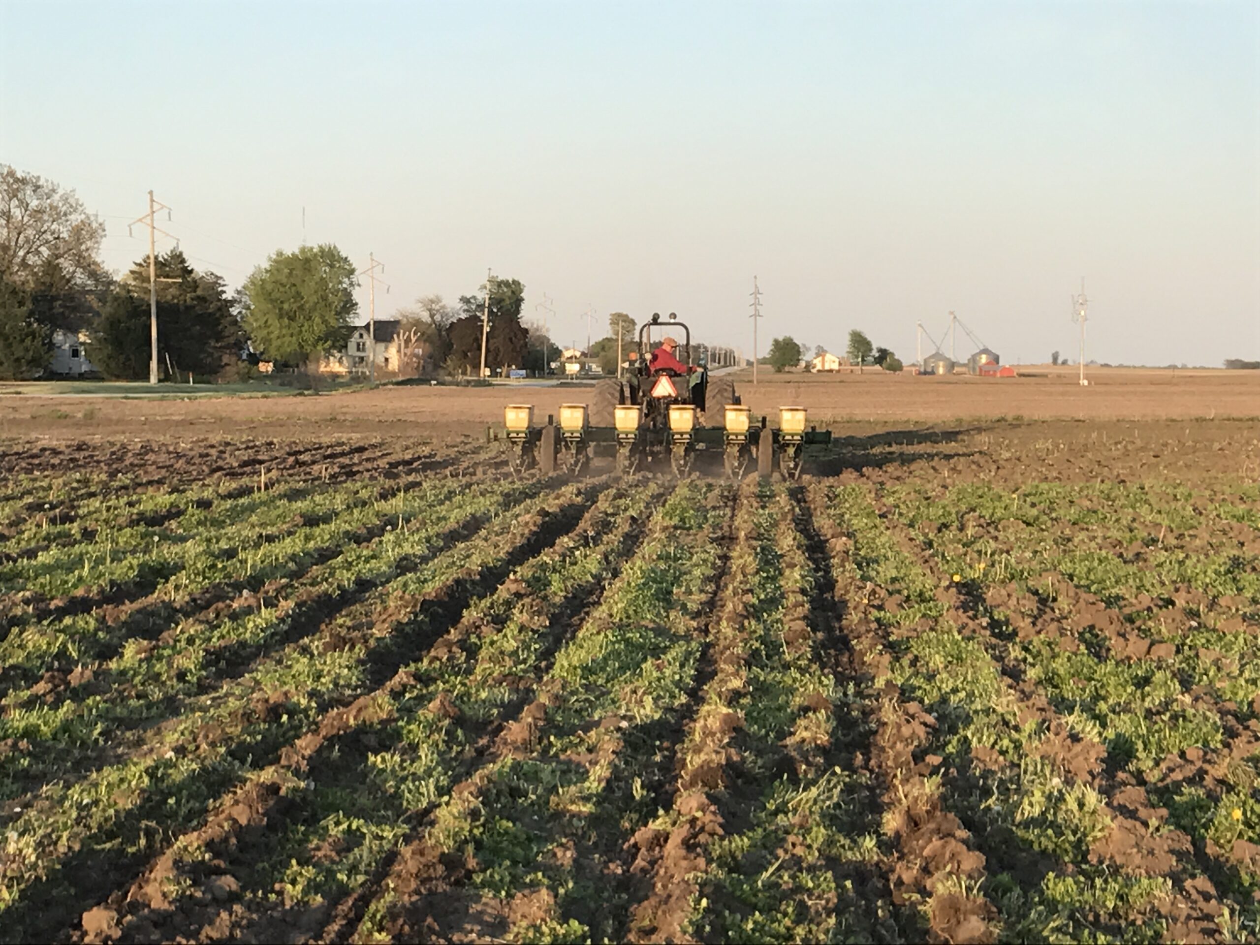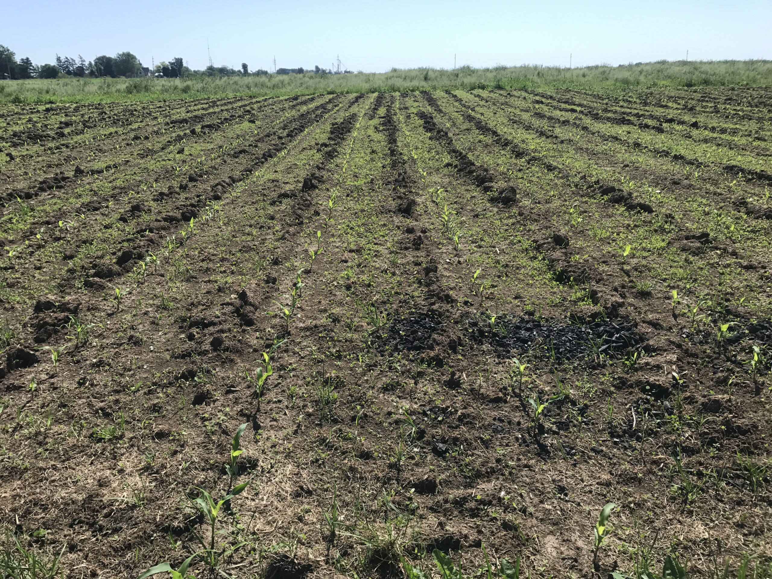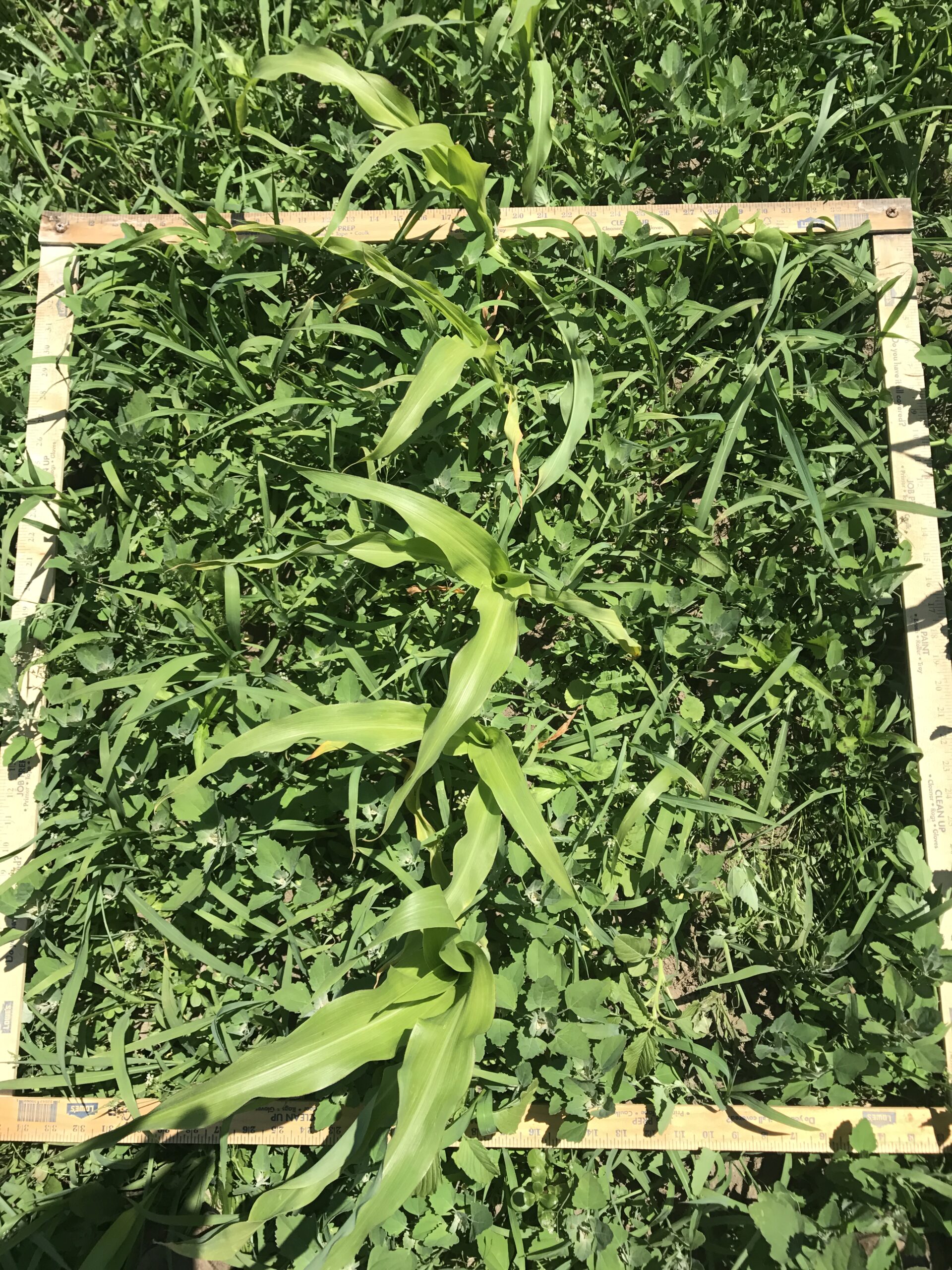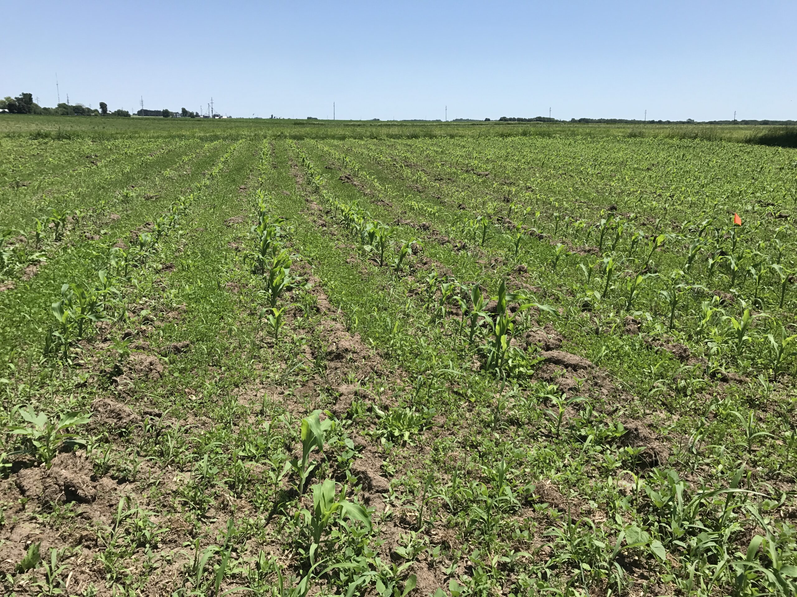 On June 4 I performed a test run of the inter-row crimper unit on both the 2019 and 2020 plots. Some of the weeds were crimped but the grassy species (foxtail) rebounded. Mornings were better for crimping the turgid broadleaf stems, which then dried out in the afternoon sun. The inter-row crimper unit could not be adjusted closer than 4 inches to either side of the corn rows, leaving at least 8 inches of weeds in the corn row. Because of the uneven spacing in the rows due to the six-row planter versus eight-row strip tiller, some of the rows in both the 2019 and 2020 plots could not be crimped. The inter-row crimper unit was effective at crimping the balansa clover between the rows because the balansa stems are hollow and wilt and dry easily once crimped. The balansa, however, along with any other weeds in the row, remained a problem.