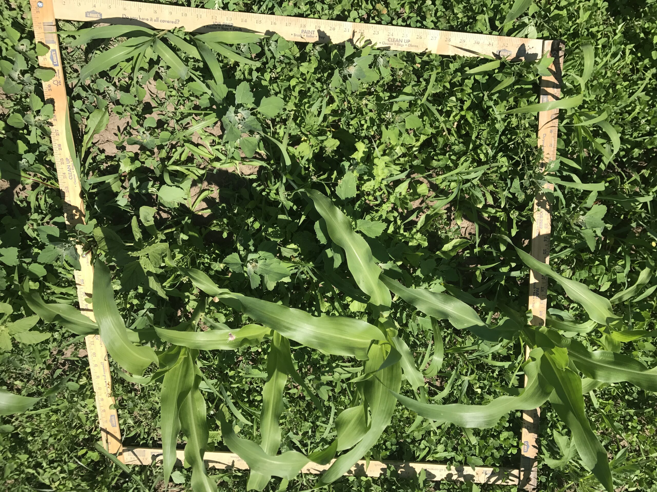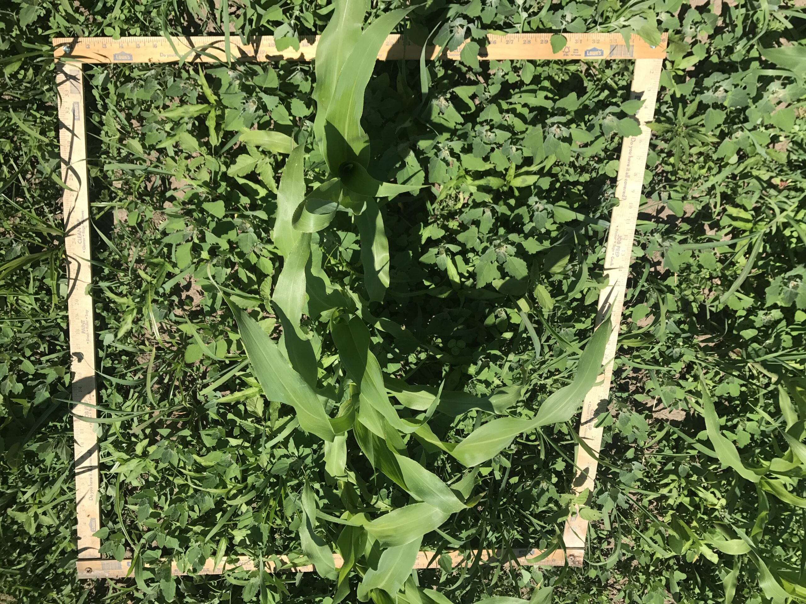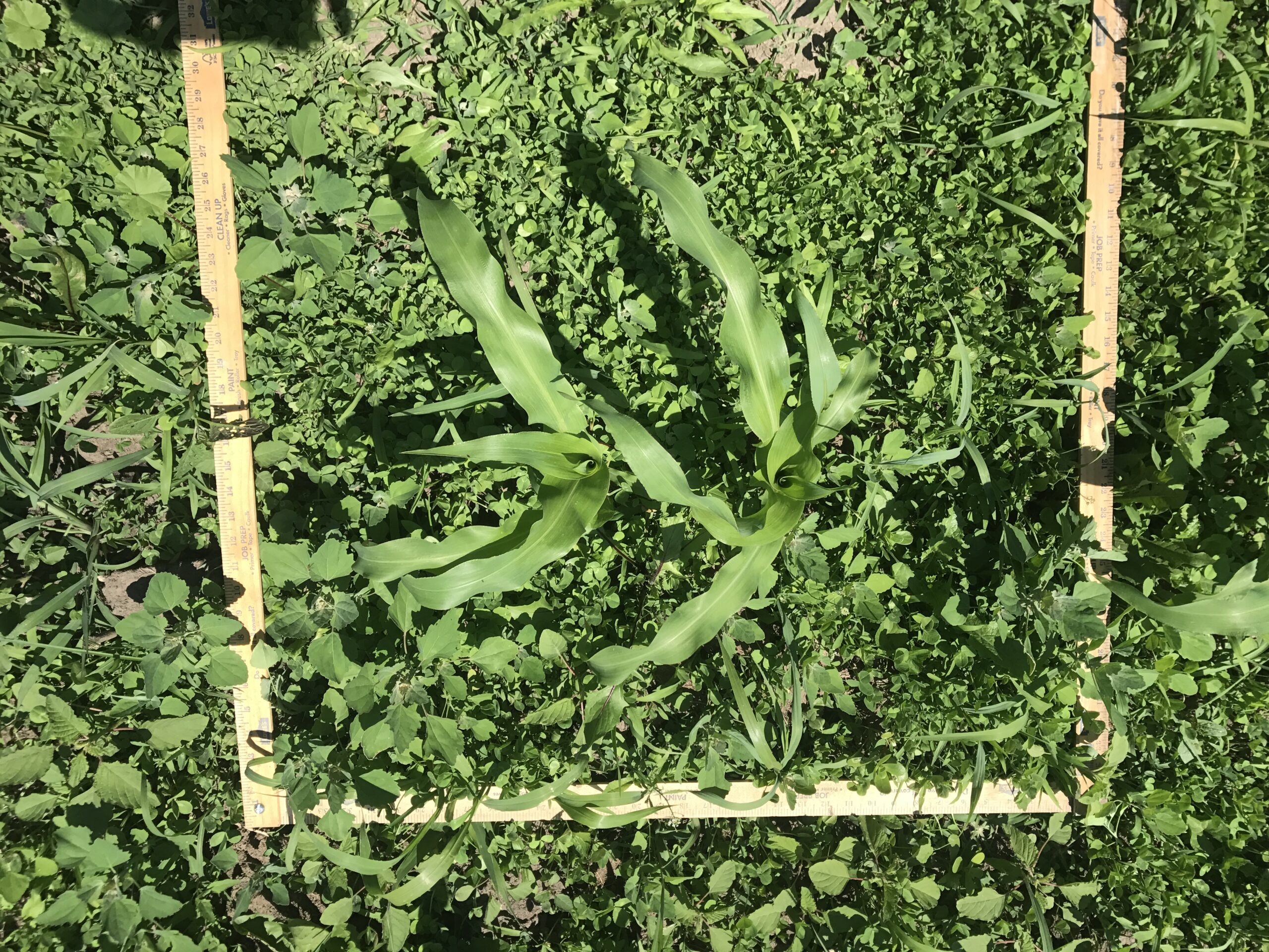 Early weed densities per one-yard quadrat were photographed and visually estimated via close-up inspection on June 11, 2020 in the Kura 2019 plot and on June 15 in the Kura 2020 plot. Weed density was inversely proportional to Kura plant density. Therefore, photos are listed according to Kura density estimates. HOWEVER, weeds were able to grow through and above the clover stand at all times. Sheer Kura density made a difference. Later weed densities were too great to measure. The spring-seeded clover in the 2020 Kura plot did not establish quickly enough to make a difference in the weed density or size. Mowing controlled weeds between the row only. The control (Rollins' plot) had no measurable weed pressure after cultivation until after lay-by. Late-season weeds in the control were present but not detracting from ear yield, size, fill, or quality.