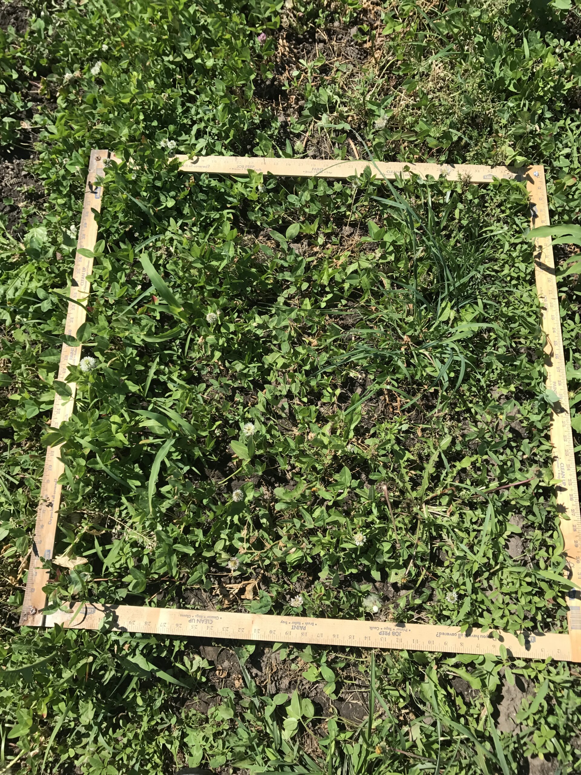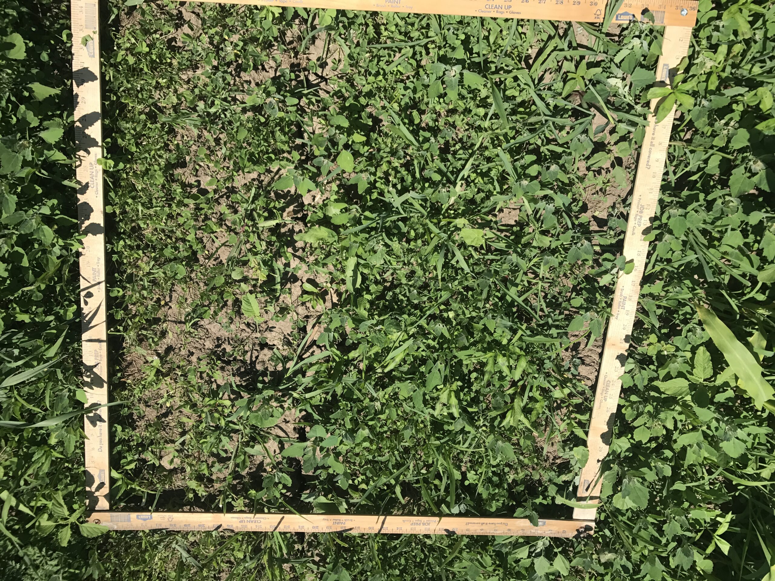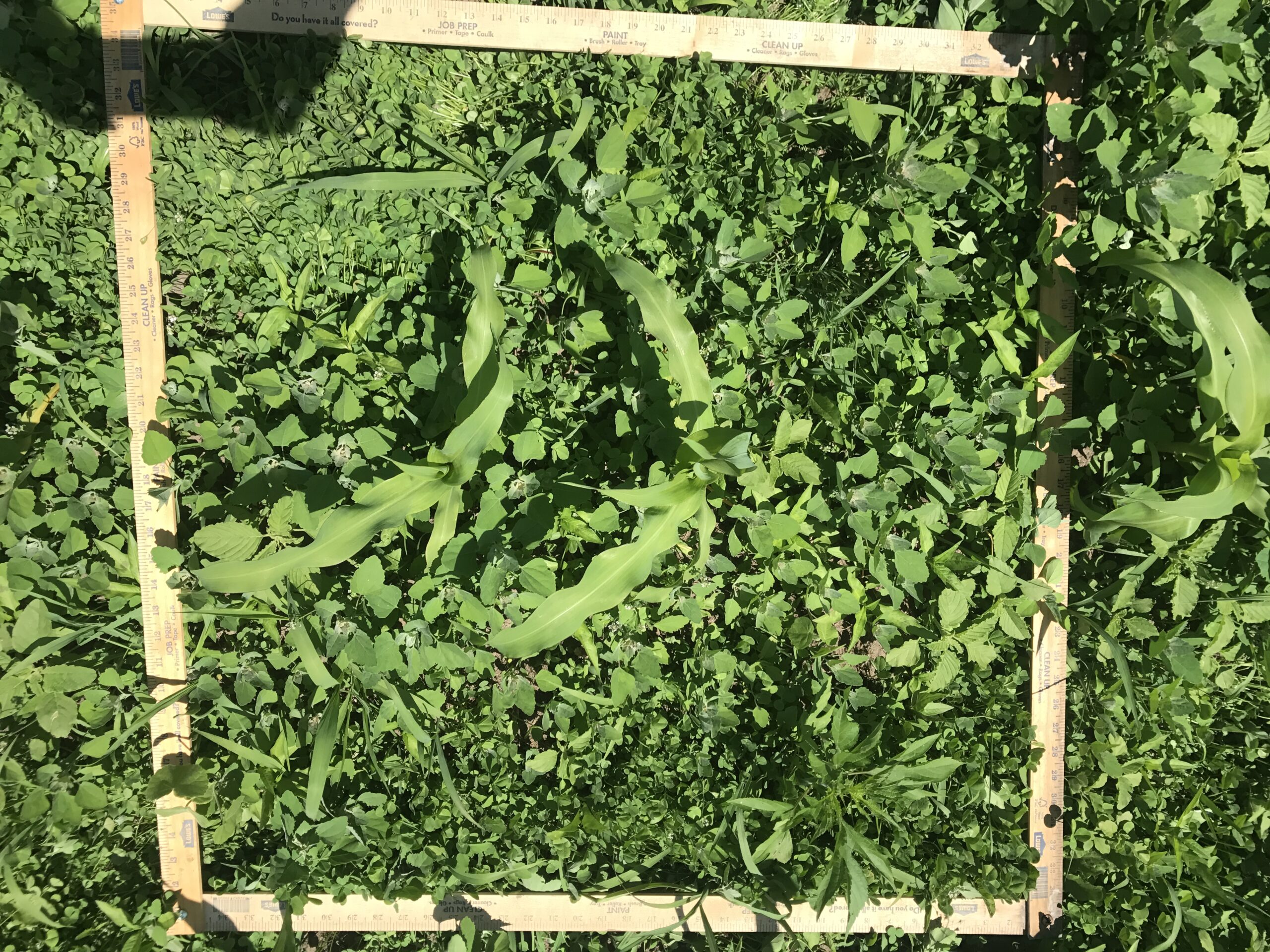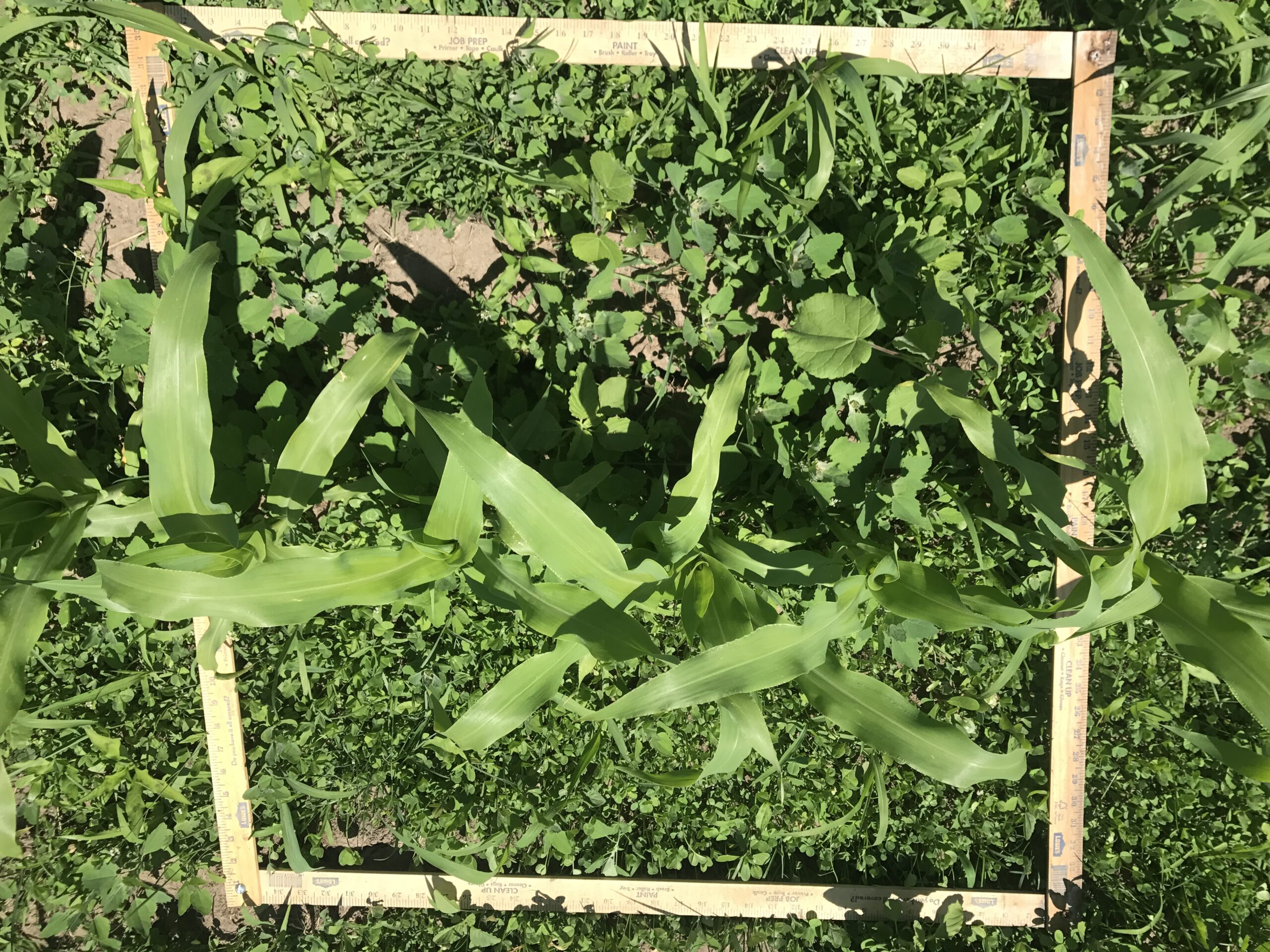Early weed densities per one-yard quadrat were photographed and visually estimated via close-up inspection on June 11, 2020 in the Kura 2019 plot and on June 15 in the Kura 2020 plot. Weed density was inversely proportional to Kura plant density. Therefore, photos are listed according to Kura density estimates. HOWEVER, weeds were able to grow through and above the clover stand at all times. Sheer Kura density made a difference. Later weed densities were too great to measure. The spring-seeded clover in the 2020 Kura plot did not establish quickly enough to make a difference in the weed density or size. Mowing controlled weeds between the row only. The control (Rollins' plot) had no measurable weed pressure after cultivation until after lay-by. Late-season weeds in the control were present but not detracting from ear yield, size, fill, or quality.