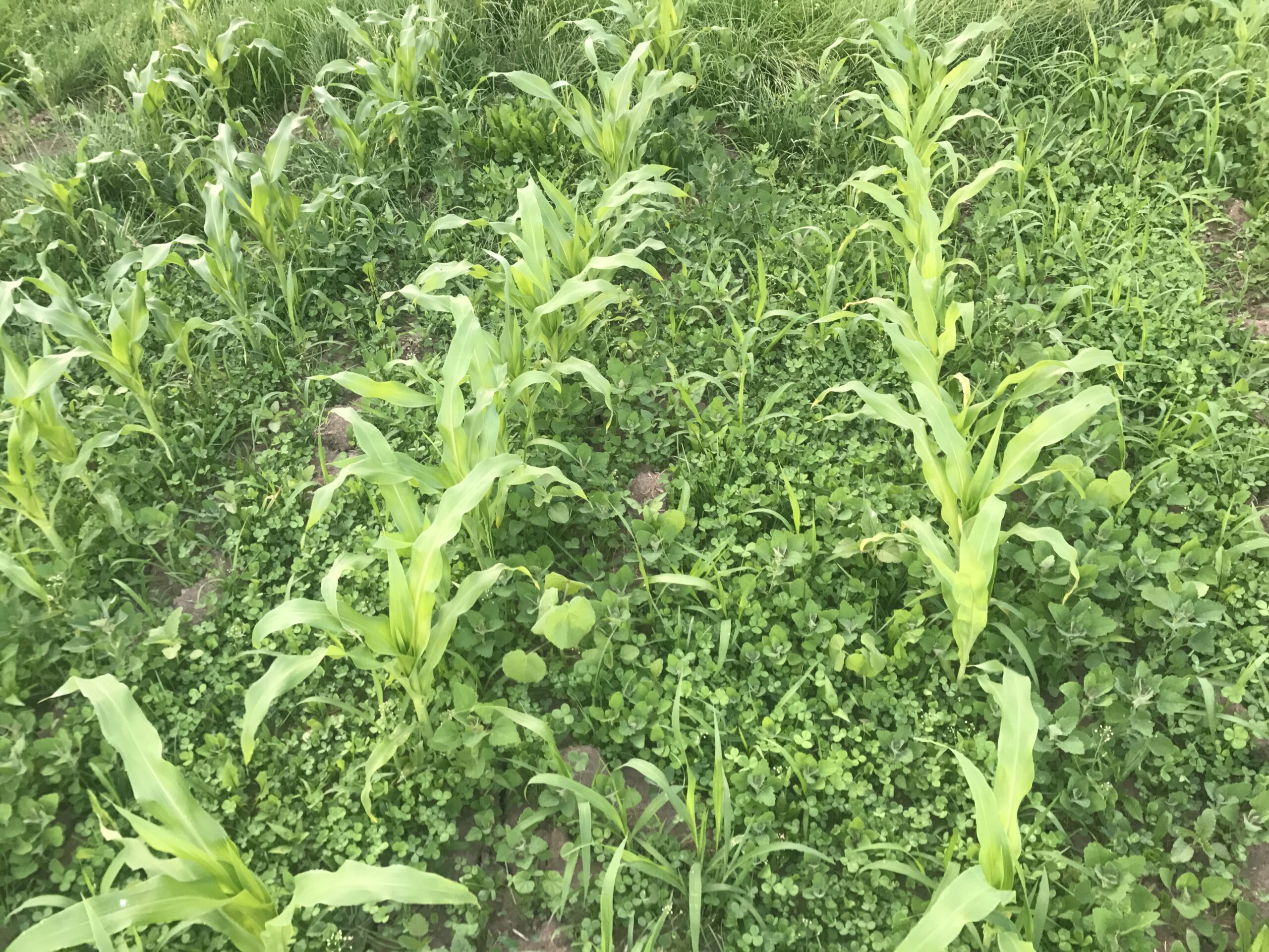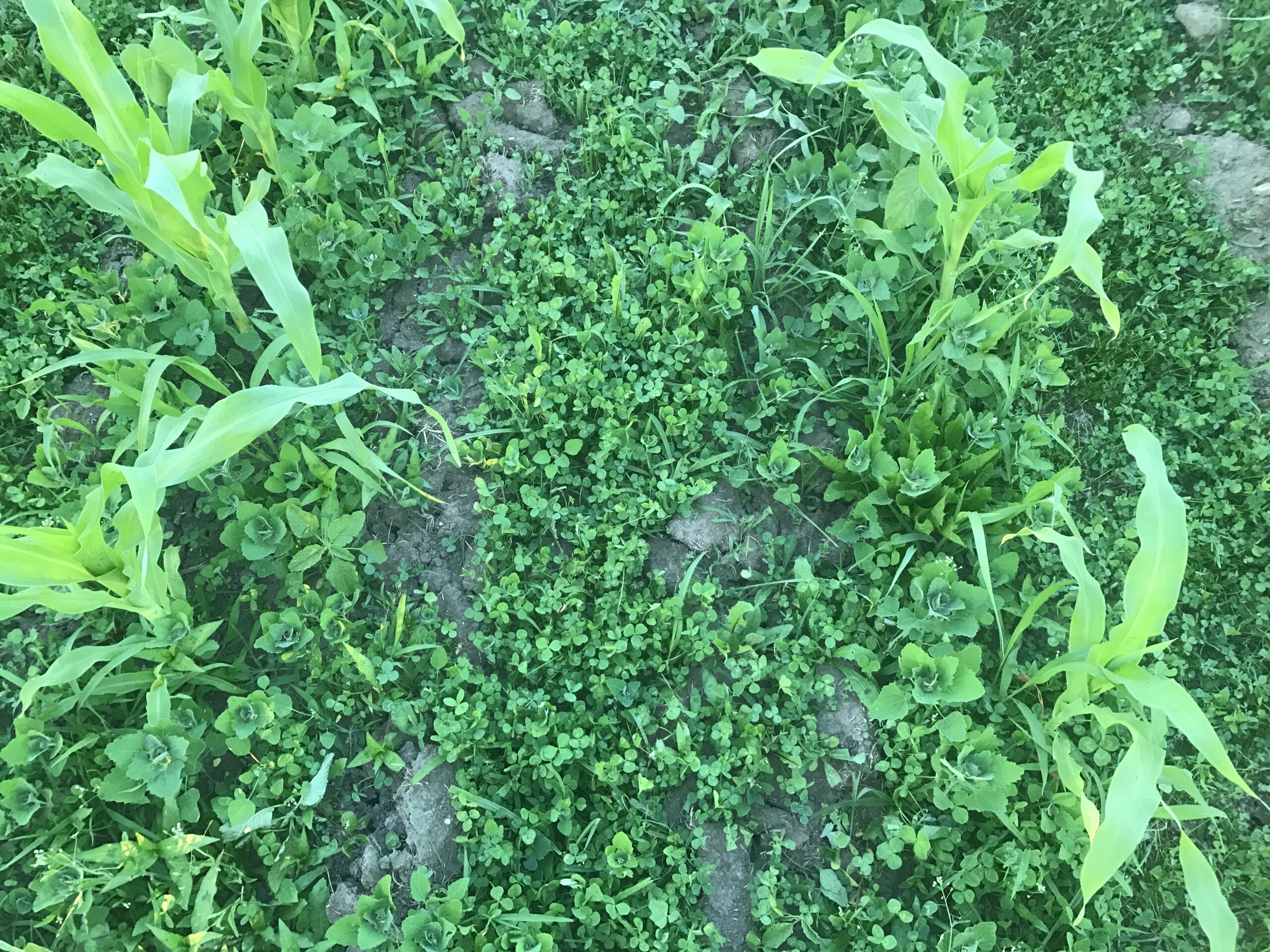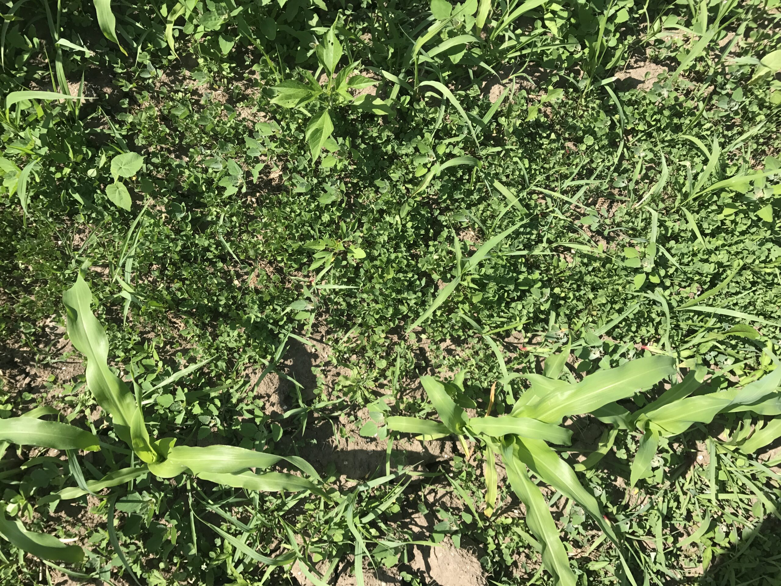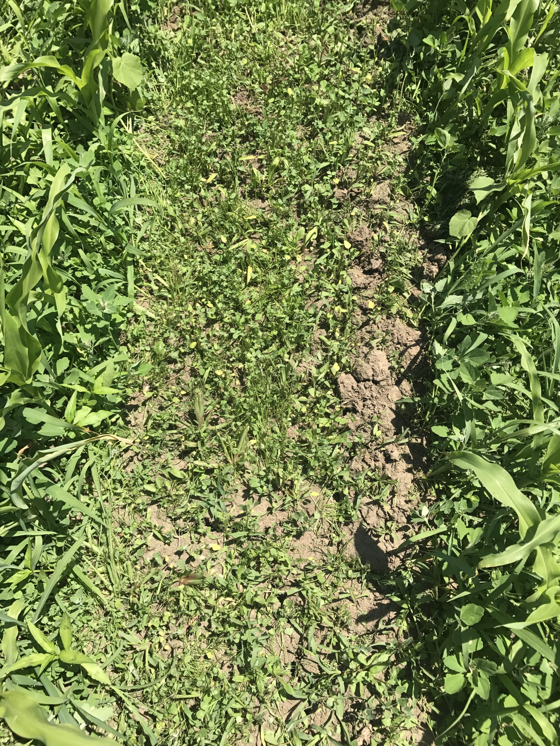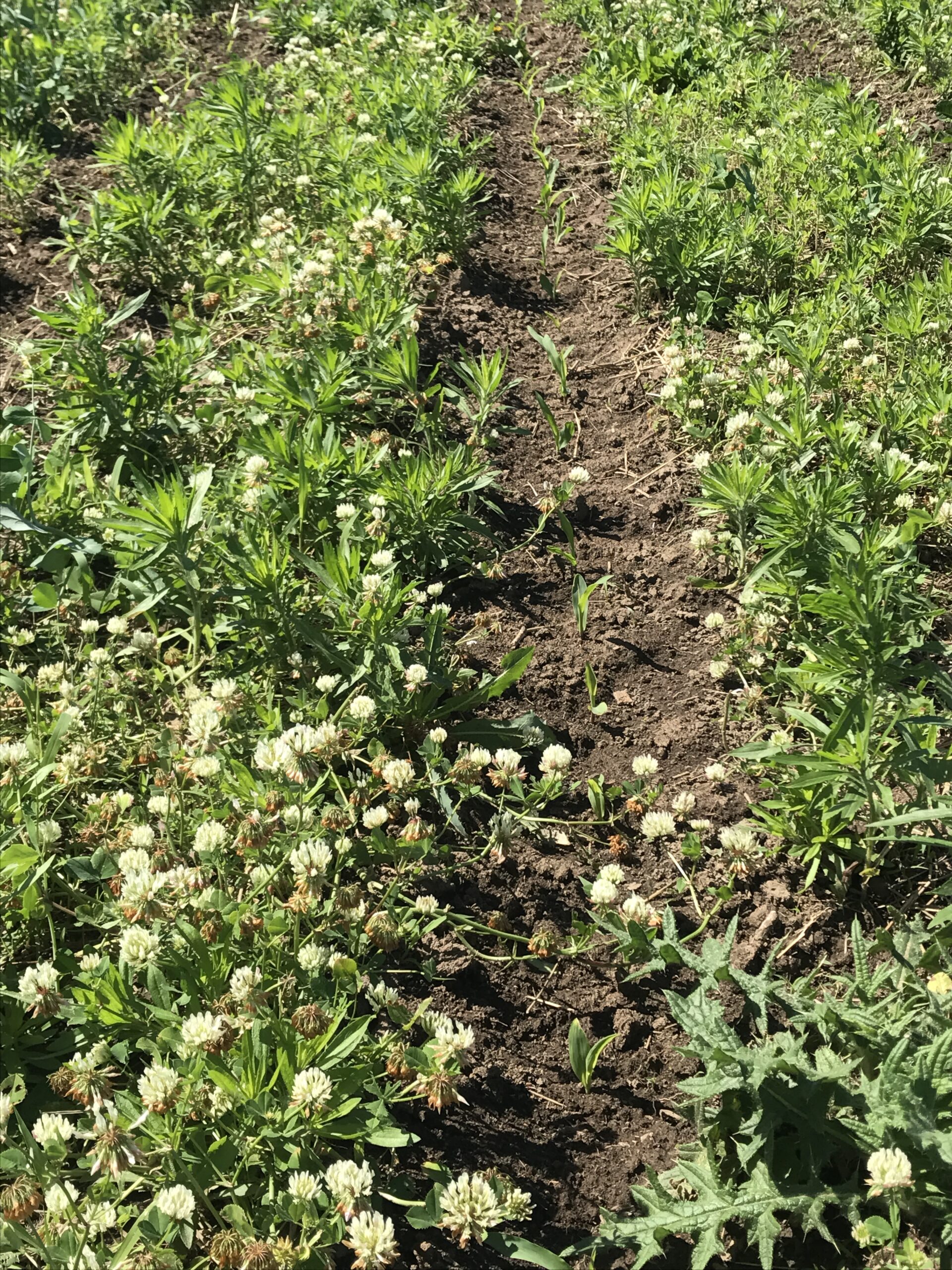 c) Kura clover can grow 10-12 inches in a season (Dr. Kenneth Albrecht, personal communication, 2019), so I was counting on the Kura clover filling in. I was NOT counting on the tilled strips being ideal conditions for small-seeded annual weeds growing in bare, disturbed soil after a rain and before the corn emerged. The weed seeds quickly outgrew the Kura clover and took over the tilled strips.