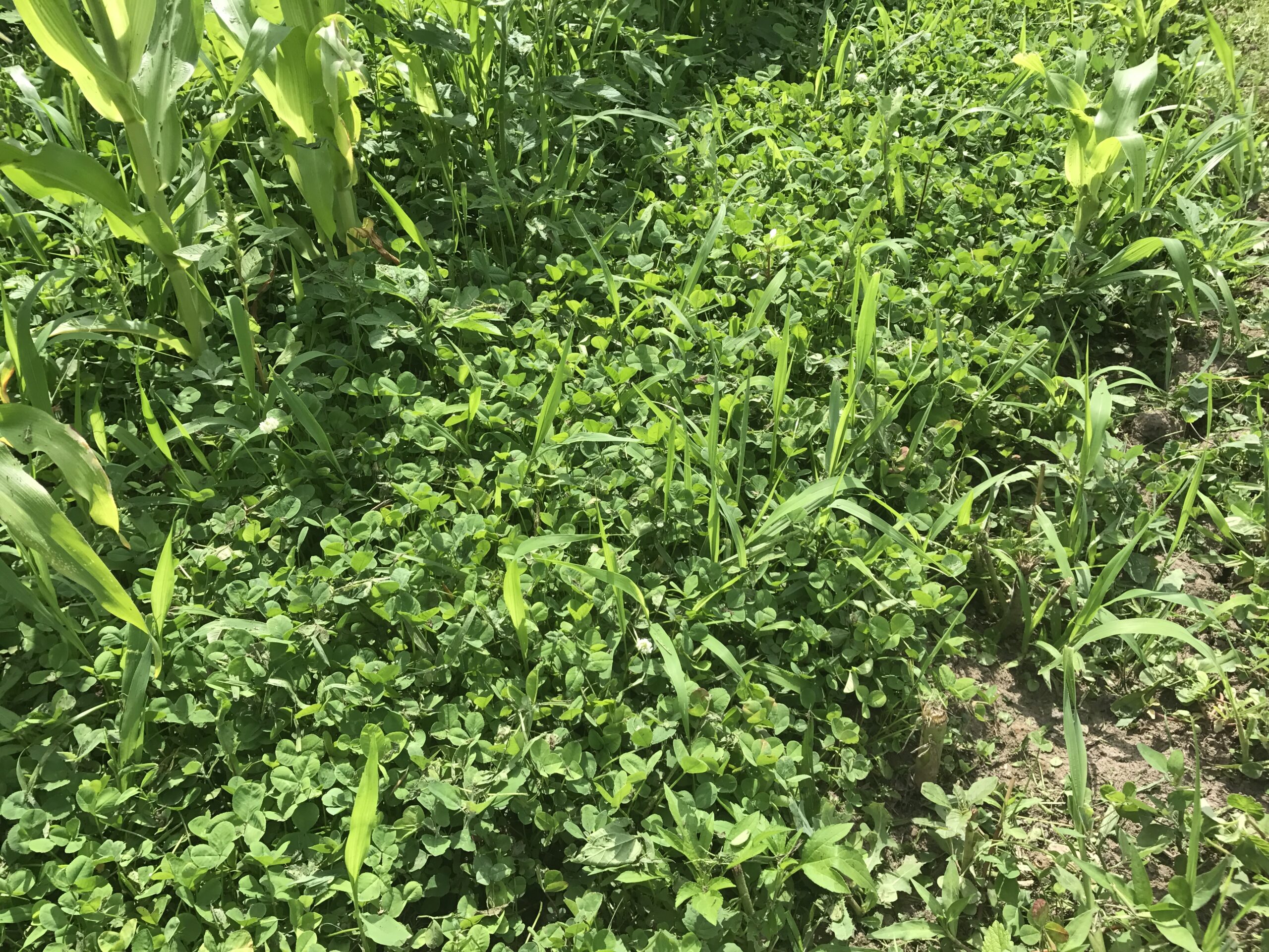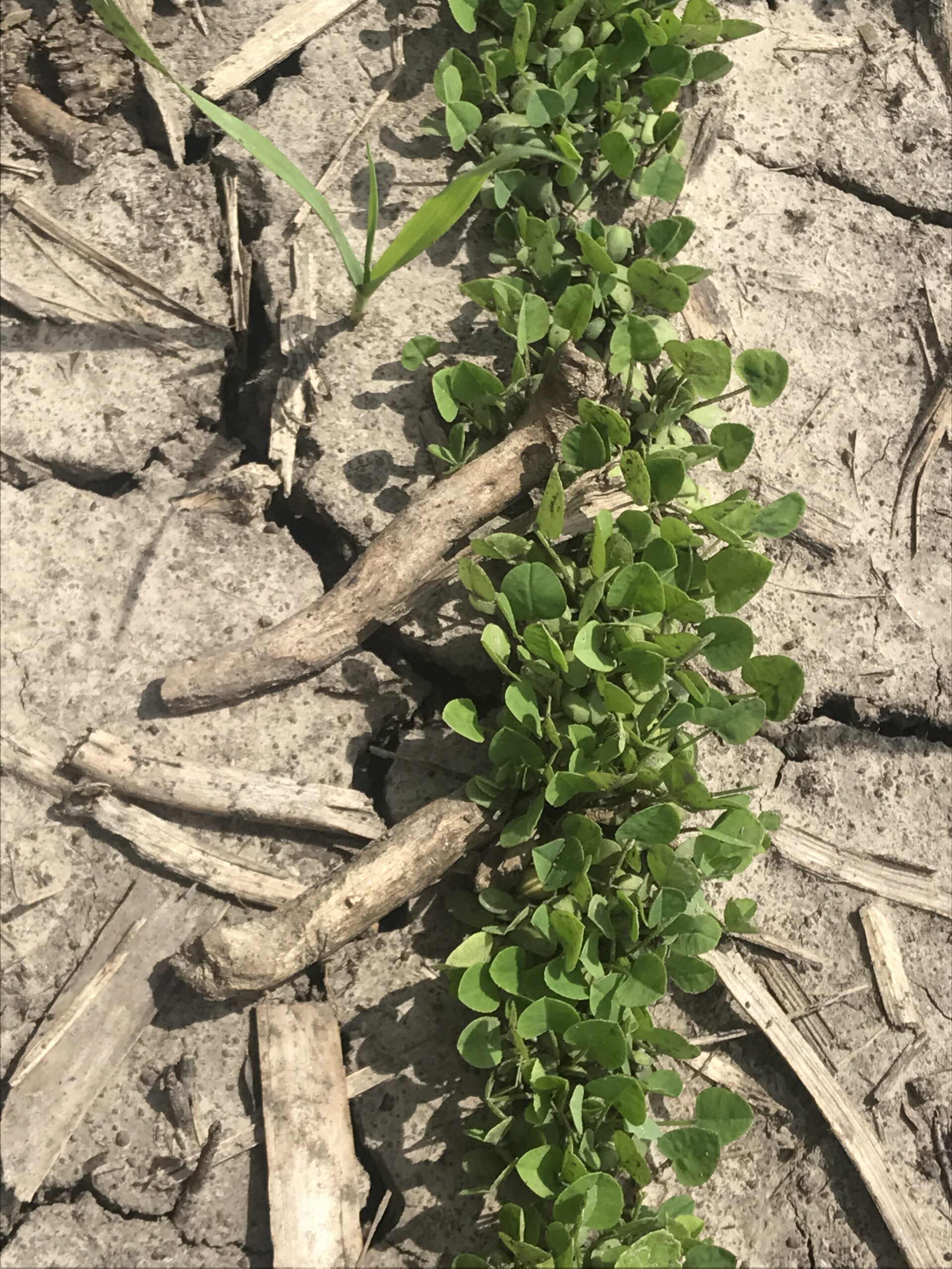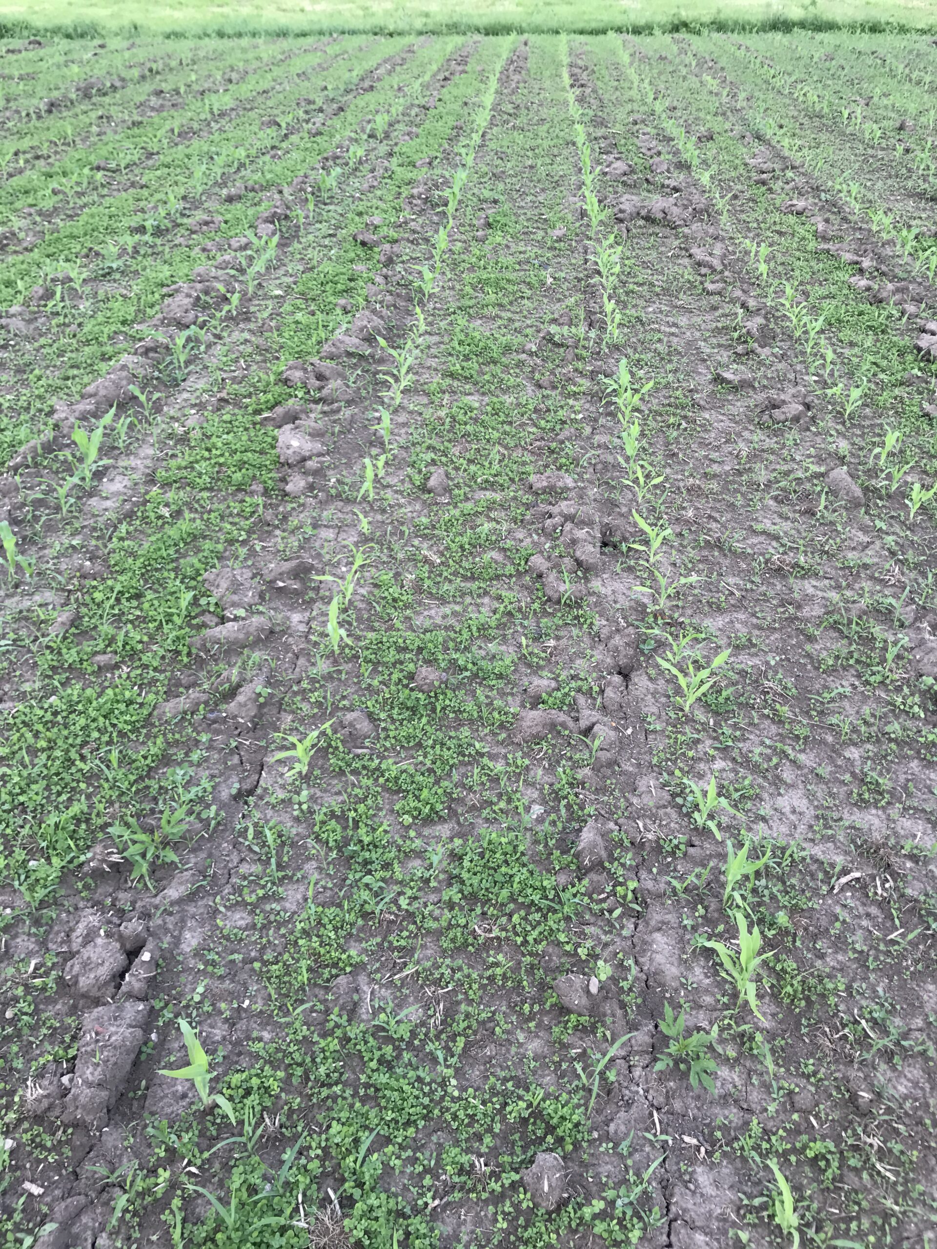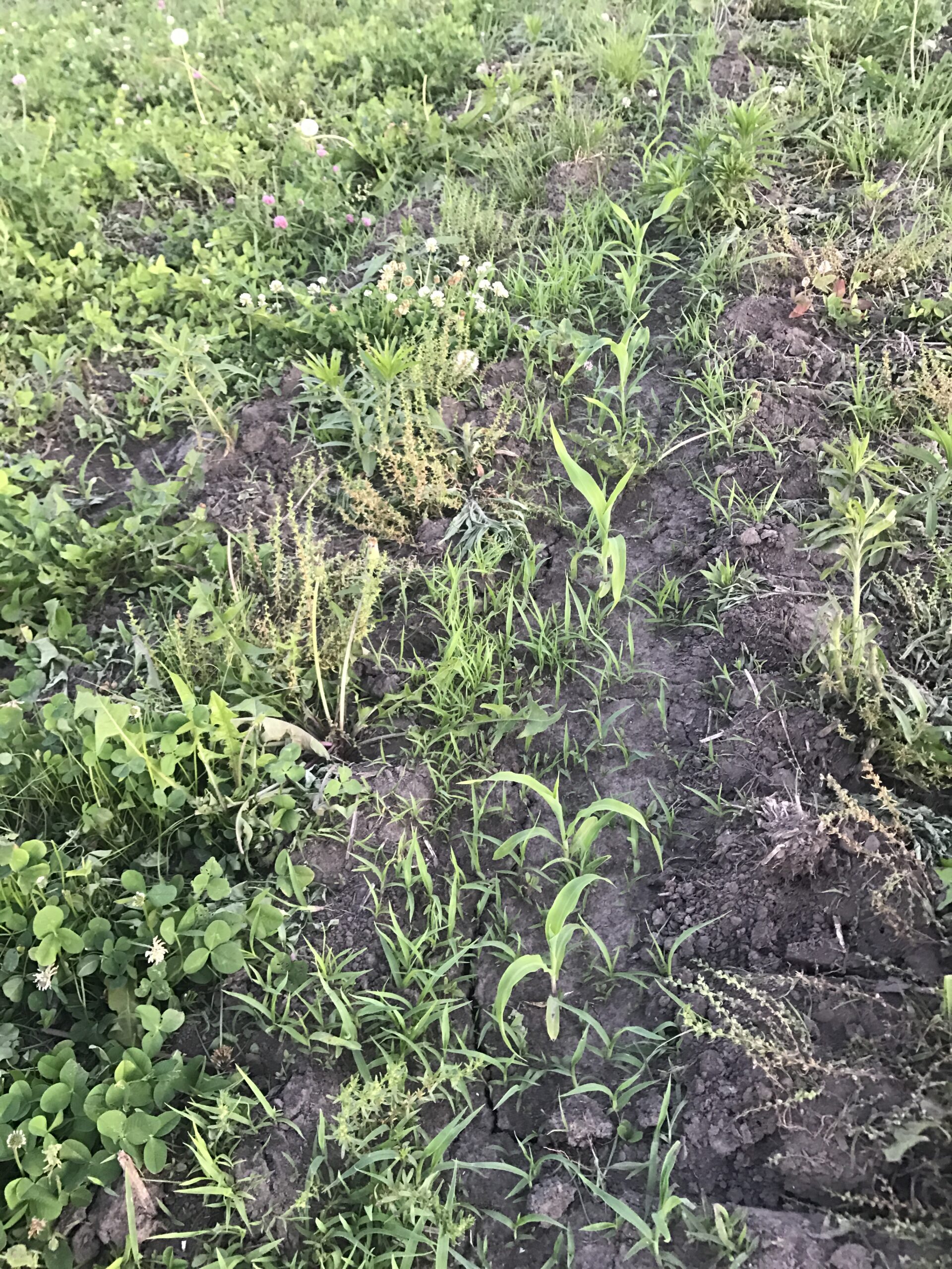c) Kura clover can grow 10-12 inches in a season (Dr. Kenneth Albrecht, personal communication, 2019), so I was counting on the Kura clover filling in. I was NOT counting on the tilled strips being ideal conditions for small-seeded annual weeds growing in bare, disturbed soil after a rain and before the corn emerged. The weed seeds quickly outgrew the Kura clover and took over the tilled strips.