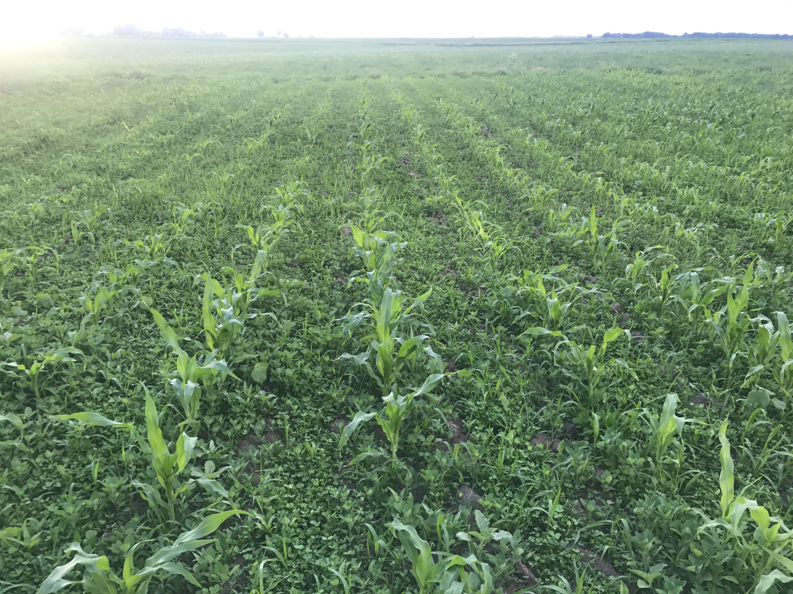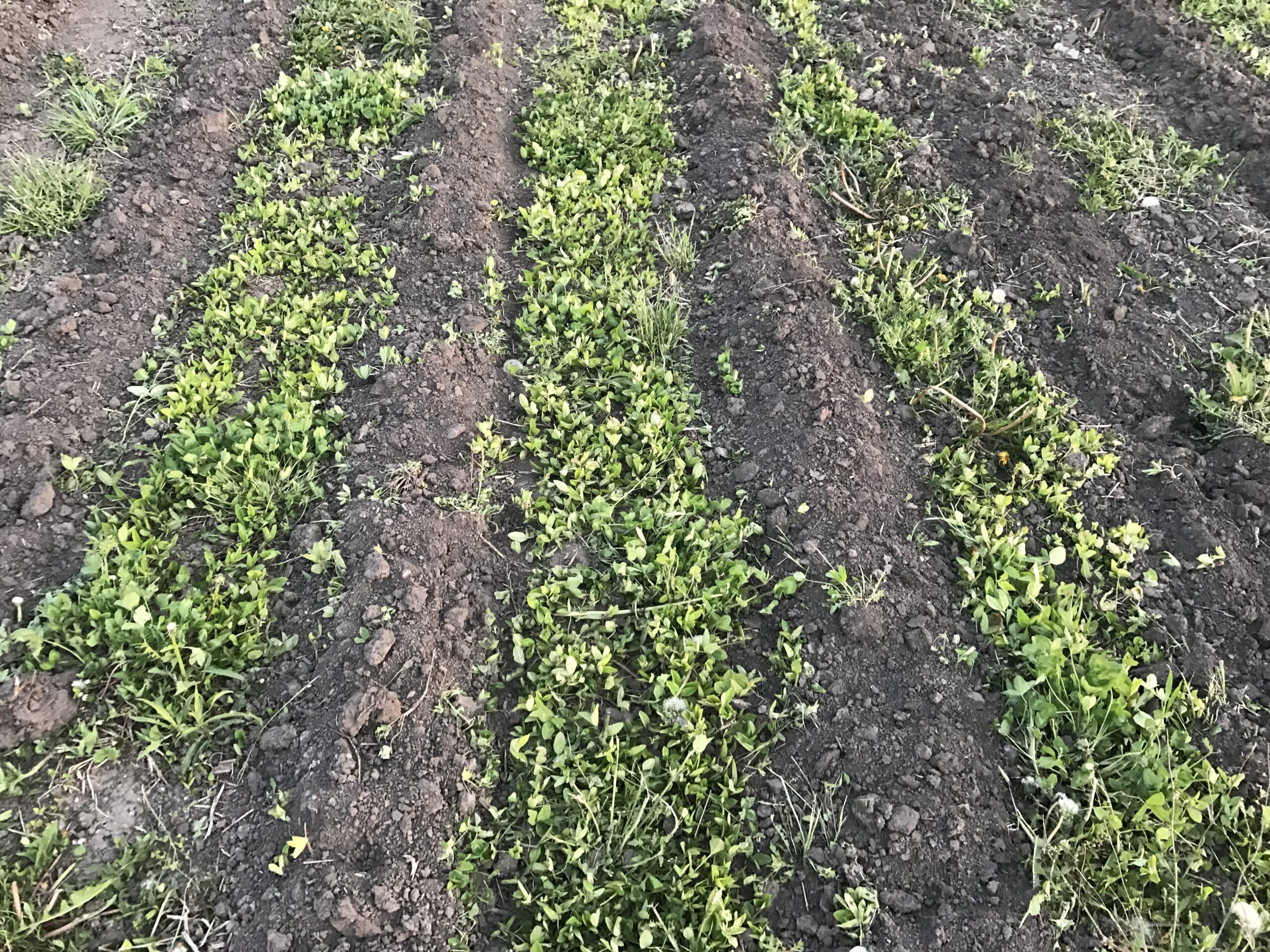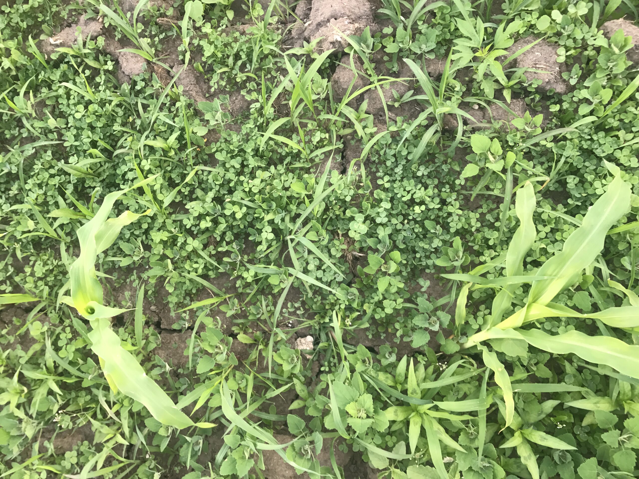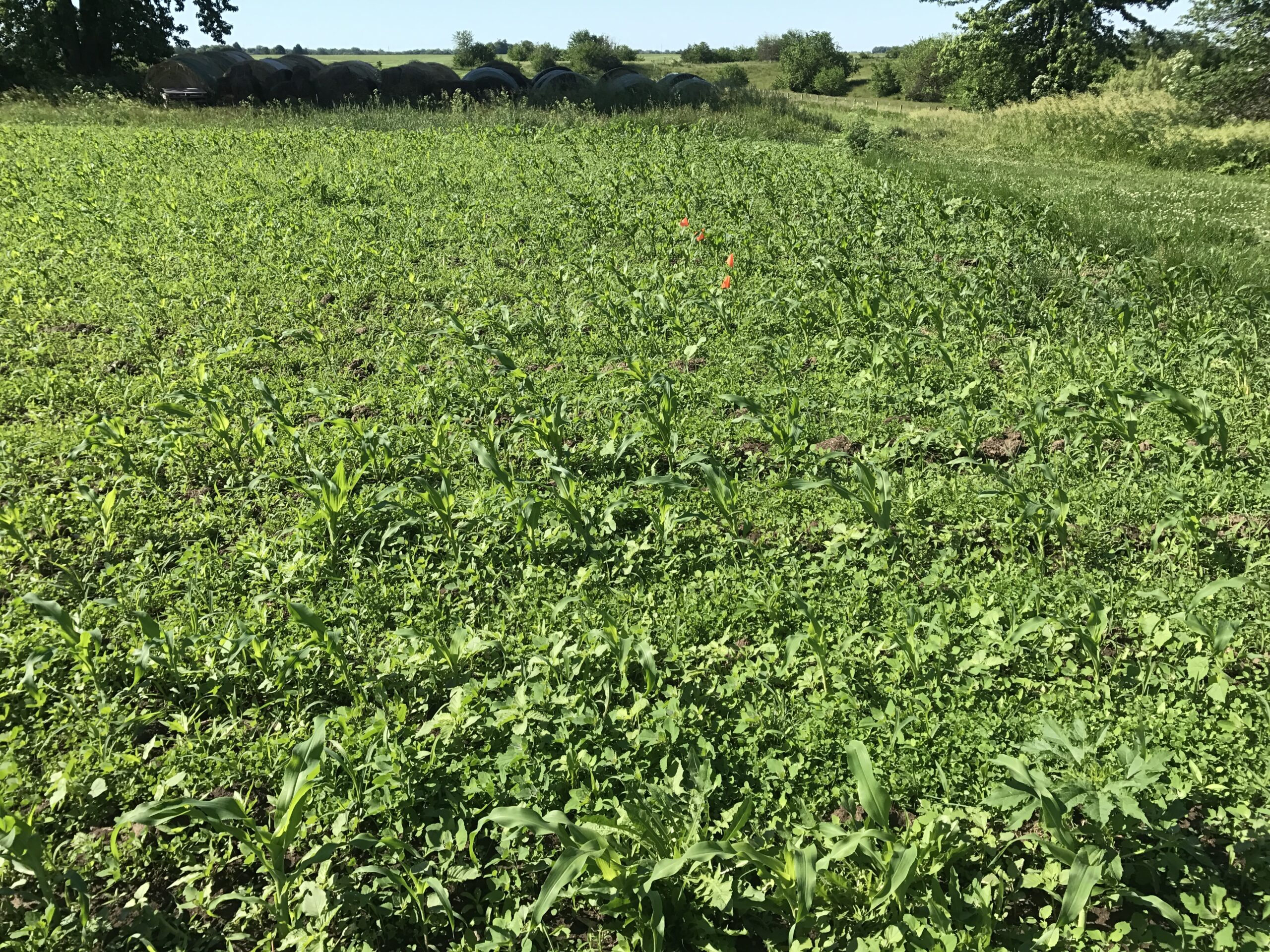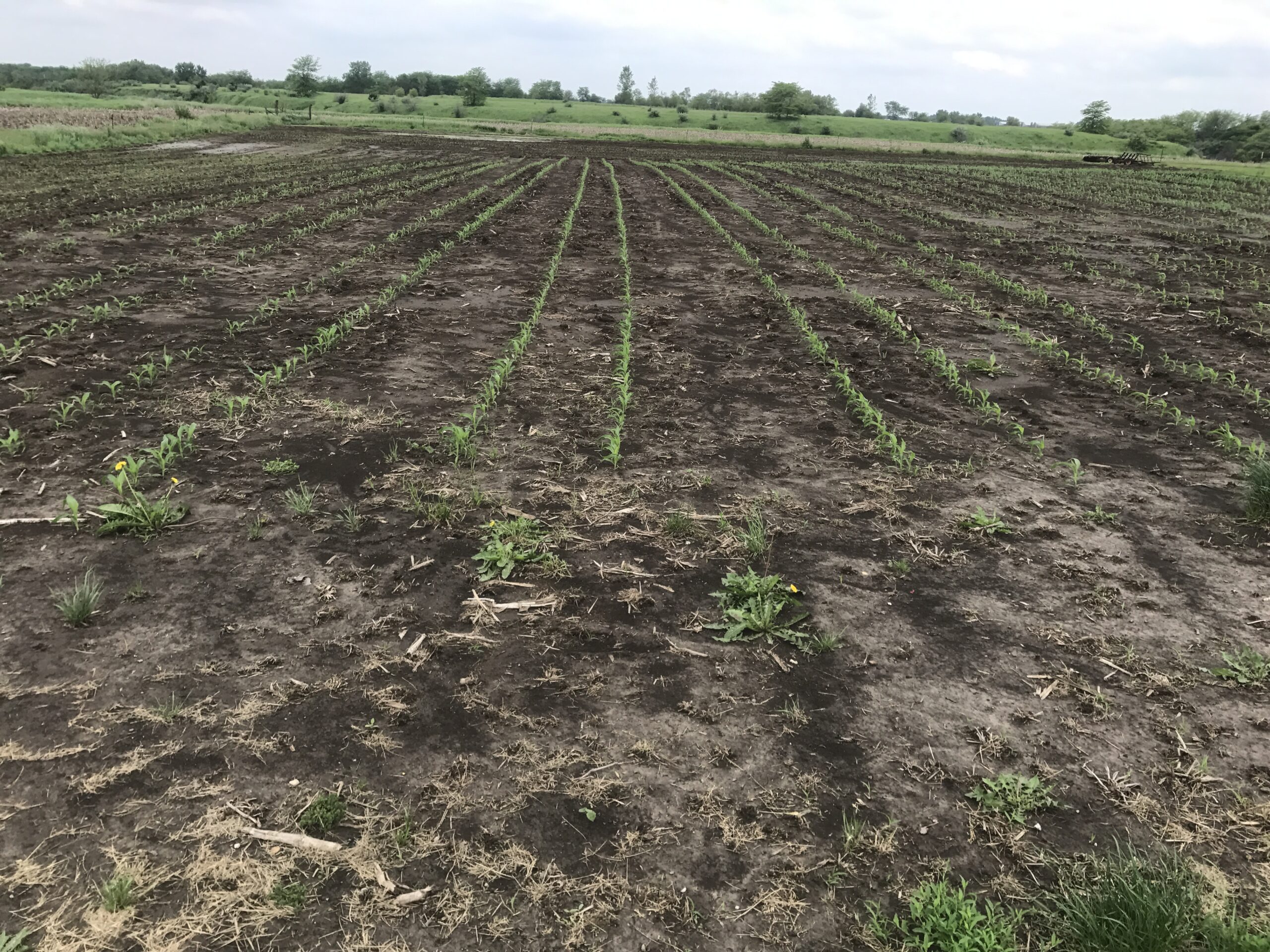 c) Kura clover can grow 10-12 inches in a season (Dr. Kenneth Albrecht, personal communication, 2019), so I was counting on the Kura clover filling in. I was NOT counting on the tilled strips being ideal conditions for small-seeded annual weeds growing in bare, disturbed soil after a rain and before the corn emerged. The weed seeds quickly outgrew the Kura clover and took over the tilled strips.