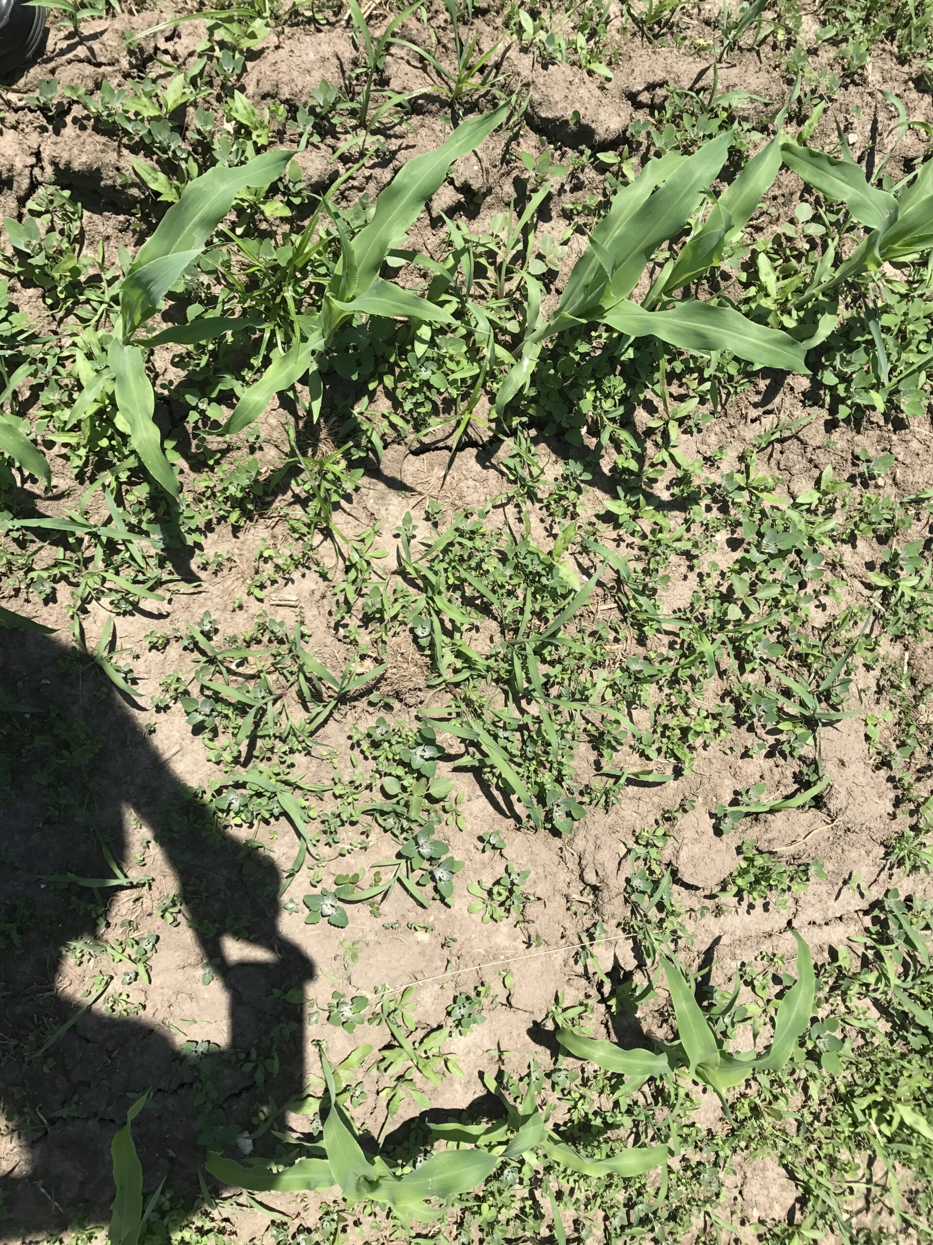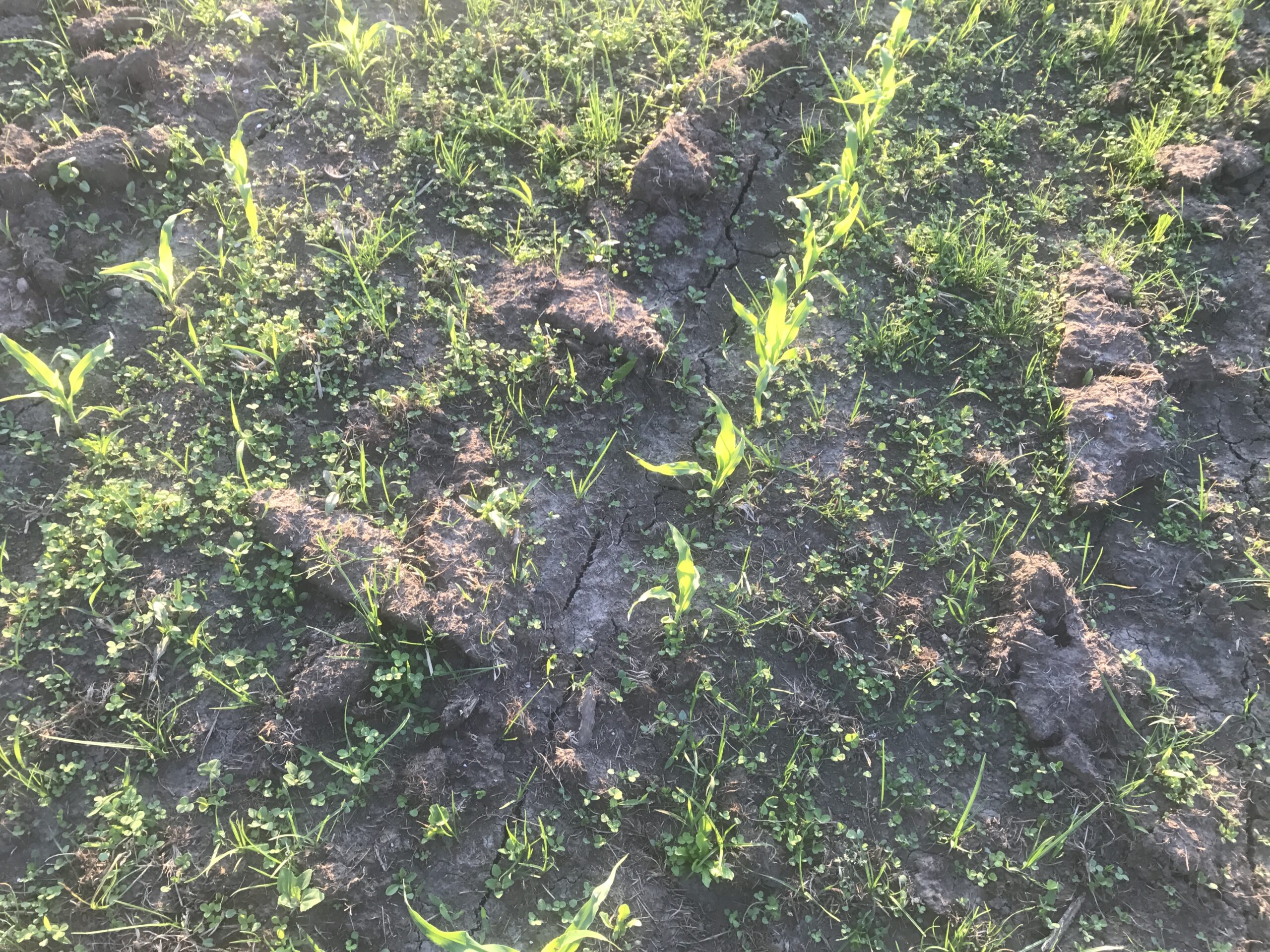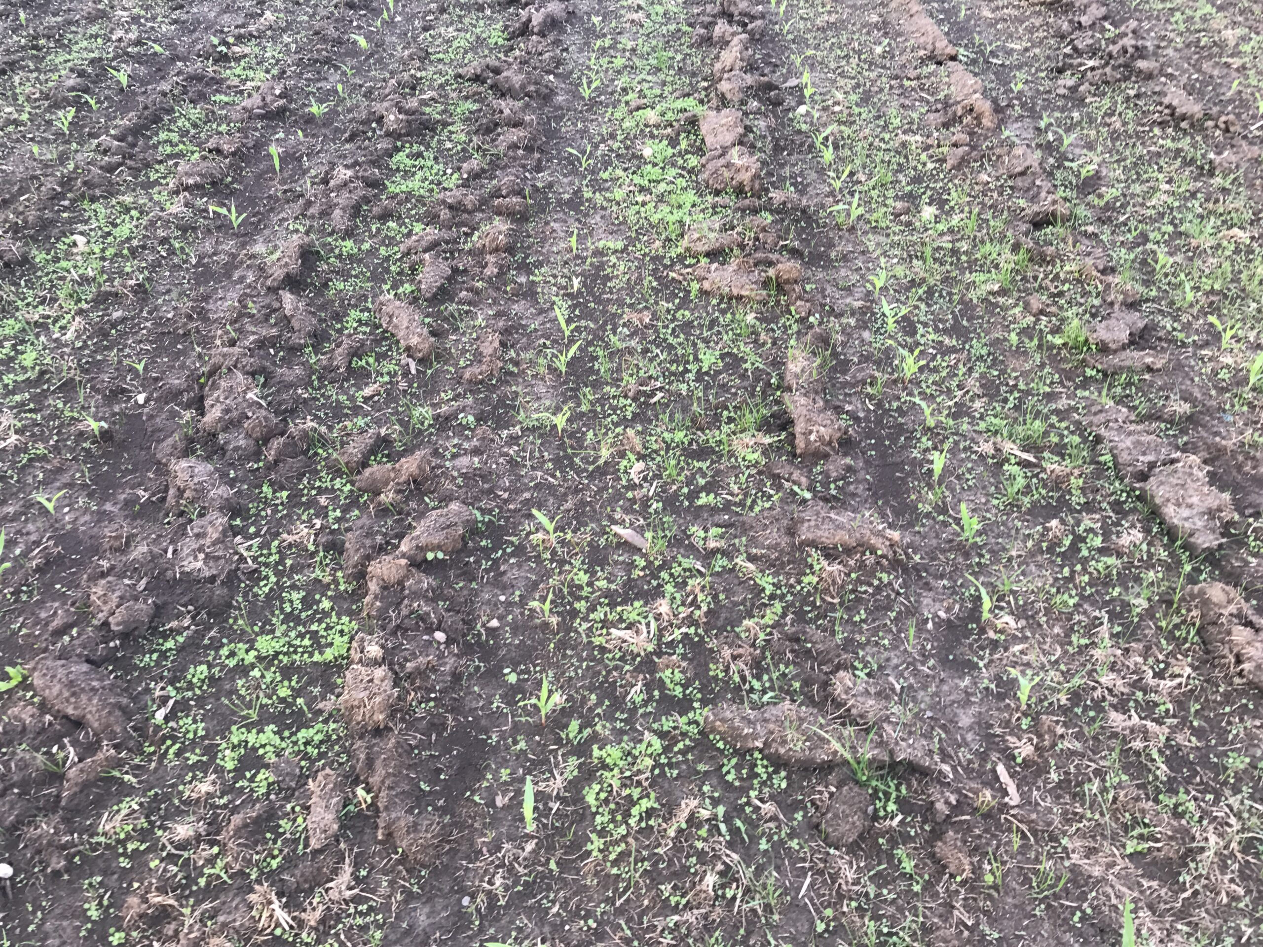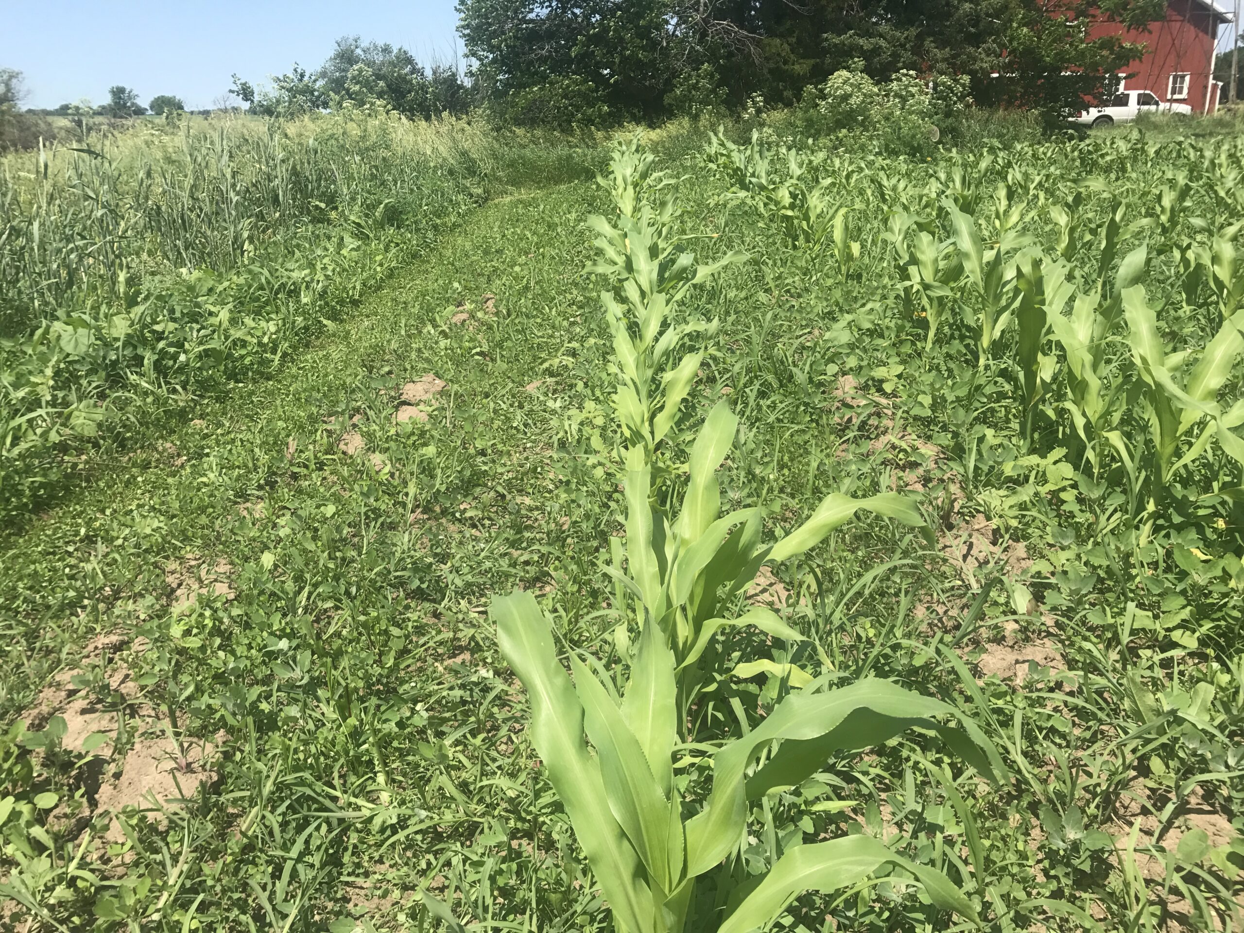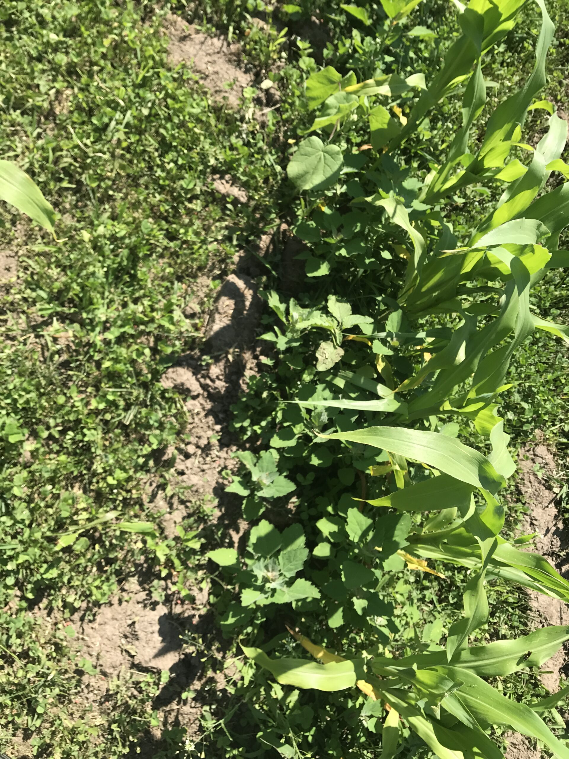 c) Kura clover can grow 10-12 inches in a season (Dr. Kenneth Albrecht, personal communication, 2019), so I was counting on the Kura clover filling in. I was NOT counting on the tilled strips being ideal conditions for small-seeded annual weeds growing in bare, disturbed soil after a rain and before the corn emerged. The weed seeds quickly outgrew the Kura clover and took over the tilled strips.