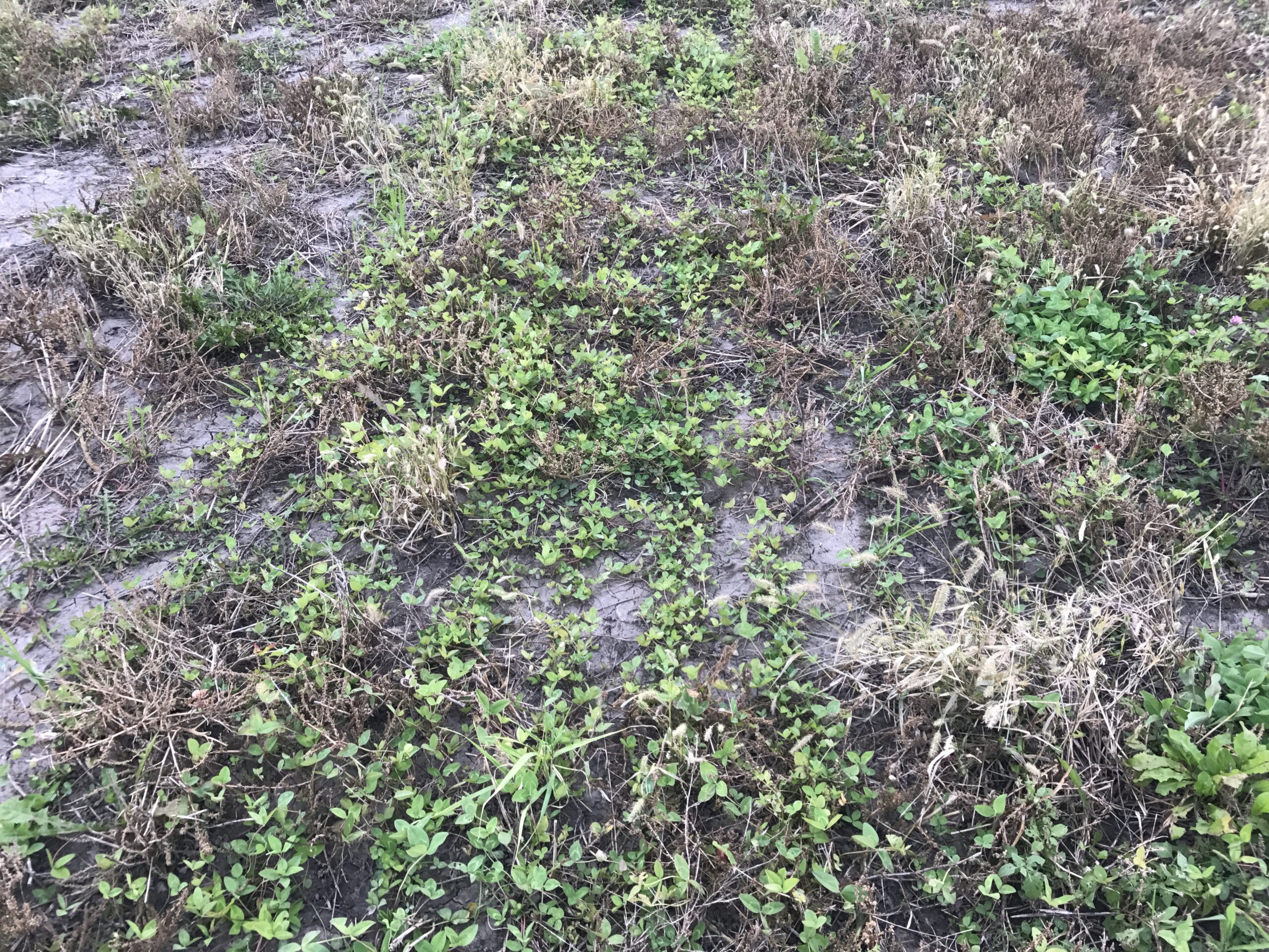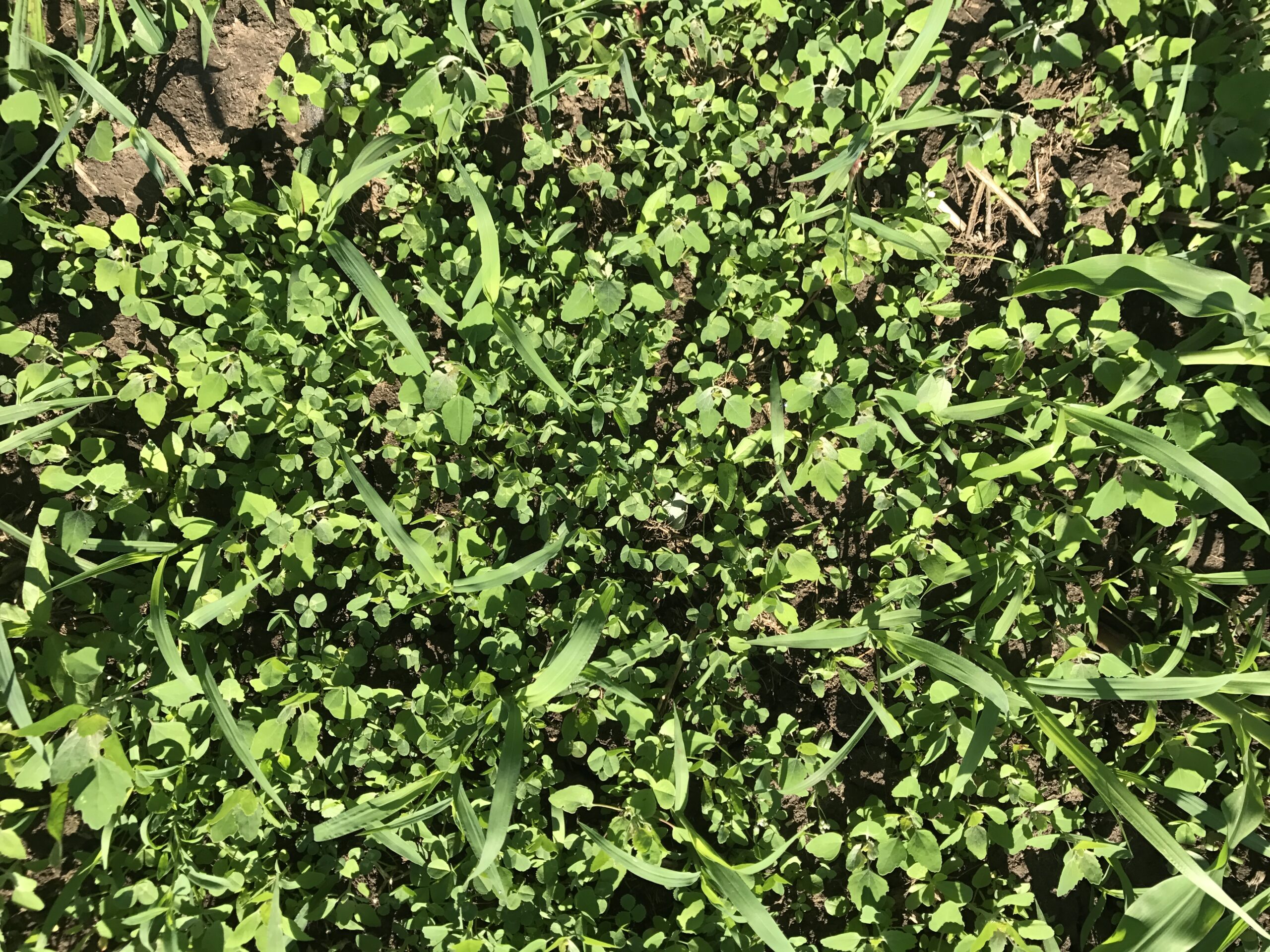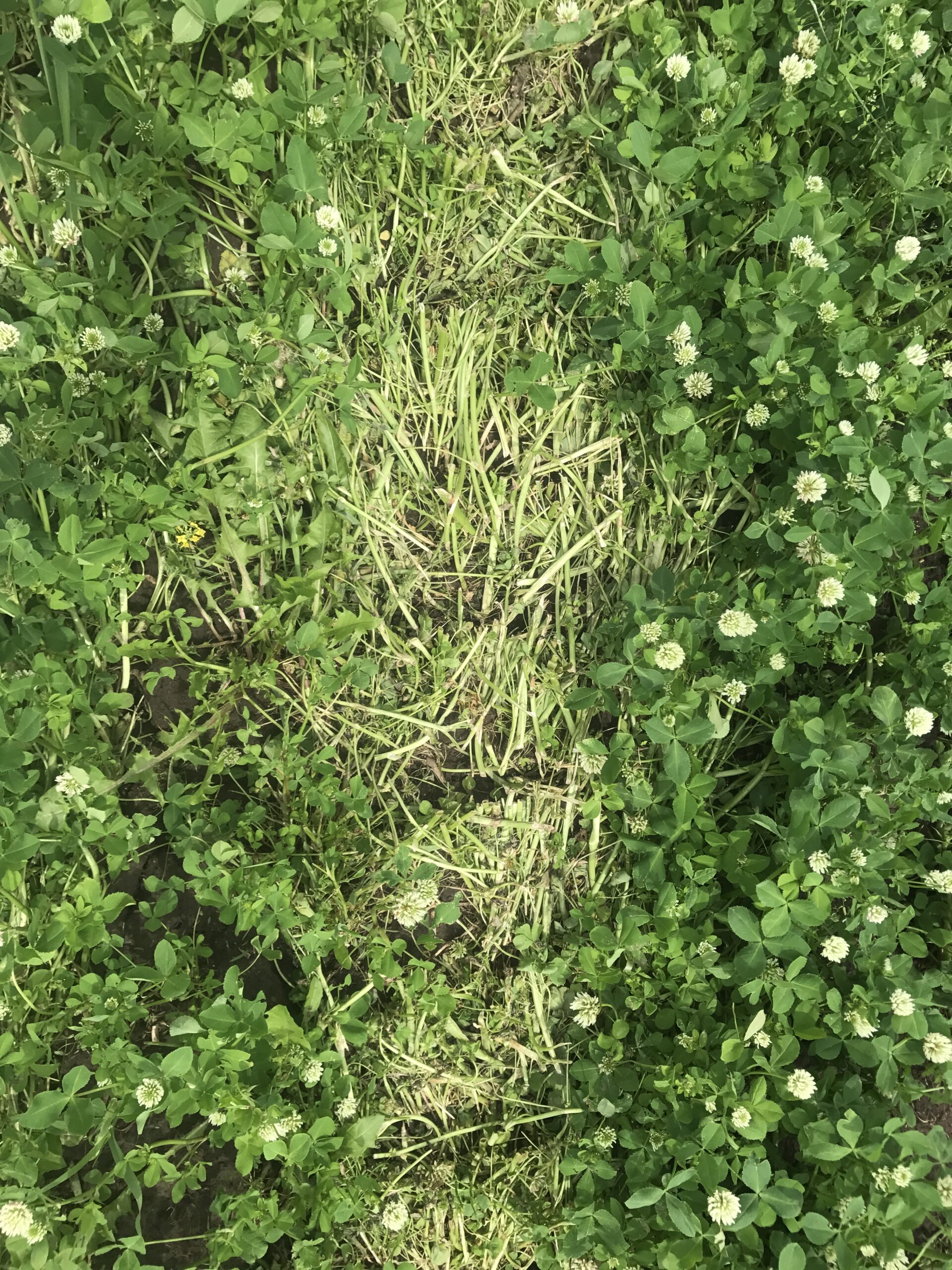 Under close inspection, note the presence of clover under the weed canopy and the uniform density of clover in certain areas after the weeds were mowed early.