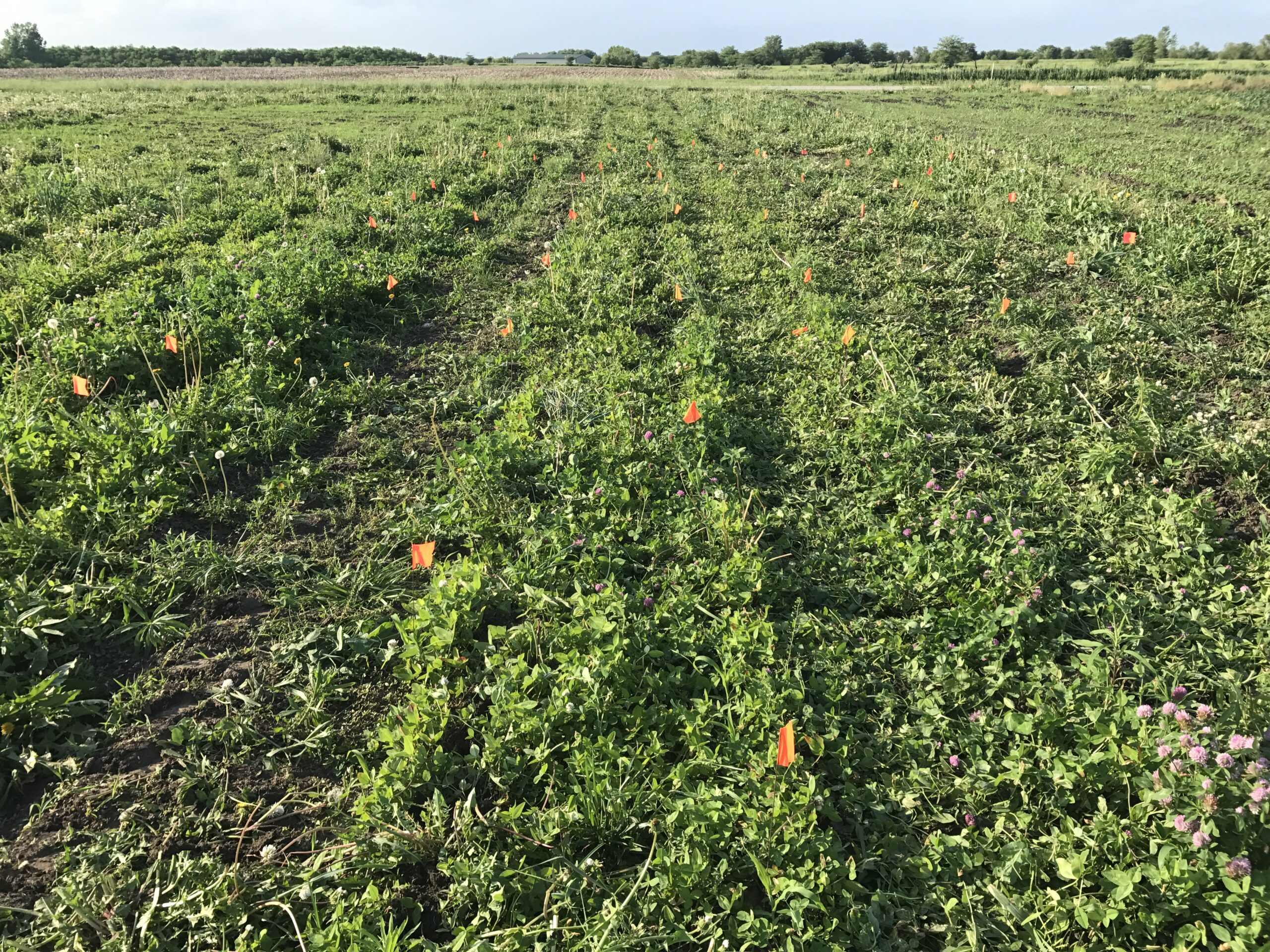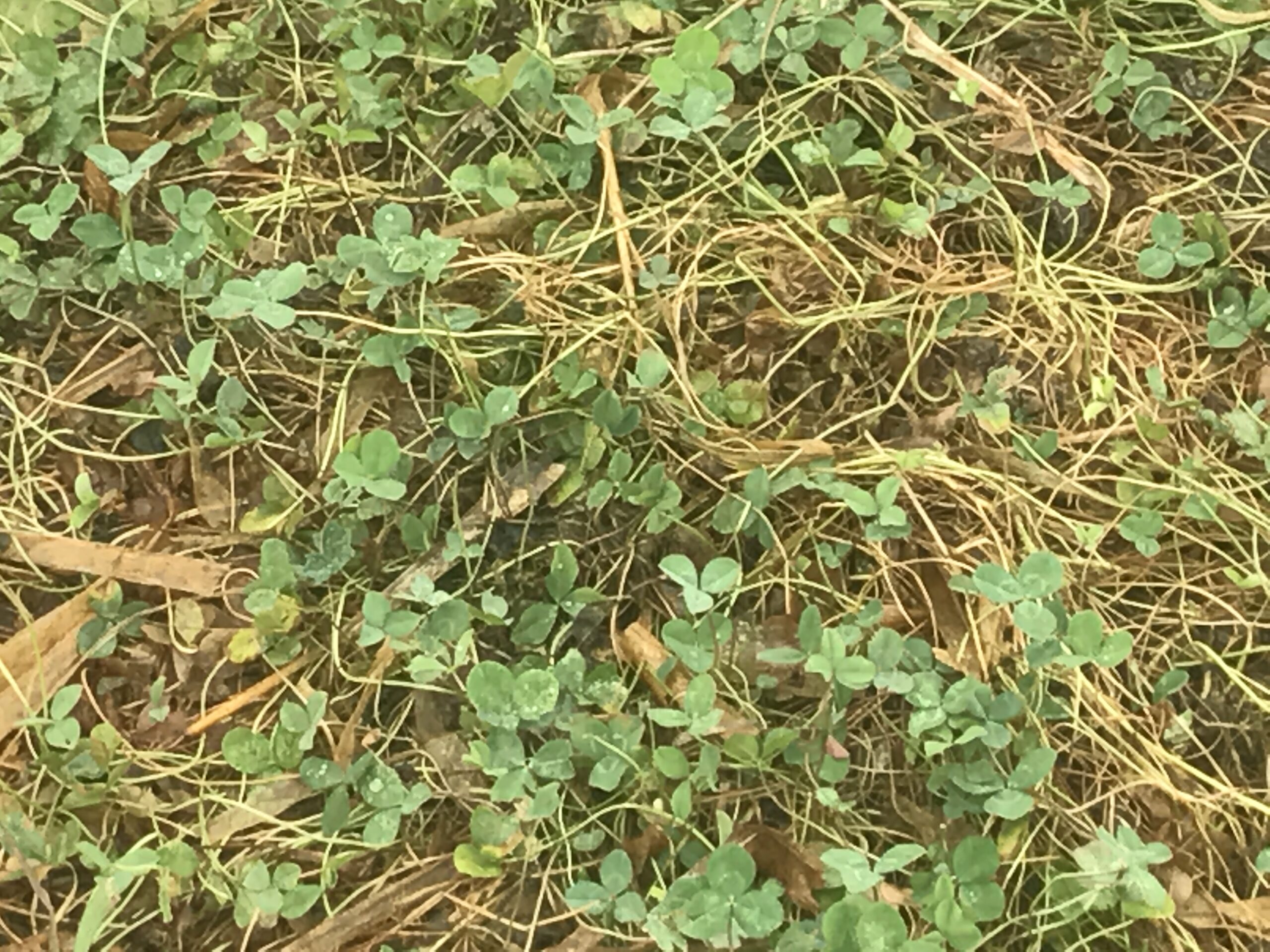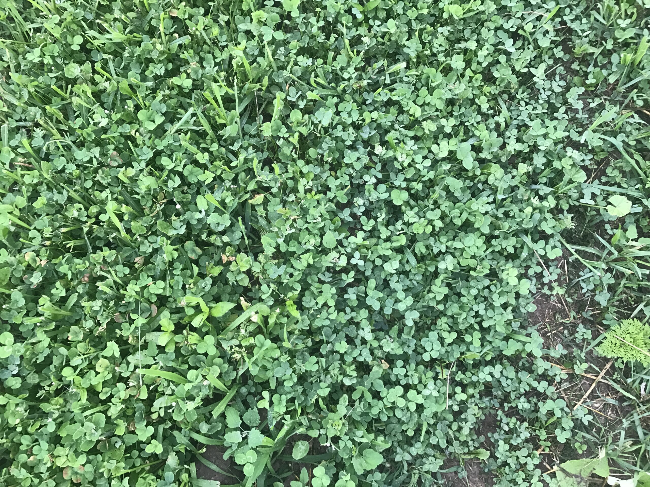 Under close inspection, note the presence of clover under the weed canopy and the uniform density of clover in certain areas after the weeds were mowed early.