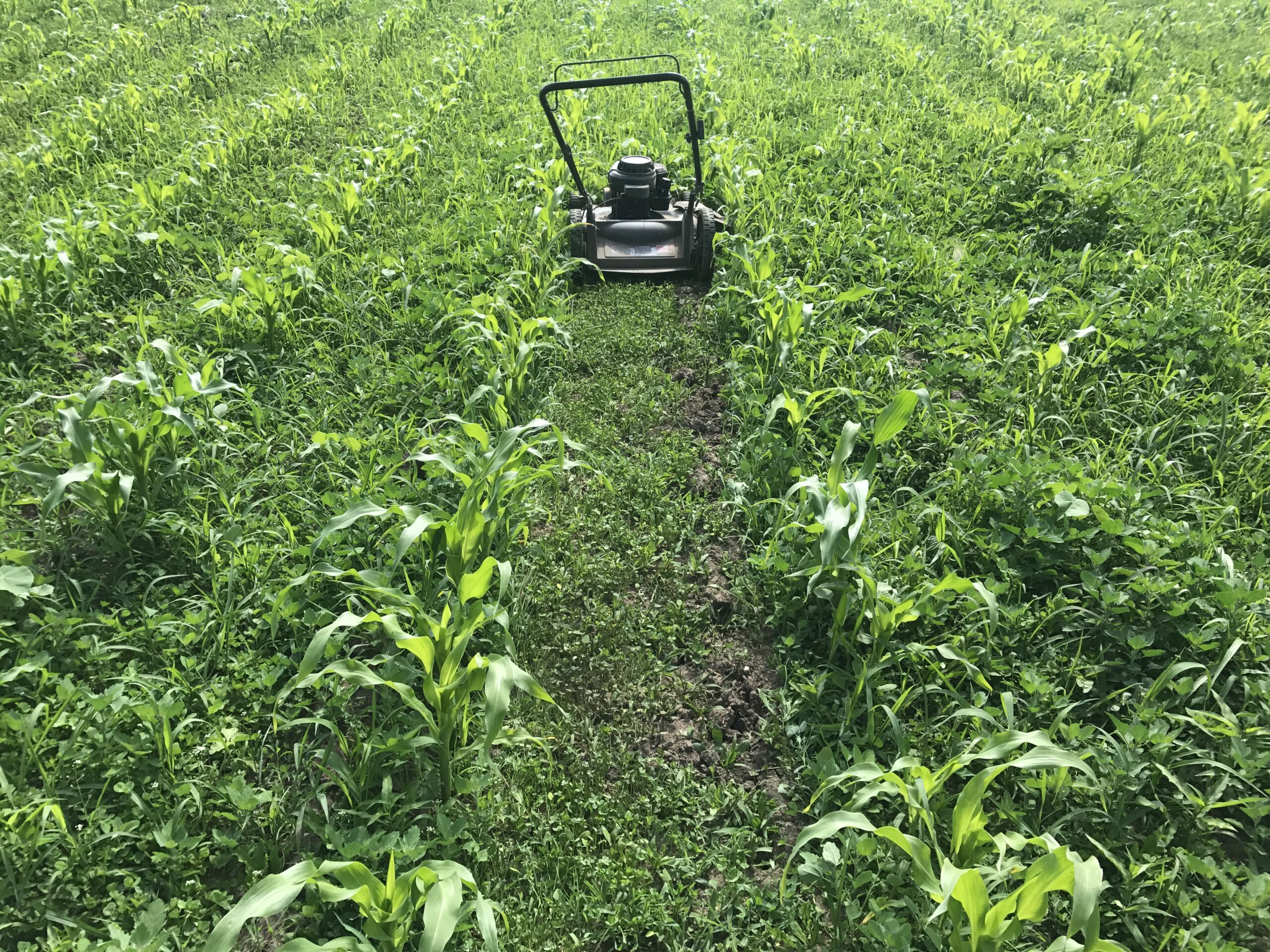 On June 14 I used my 42" riding mower on a few rows, taking out every other row in the 30-inch row spacing. I did this for a few rows in both the 2019 and 2020 plots. I set the mower at 3-inch cutting height and was able to get to within two to three inches from the corn row. This was closer than the crimper but still left many weeds in the row. A riding lawn mower is not designed for agricultural field work, and the rough cloddy soil surface damaged the mower deck and blades.
