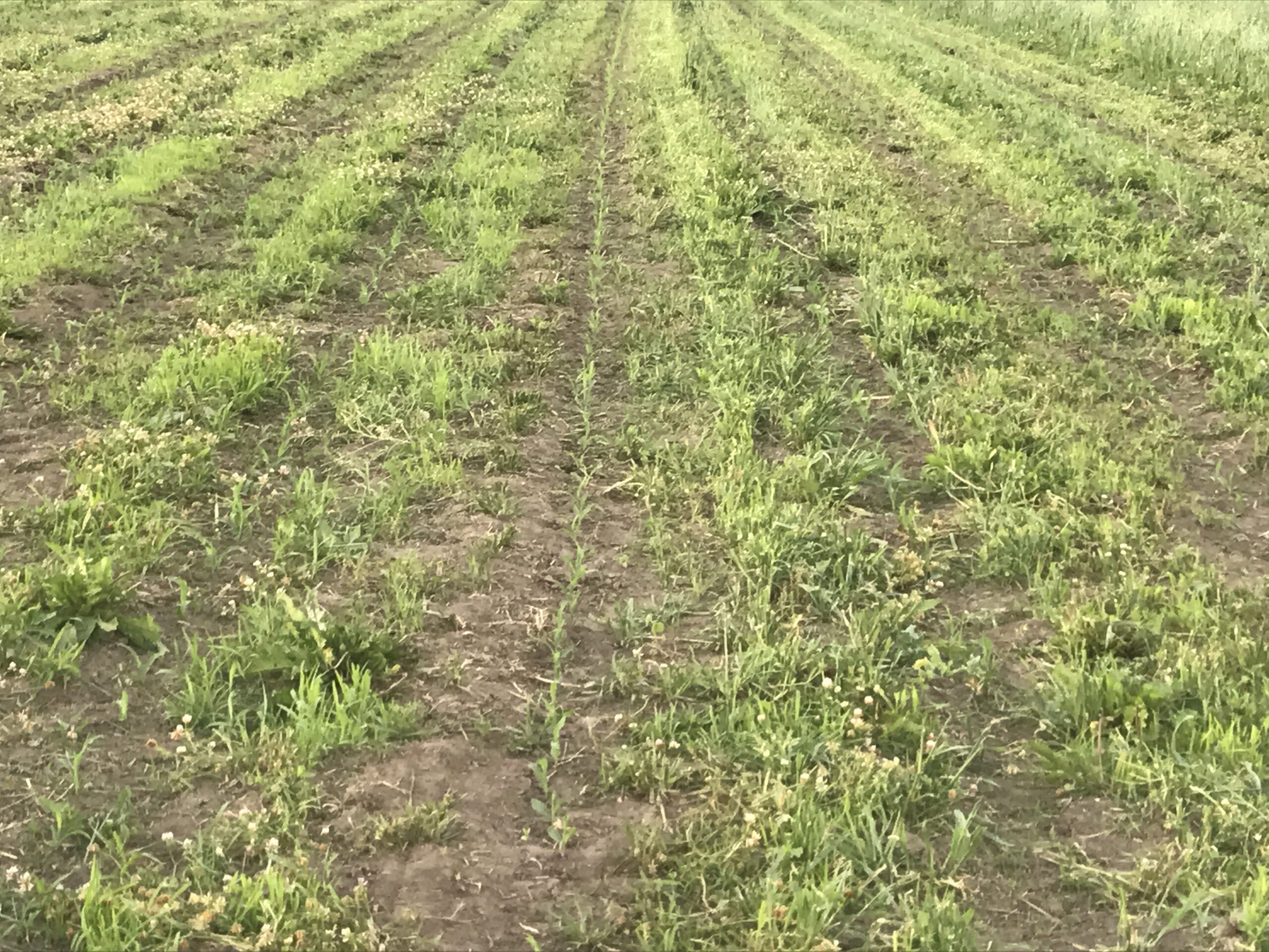 On May 9, the newly established Kura mix plot (hereafter referred to as the 2020 plot or stand) was strip-tilled into 8-inch strips on rows 30 inches apart with a Kuhn-Krause Gladiator 16-row strip tiller, using RTK-GPS guidance mounted to the tractor. Youngquist Ag Services of Cambridge, IL. provided this service free of charge, for which I am very grateful. Considering strip-tillers are not generally designed for strip-tilling into living plant or sod-like conditions, the result was very satisfactory. Youngquist admitted strip-tilling into a living mulch was a first for him. Soil conditions at the time of strip-tilling were ideal, leaving seedbed strips with good soil moisture and crumb. The emerged Kura mix did result in some heavy clodding and clumping due to the root systems of the clovers. A tine harrow could have smoothed out the clods and the soil surface, but I did not have access to one.