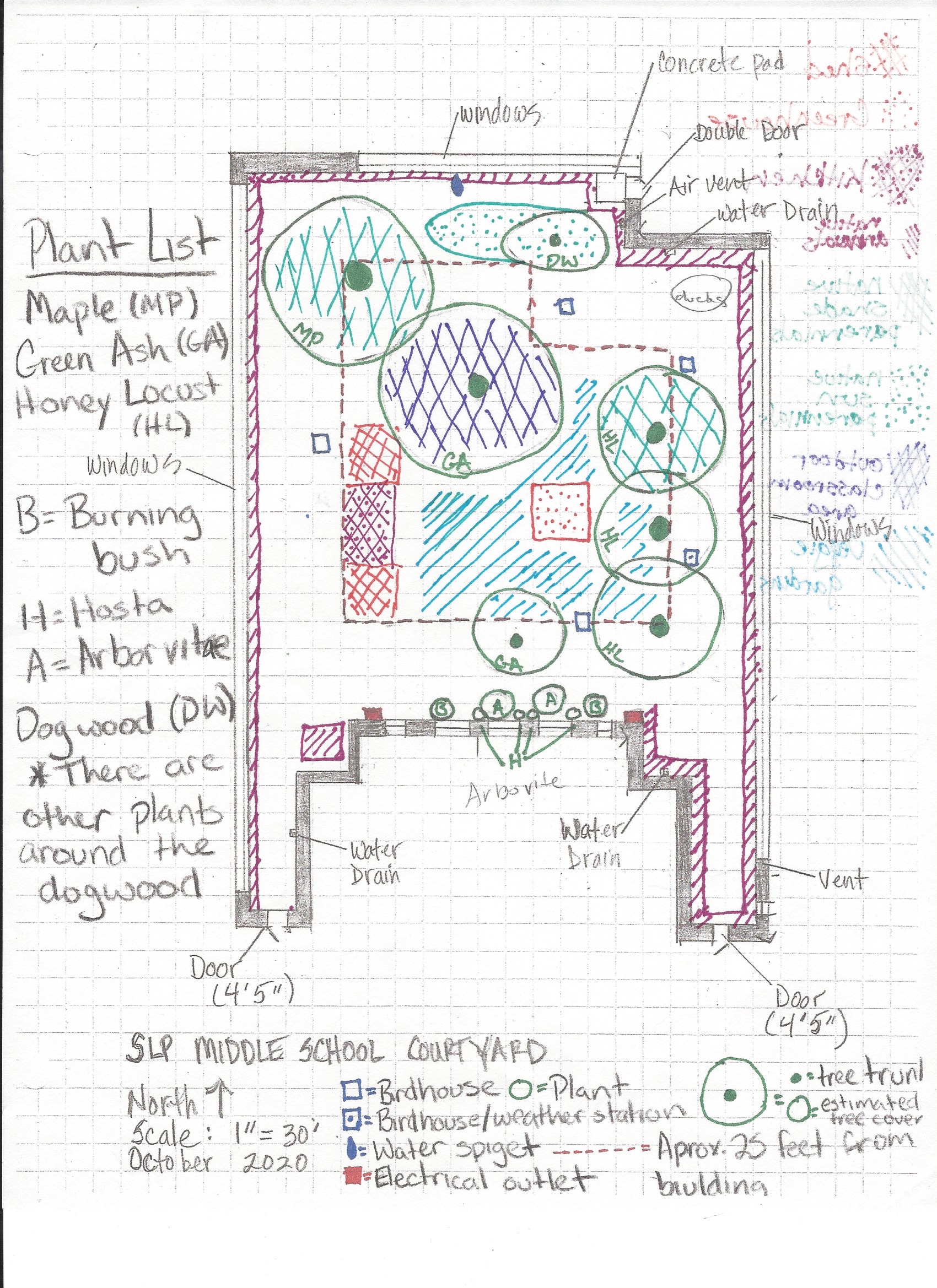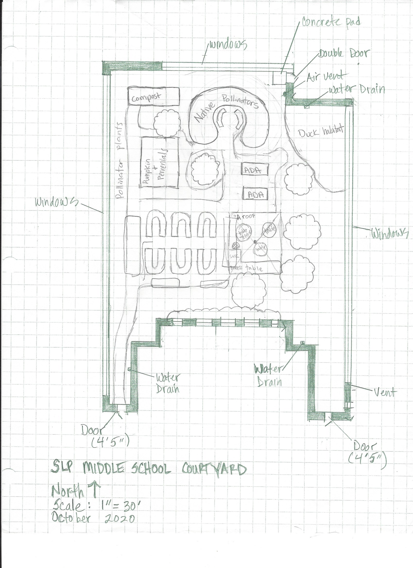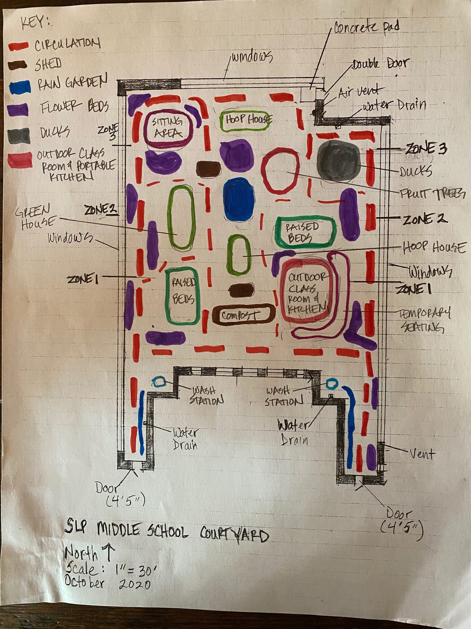 We achieved a well-planned design for the middle school courtyard, although just before the presentation we were told we would no longer have access to it due to Covid restrictions and public access issues. However, the graduates are already working on site evaluations with the school district and are prepared to create a new plan for the new chosen site.