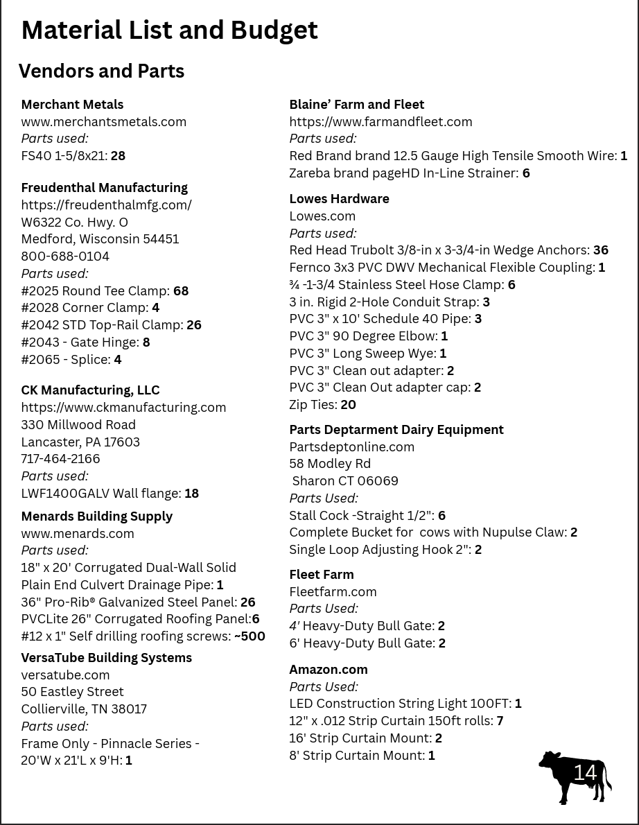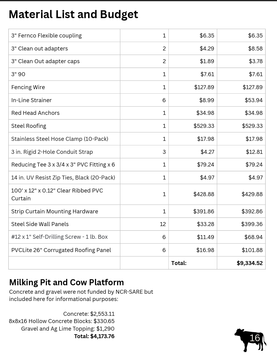Complete portability: In constructing the parlor we will document the time and cost required for each step, and these measurements will be documented in easy to understand tables in the guide. The result will be that the guide will allow the parlor to be assembled in a short time frame with a design that is completely portable. This allows the farmer to utilize rented land if needed.