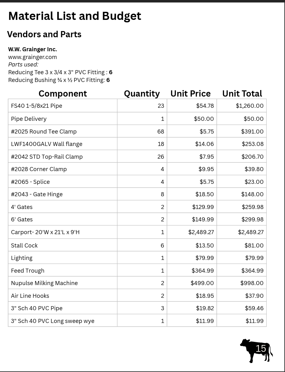 We started with conducting preliminary interviews and research on low cost milking parlors including their design and construction. We then created a budget and parts list keeping in mind in particular