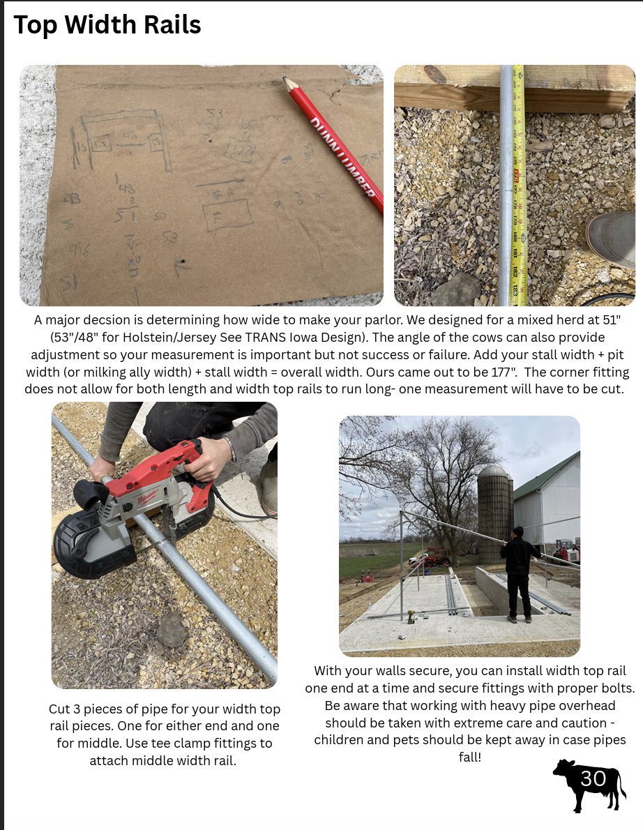 - Step-by-step directions, with photos (example below), for Cutting Pipe, Building Parlor Walls, Standing Walls Up, Making Rump and Kick Rails, Feed Trough and Support Frame, Anchoring to Foundation, Entry and Exit, Shelter, PVC Vacuum Line and Milking System, Lighting, and more