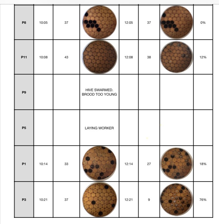 - Isolating breeder queens in timing boxes allowed for us to get a better understanding of the timeline and reaction of bees toward disease and infestations.