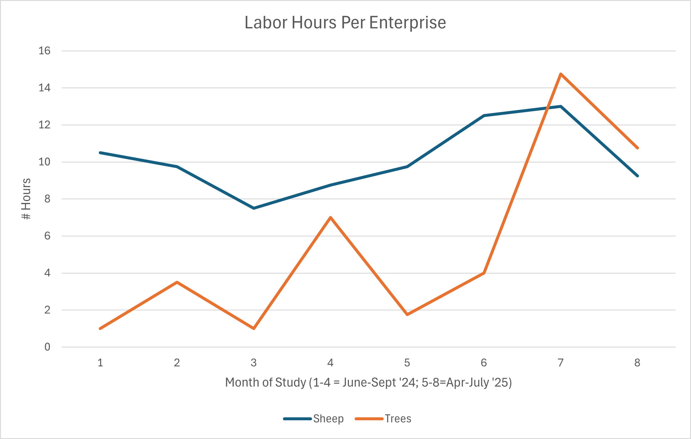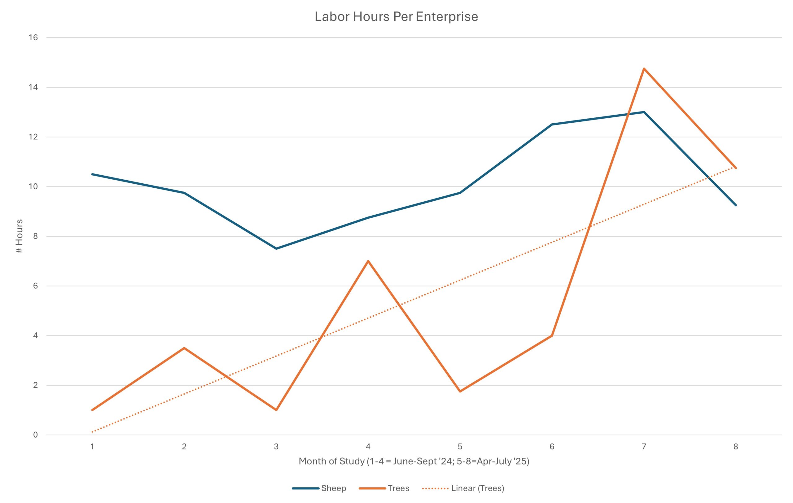 While sheep showed a higher number of hours for the first six months of the project, the sheep trend line showed a more gradual increase in labor hours. The sheep are in the tree patch in all types of weather, so labor hours stayed more even.