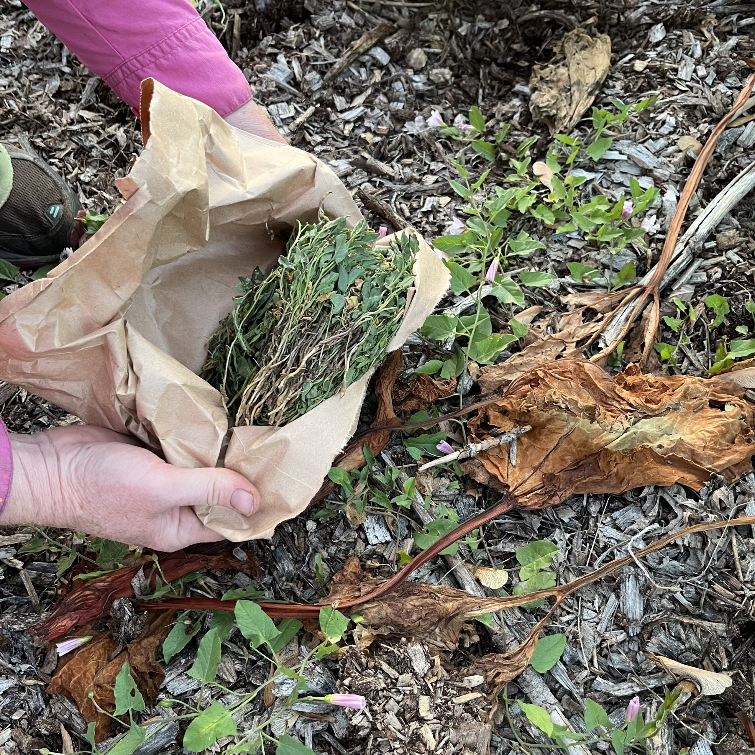 In the second test plot, we will install the mites in the garden. We will cut six inch stems of infested bindweed once a month in July-September in 2025 for mite dispersal; during 2026 we will disperse infested stems May-September. Stems will be taken to new bindweed plants within the test plot. We will wind that plant around the infested cut stem so the mites may begin their work on more bindweed. We will compare the efficiency of the two dispersal methods through recordkeeping.