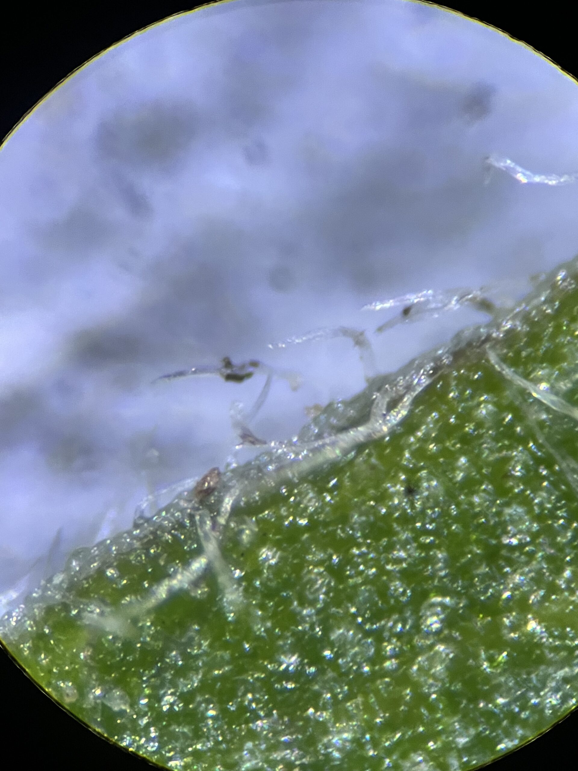 Unfortunately, the gall mites were slow to establish their first year. After months of not seeing any visible impact with the naked eye, we took samples from each release site and put them under a microscope earlier this fall. We reached out to our contact at the Palisade Insectary with a few photos, including these ones. They said to give the gall mites a little more time, and if they overwinter successfully, we should be able to see that visible impact by next spring/summer.