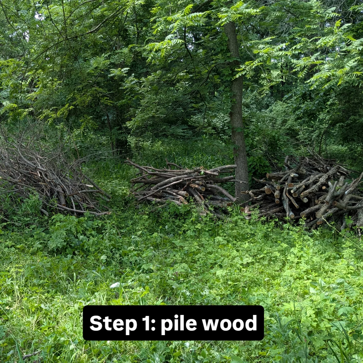 The thinning process left me with a lot of slash. Slash piles are rodent habitat, which could mean more nut predation. If left to burn or decompose, they would also release a substantial amount of carbon dioxide into the atmosphere. To solve these problems, I came up with an efficient way to turn the smaller branches (up to 5" diameter) into biochar. Biochar has useful properties as a soil amendment, including water and nutrient regulation. The carbon it contains is stable for long periods of time. I applied the biochar under the hickory trees. After the slash piles were taken care of, only the trunks and large branched remained. Many of these were left cross-slope to decompose, provide insect habitat, and help prevent erosion. Some were cut and used for firewood.