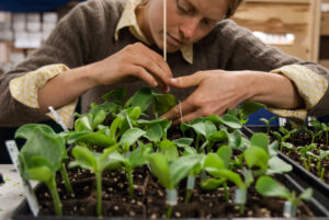 First, with a slanting cut, remove the rootstock’s apical bud, one of its cotyledons and half of its stem one quarter inch below the cotyledon. All that will remain on the rootstock is a single cotyledon and no apical bud. Tuck the rootstock cotyledon in the compost. Second, with a slanting cut, remove the scion’s apical bud, one of its cotyledons and halt of its stem one quarter inch below the cotyledon, just as you did with the rootstock. Third, align the slanting, corresponding cuts on the rootstock and scion and affix a clip to the union. Label your graft with combination (rootstock x scion) and date.