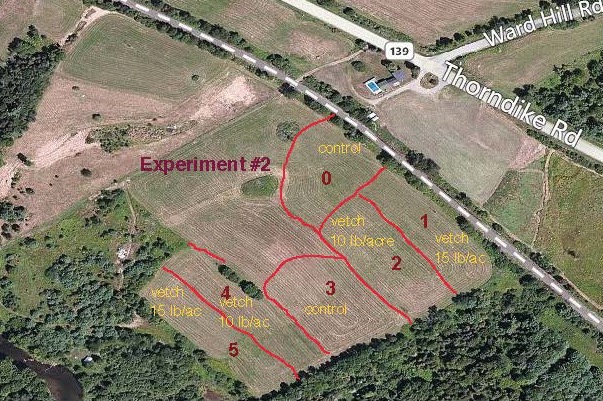 On September 20, 2016 we marked out the fields for the corn/vetch trial and took baseline soil samples. The fields were divided into two similar halves (one upland and one lowland), and then again in thirds. Each sample field is about 1.75 acres in size. Tree flags were marked to identify the plots and a diagram was made. Winter rye was planted uniformly at 75 lb/acre across the entire area. Vetch was planted at 10 lb/acre on one pair of thirds and at 15 lb/acre on another pair. The final third of each field was left as the control.