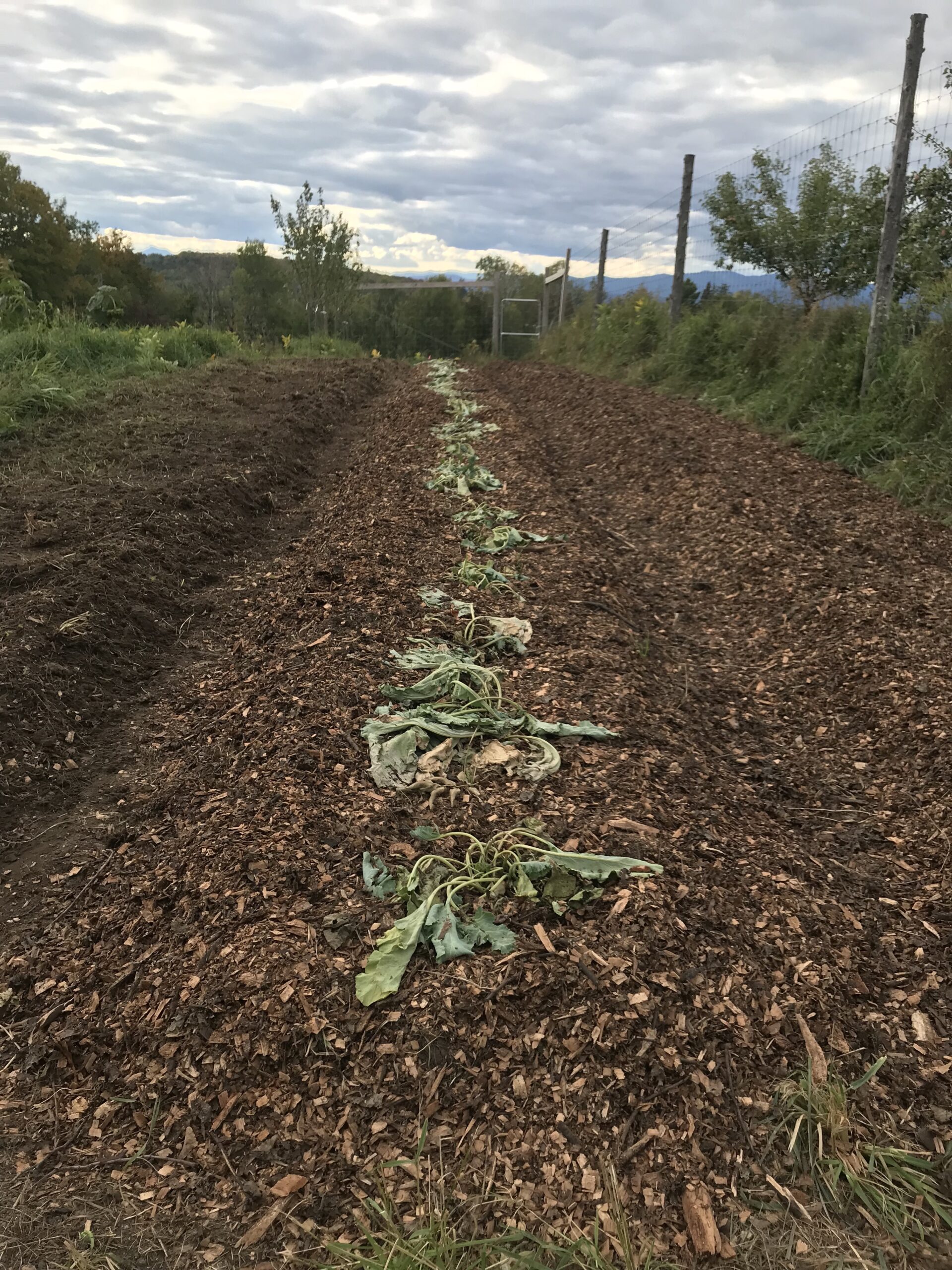 - Plastic mulch removed completely prior to maintenance day by John during late Summer because there isn’t room to hinge mulch back further (as done in Polyculture Orchard plot) due to proximity to adjacent rows of plants here.