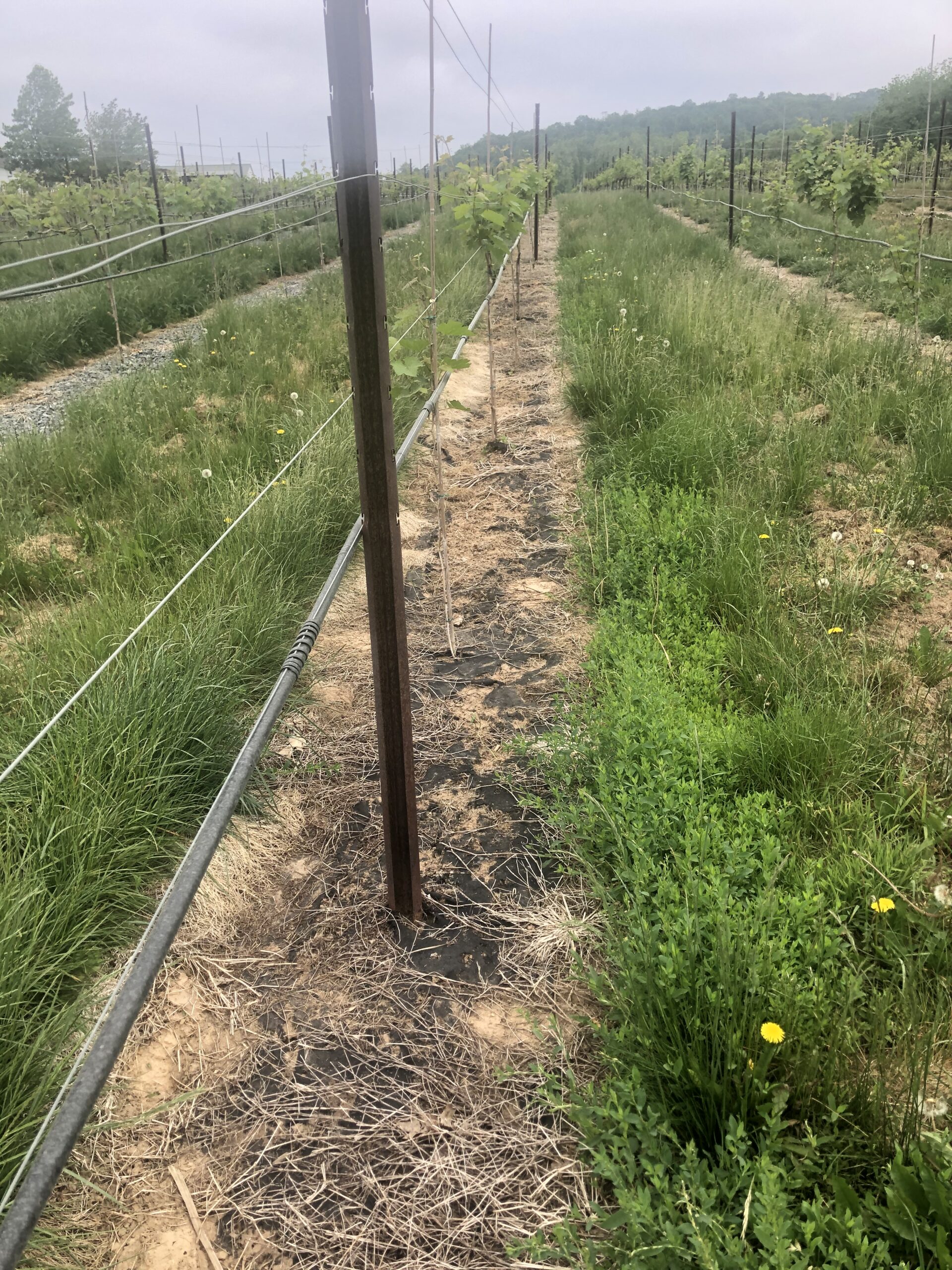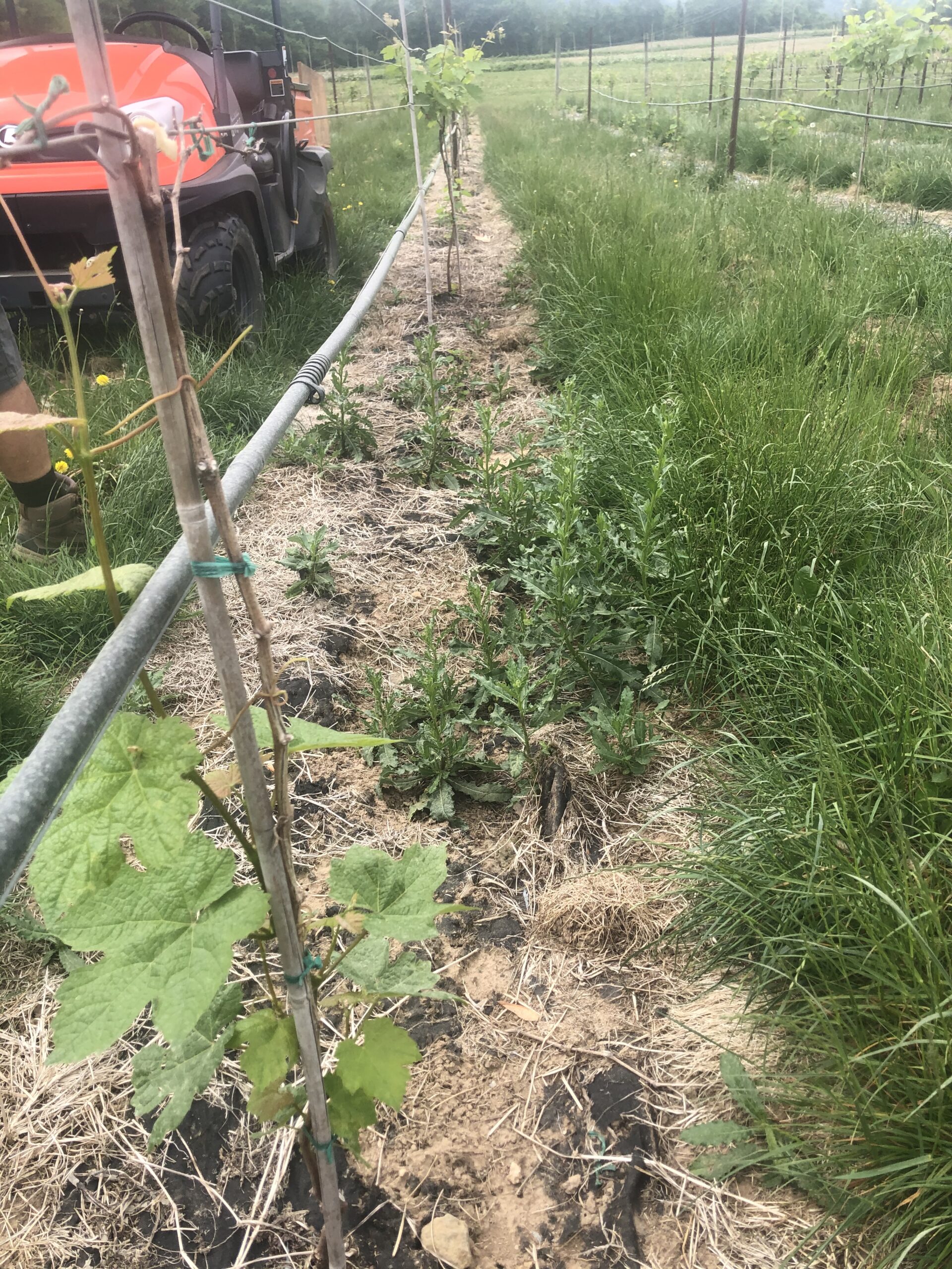 We will test 4 types of mulch combined with 2 different OMRI herbicides (8 different combinations) and compare to conventional synthetic herbicides. The test will be conducted with two rows each of the four different mulches (gravel, chopped straw, landscape fabric, wood chips/sawdust), (8 rows total). One row of each mulch type will be tested with test herbicide 1 and the other two with test herbicide 2. The remaining vineyard rows will be sprayed with our current selection of herbicides; Prowl, a pre-emergent for grasses, Chateau, a pre-emergent for broad-leaf weeds, and Cheetah, a burn-down herbicide.
