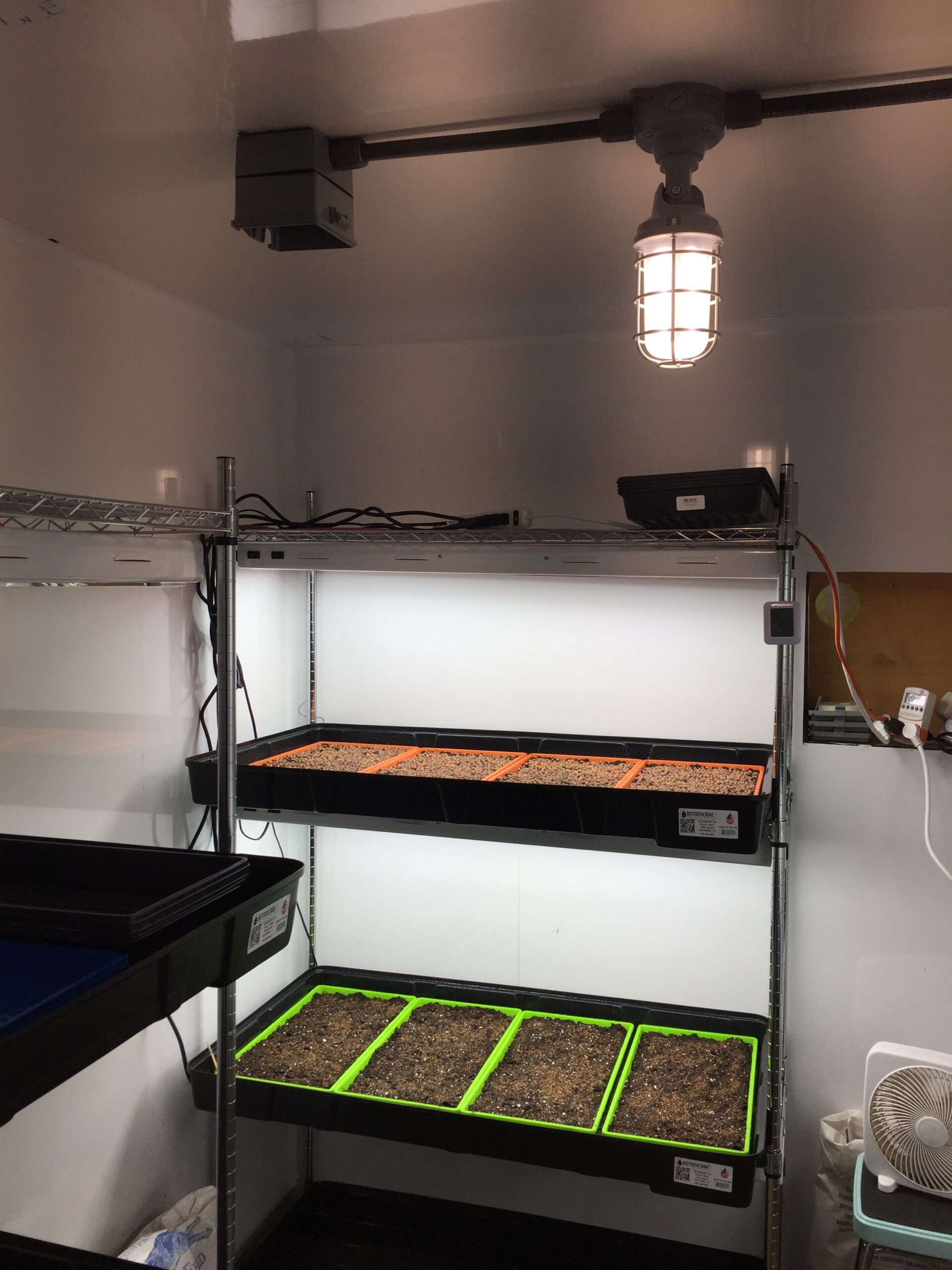 We aimed to modify a cold storage room originally developed for use with a CoolBot in the warmer months, into a grow room to produce a variety of microgreens and pea shoots. Through this research, we determined that the modified cold storage room is excellent at maintaining heat and allowed for efficient production of three microgreen varieties, as well as one variety of pea shoots. The super insulated room was kept warm with a small ceramic heater and heat emitted by the fluorescent lights. Additional heating with mats was not required. However, when the room is set at max capacity, with all lights running, temperatures reached well above the set range of 75-78 F / 23-25.5 C.
