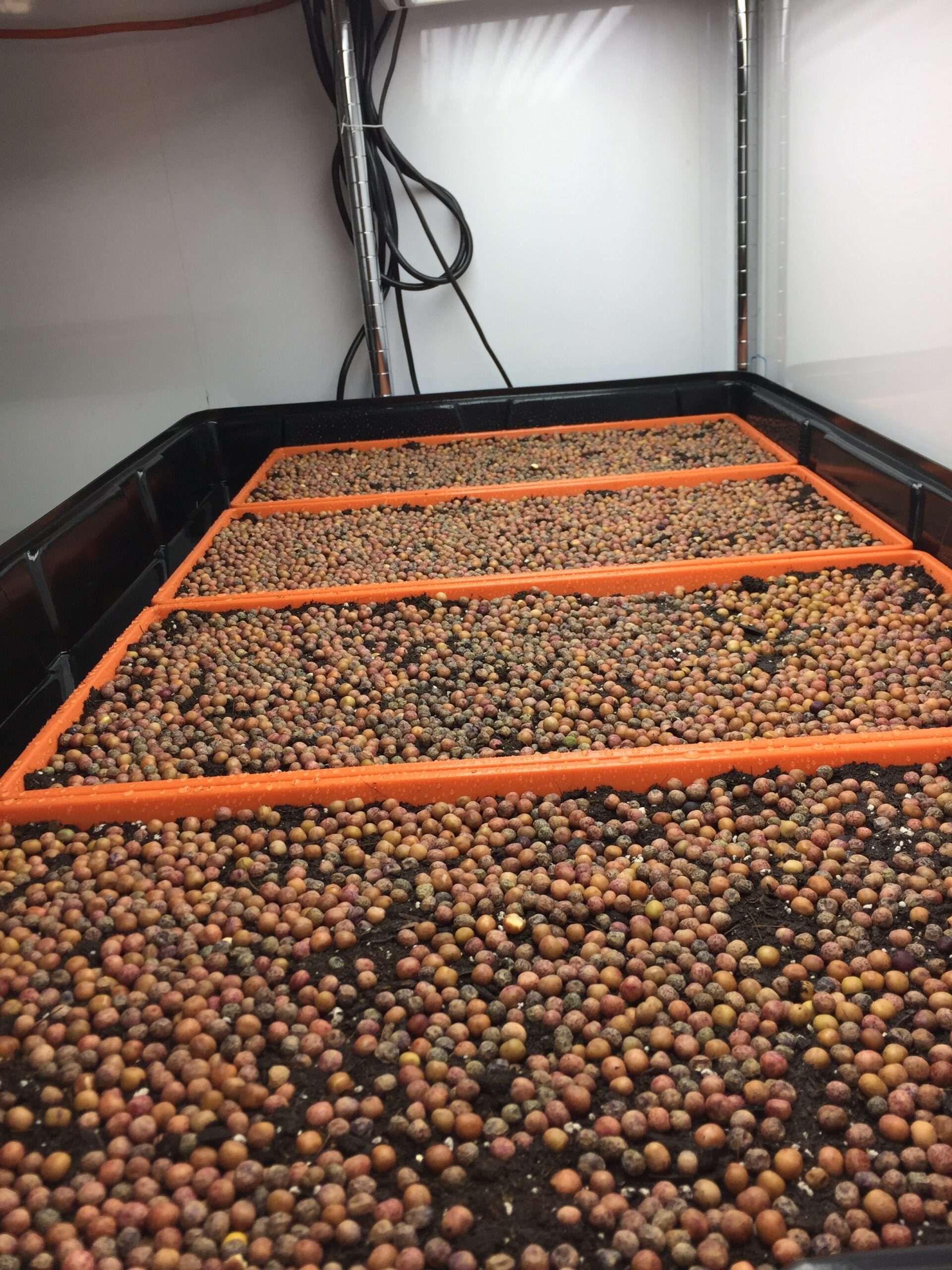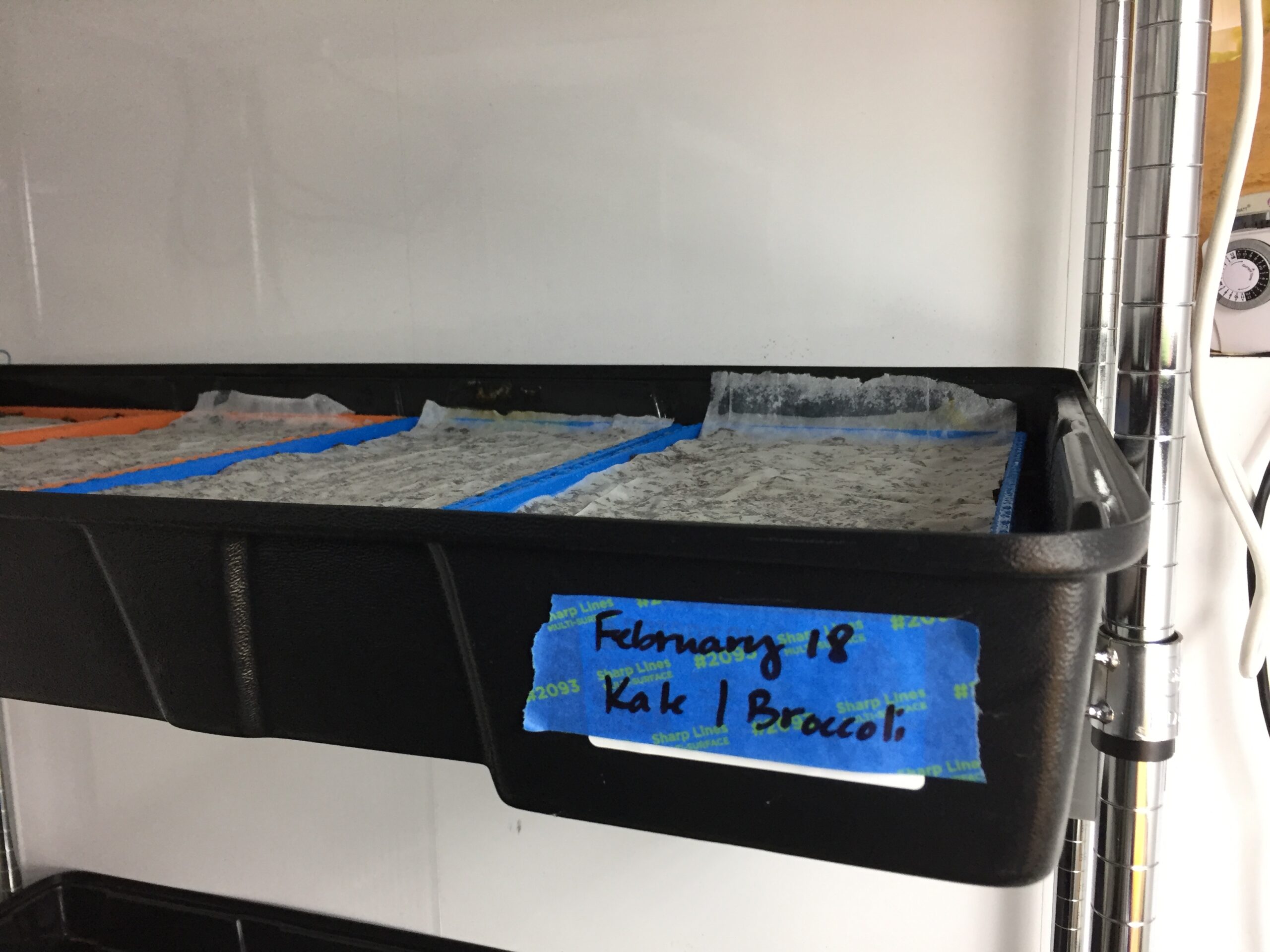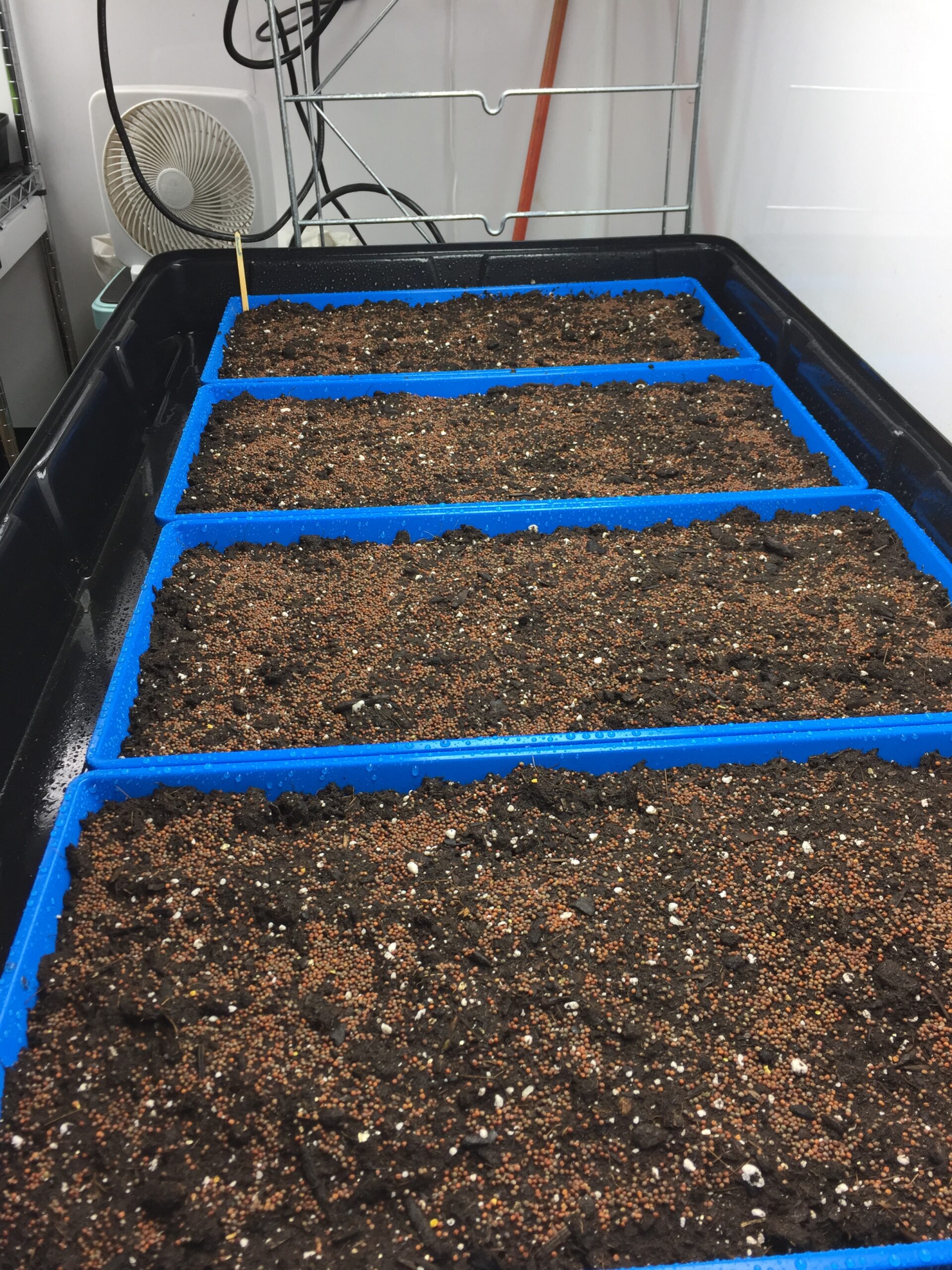 At the start, we experienced issues with uneven watering. Although the Botanicare trays measured as level, water seemed to pool, soaking some trays and leaving dry patches in others. We resolved this issue by cutting 10”x20” sheets of row cover (Agribon) to place on the surface of the microgreen trays. This allowed us to water with a sprayer (top down), the cover holding moisture against the seeds. The cover was removed after germination and we switched to bottom watering.