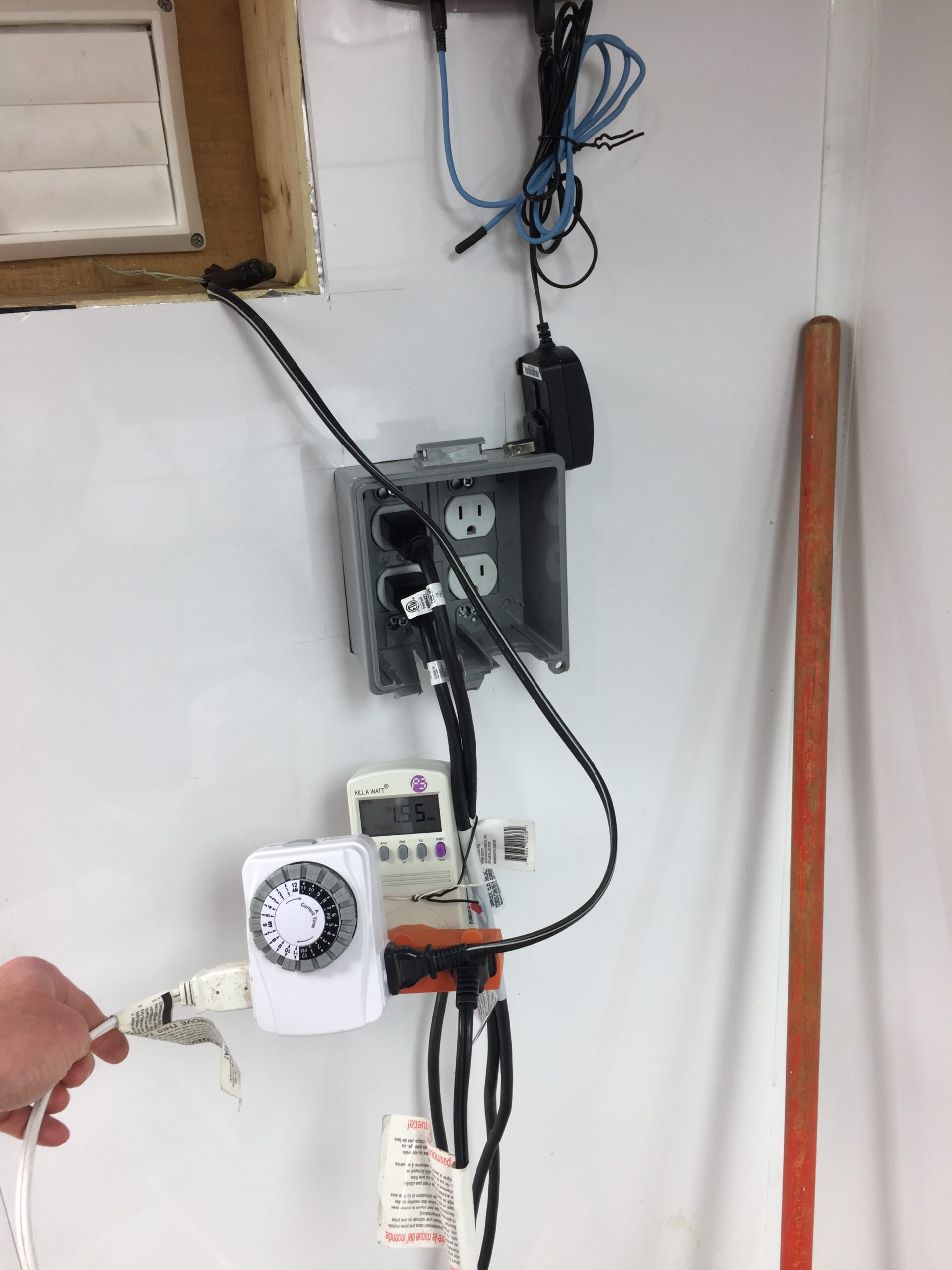 A ceramic convection heater was plugged into an Inkbird ITC 308 Temp. Controller, which was set at 3 degrees F above/below 75. Temperature was recorded 24/7 using a dual thermometer and hygrometer, which provided a 24 hour high and low for both temperature and humidity, as well as real time temperature and humidity readings. Electricity use was recorded for lights, and heat, and fan with a kWh with a plug-in Kill a Watt hour meter. As the light ballasts produce heat, we ran lights, controlled by a timer,14 hours/day from 6 PM to 8 AM during the coldest part of the 24 hour cycle. The heater ran as needed (controlled by the Inkbird) to maintain desired temperature (75 F / 23 C), mostly during the day when the lights were turned off.