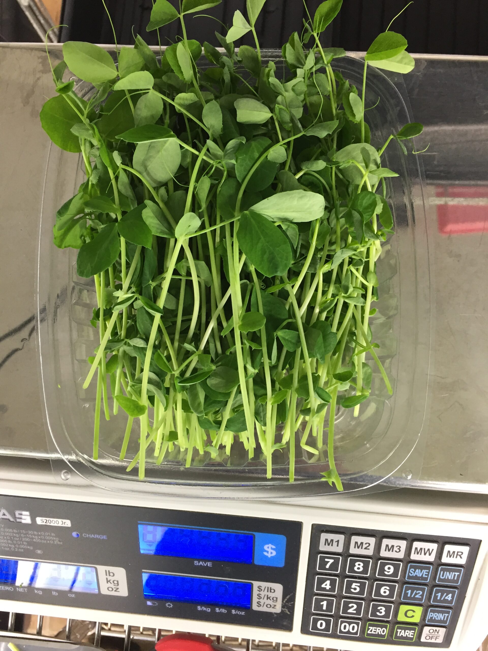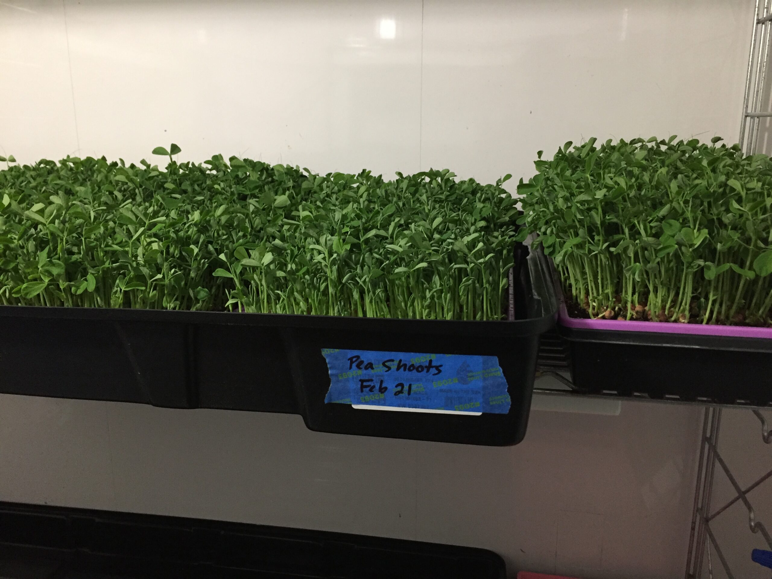 After working through issues with uneven watering and high temperatures due to the heat generated by the lights, and producing a consistent product, we developed relationships with three vendors and adjusted the number of trays accordingly. From February through March of this experiment, we seeded 11 trays/week, 5 pea shoots, and 2 each of the microgreens. We harvested the microgreens and weighed them on a certified scale, recording the weights by variety by tray.