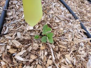 The bed was covered by approximately 5 inches of fresh, rough-cut wood chips, in fall 2021. Additional wood chips will be applied in April 2022. Underneath the wood chips is a layer of contractor’s paper, serving as a temporary weed barrier. A six-foot area of separation was created between Sections 2 and 3, in order to ensure that the Kaolin clay spray does not drift over from Section 3 to Section 2. The four sections were measured to allow for approximately ten inches between each planted strawberry.