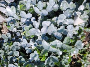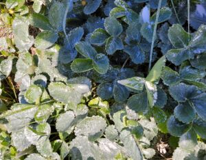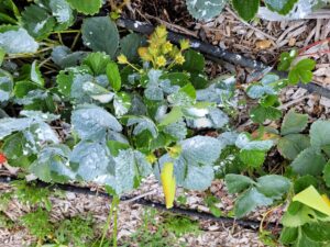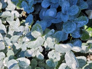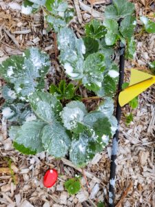 Throughout the 2022 season, there was no sign of any mold on any plant. There was occasional leaf spot or reddening on a few plants, but never more than a 1 on the scale. There were occasionally holes in some leaves, likely made by grasshoppers, resulting in a rank of 1 on the scale for a few months. No Japanese beetles were observed on the plants, and no birds were observed eating the berries after red rocks were placed among the plants. There appeared to be little difference between the sections treated with Kaolin clay, and those untreated, in terms of mold, leaf damage or insect damage: