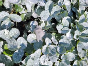There was a noticeable difference in the size and number of plants between the sections by the end of the season. The plants sprayed with Kaolin clay (Sections 3 and 4) had visibly larger plants, and many more, compared to the untreated plants (Sections 1 and 2). In Sections 3 and 4, the plants had almost completely filled out the entire bed, with runners spilling over onto the plastic outside the beds. In 2023, the plants completely filled all four beds.