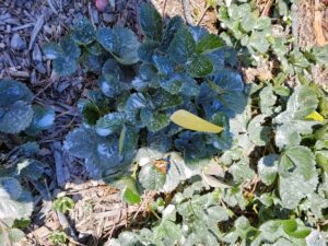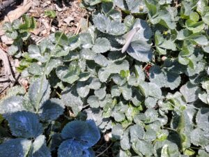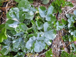 4/17/2022 One tablespoon of bloodmeal was spread around the base of each plant. By count, at least 50 plants in each section were now showing leaves. However, it is clear that the Seascape variety is the stronger/larger variety, as they had more leaves overall and the leaves were larger than the San Andreas variety. All flowers on the plants were nipped off in order to allow the plants to concentrate on developing.