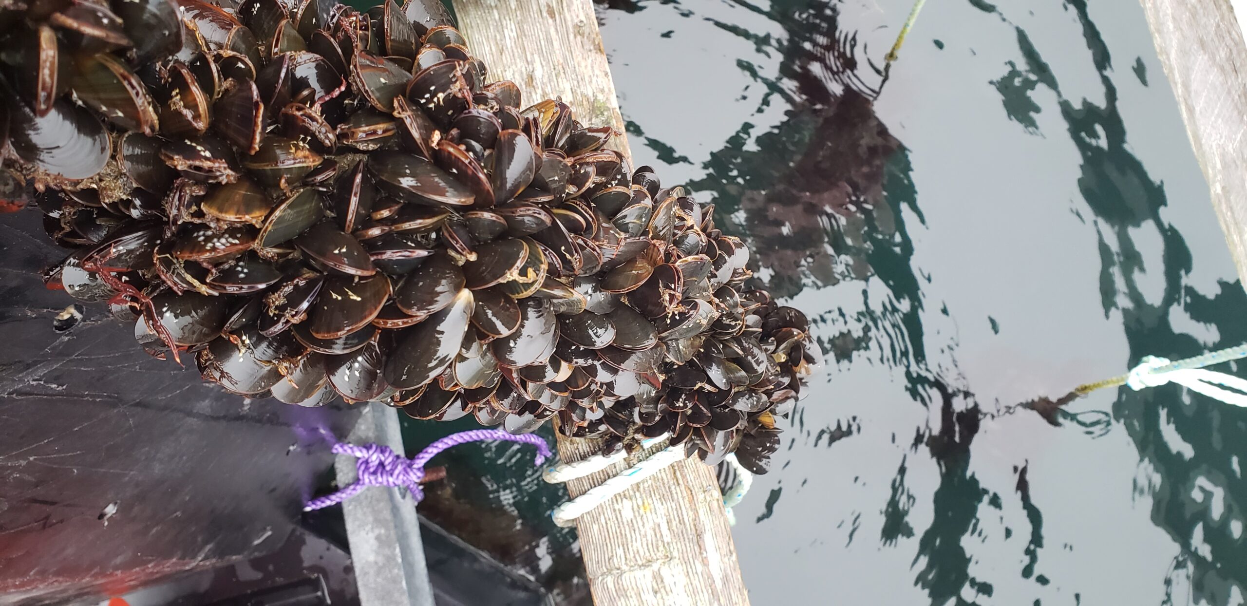 Mussels are our primary crop. We grow them on 35 ft vertical dropper lines deployed from Spanish style rafts that are 40' square. We currently have 26 rafts in full, year-round production. Most of our mussel seed comes from wild seed collection after a mussel spawning event, which typically happens once a year. After we have captured wild mussel seed, we protect it and manage its density on our mussel lines by splitting and netting. When the mussels have reached our market sizes of nearly 3 inches, we harvest. We harvest mussels 2-4 times a week, year round.