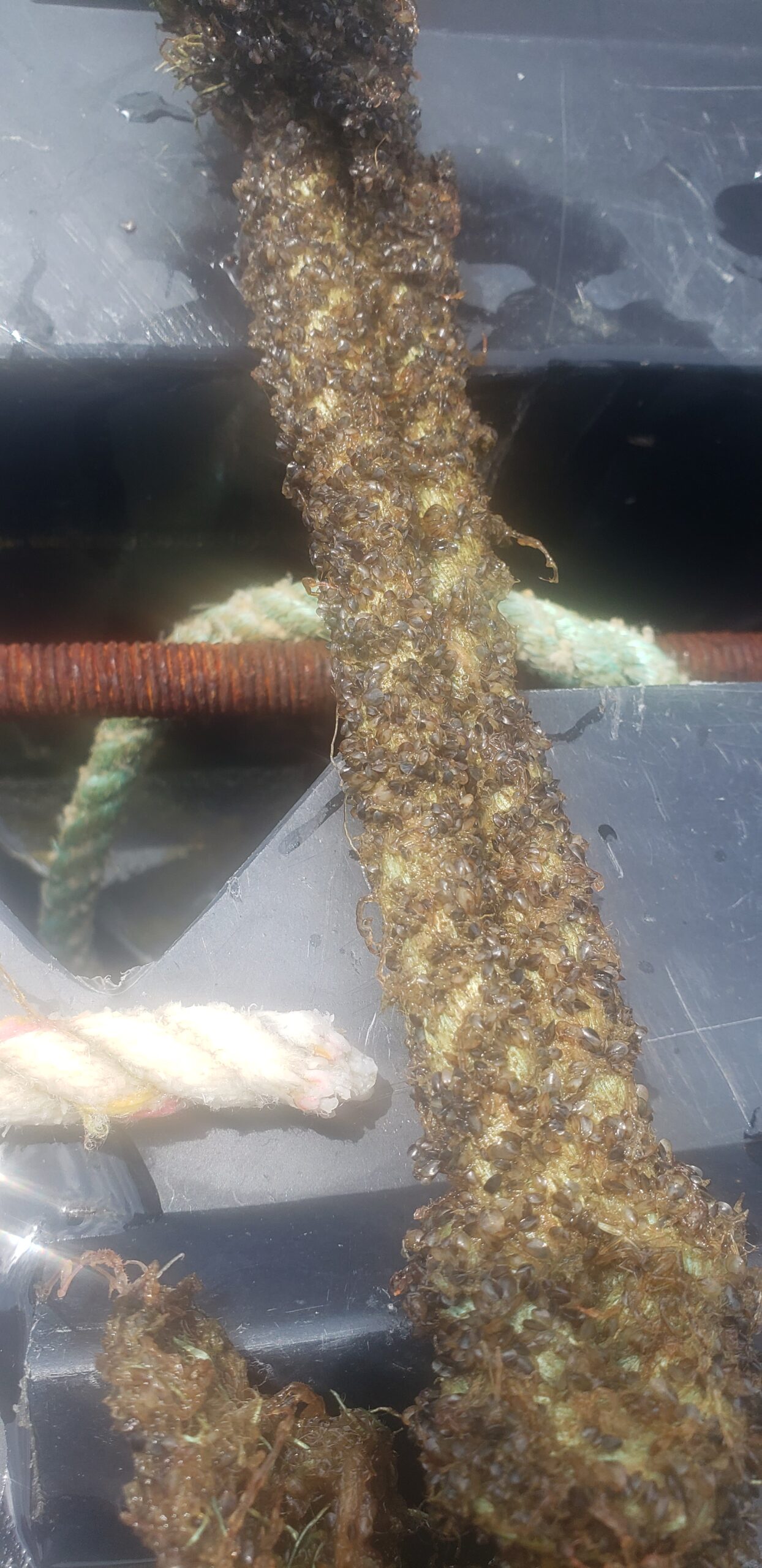 - Compare more expensive industry-standard fuzzy rope and recycled lobster rope for their ability to recruit mussel pediveligers in a remote settlement tank, then ultimately how the ropes will each perform on the farm. This can identify potential cost savings for farmers and optimize the remote settlement process.