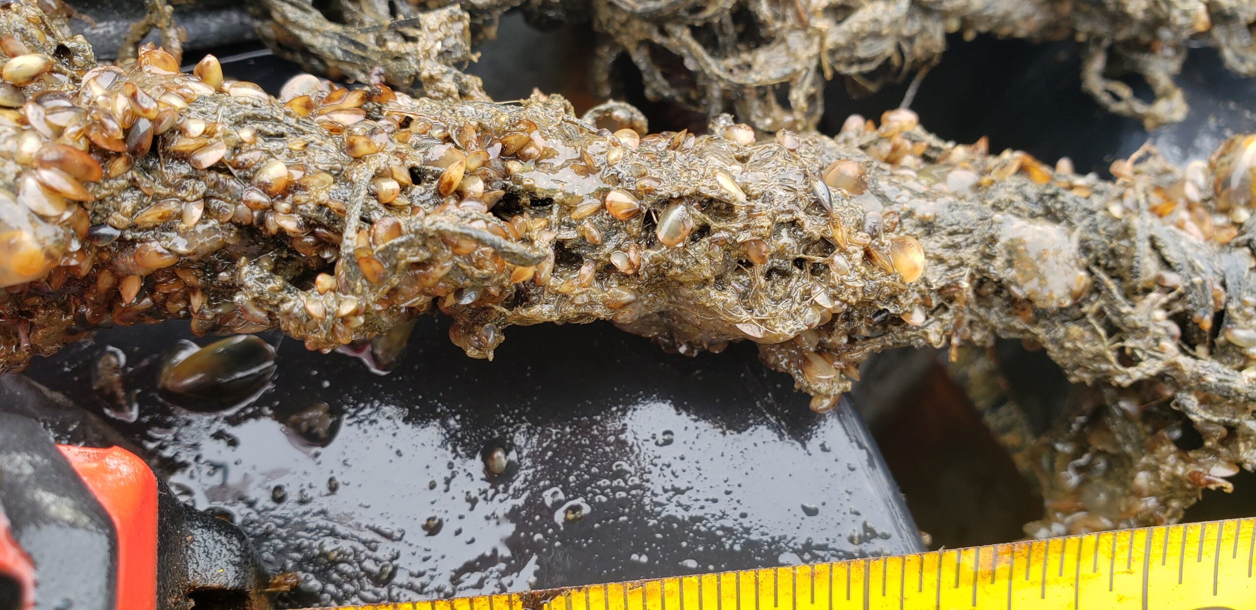 From the standard fuzzy droppers it was observed that there was slower growth deeper in the water column. Tunicates settled below 20 feet and increased in density until the bottom of the line. The monitoring of these lines called for monthly checks, but due to issues with previous rounds the team installed bi-weekly checks. More monitoring allowed BIM to create a stronger growth curve and spot differences between rope types. This monitoring partnered with larval monitoring of the surrounding waters and deployment of clean tester lines helped to determine potential timing, size and density of a wild mussel overset.