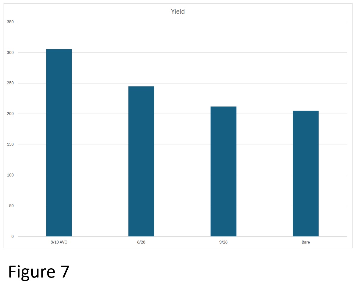The yield records indicate that planting cover crops sooner slightly impacts yield favorably. Because of factors like weed pressure and erratic weather, however, it is hard to say how accurate these yield results are, and further study is needed to verify these results. Figure 7 shows the extent of the in-row weeds on 7/22 at harvest, with a greater variety of weeds seen in the bare-earth bed.