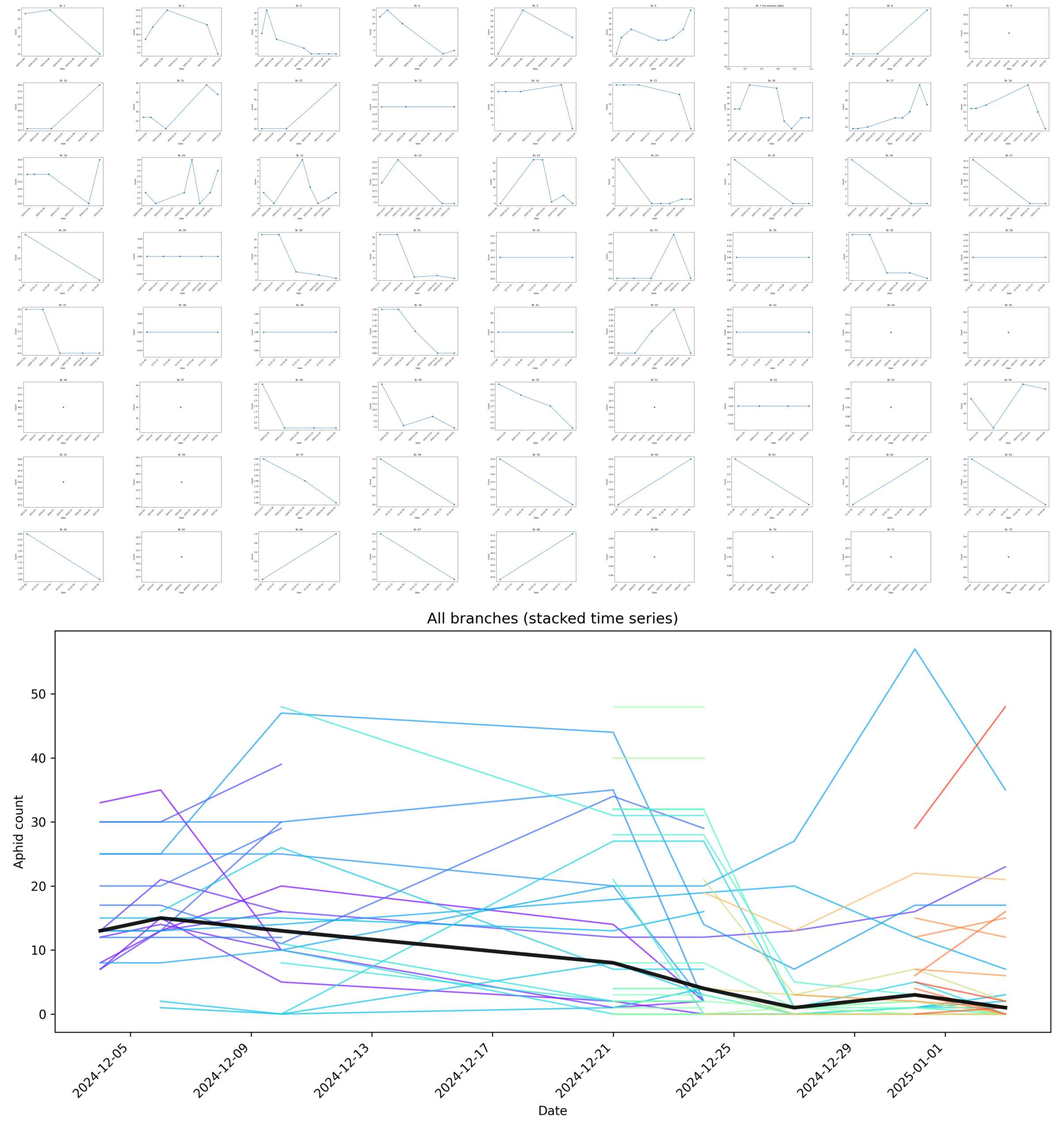 Figure 1. Branch-level aphid dynamics under Aphidius ervi biocontrol. Top panel: Individual branch-level time series (“sparklines”) for live aphid counts measured repeatedly over approximately one month across 72 branches. Each mini-plot represents a single branch, showing raw counts of live aphids only; aphid mummies (parasitized individuals) were explicitly excluded from counts. Missing values correspond to late addition of new branches to the tracked set and/or physical loss of a branch tag. Bottom panel: All branch-level time series overlaid in a single plot (colored by branch), with a bold black line indicating the per-date median aphid count across all branches. Despite substantial heterogeneity in early aphid abundance across branches, median aphid counts decline and remain suppressed over time, rather than exhibiting unchecked exponential growth. Together, these data provide a branch-resolved proxy for the coupled dynamics of the aphid population and the parasitoid Aphidius ervi population. Because mummified aphids were excluded, reductions in live aphid counts reflect both direct aphid mortality and successful parasitoid activity. The absence of a sustained exponential increase in aphid abundance across branches is consistent with effective population-level suppression by A. ervi under the experimental conditions.