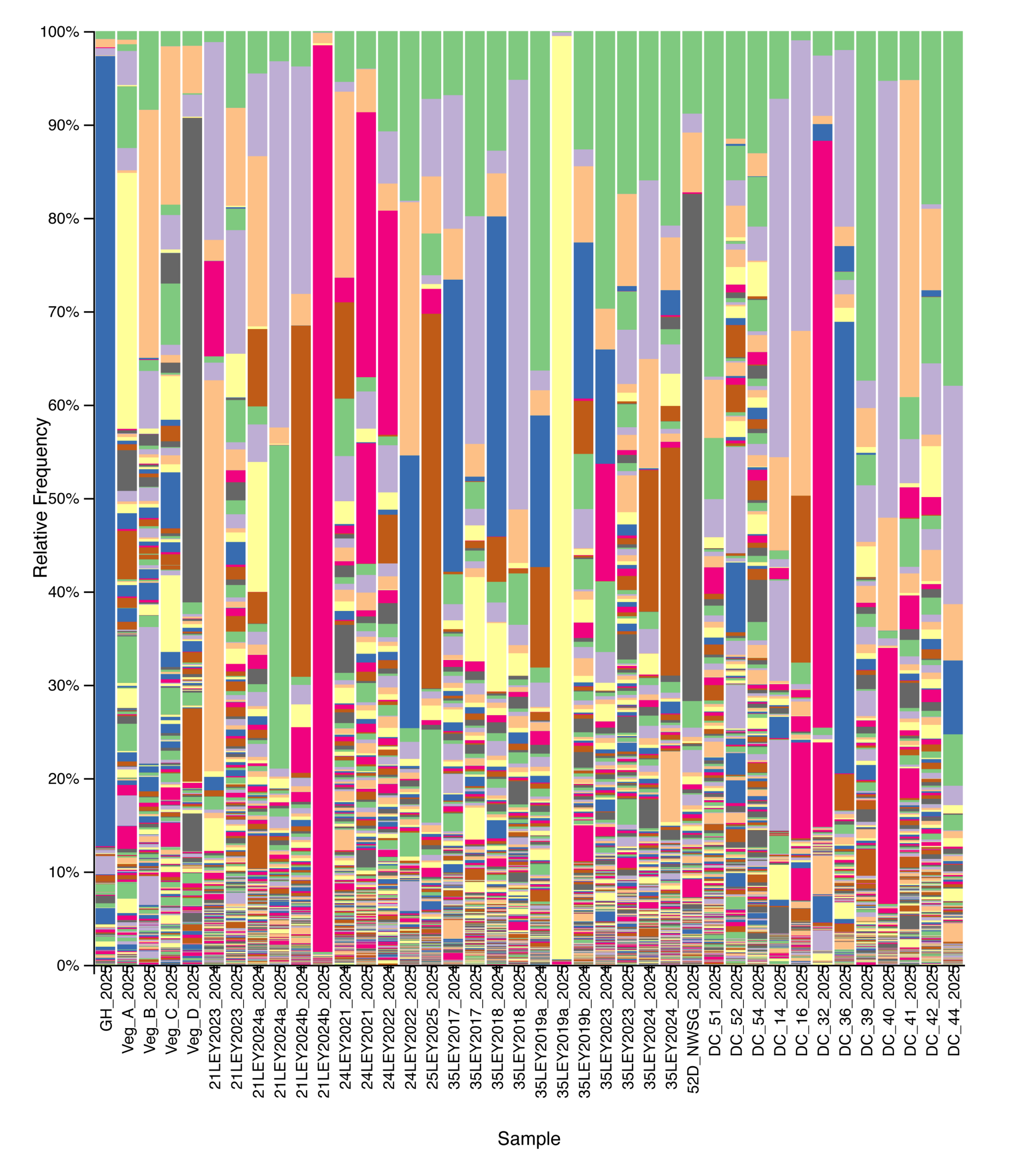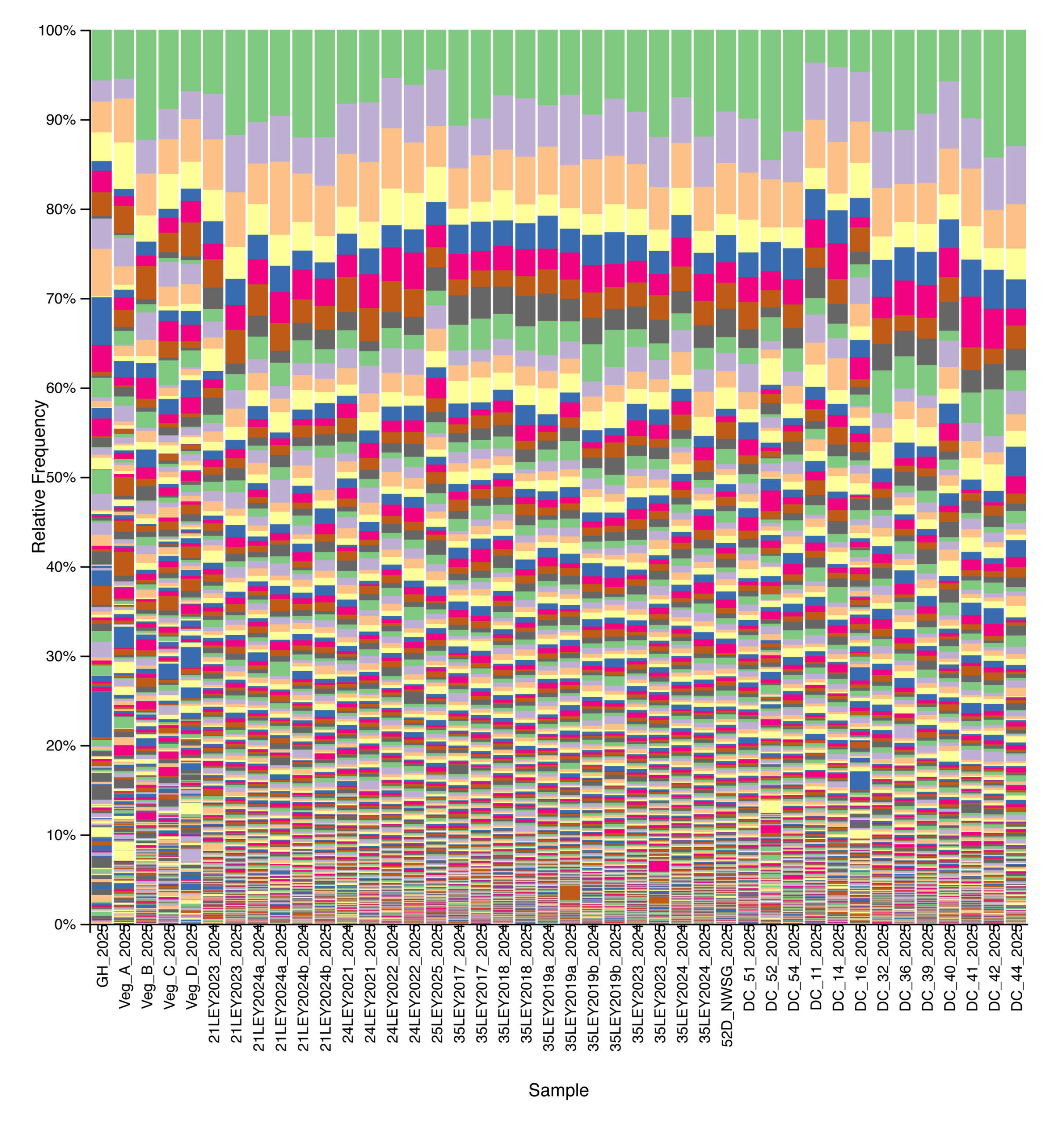 Figure 3. Relative abundance of bacterial taxa across agricultural and grassland systems based on 16S rRNA gene sequencing. Each stacked bar represents a single soil sample, ordered from left to right by management type: crop fields, ley rotations, native warm-season grass establishment, and cool-season pastures. Colors denote distinct bacterial taxa.