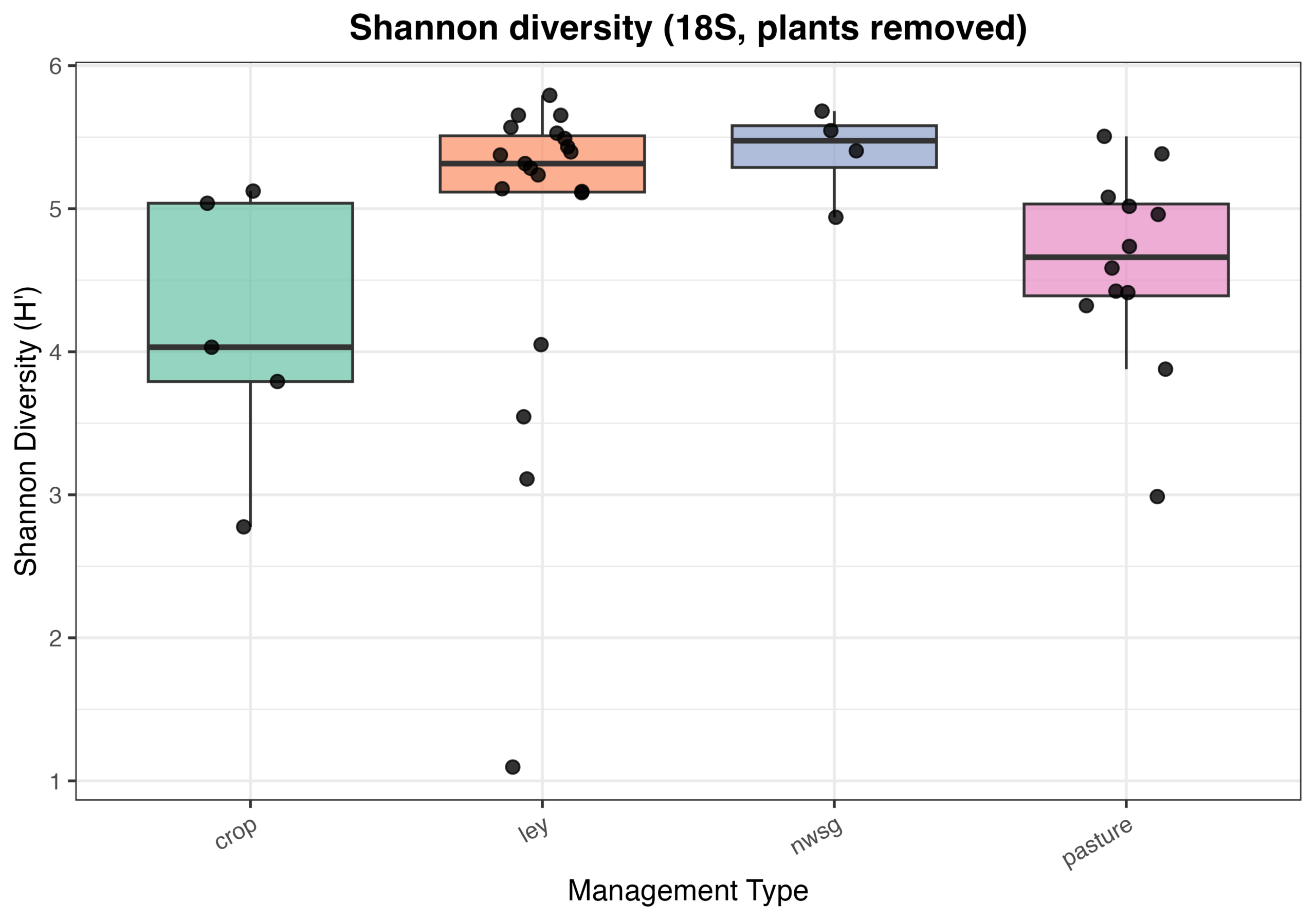 Figure 8. Eukaryotic alpha diversity (Shannon index) from 18S sequencing across management types following removal of plant-derived sequences. Each point represents an individual soil sample, with boxplots summarizing distributions within crop fields, ley rotations, native warm-season grass establishment (NWSG), and cool-season pastures.