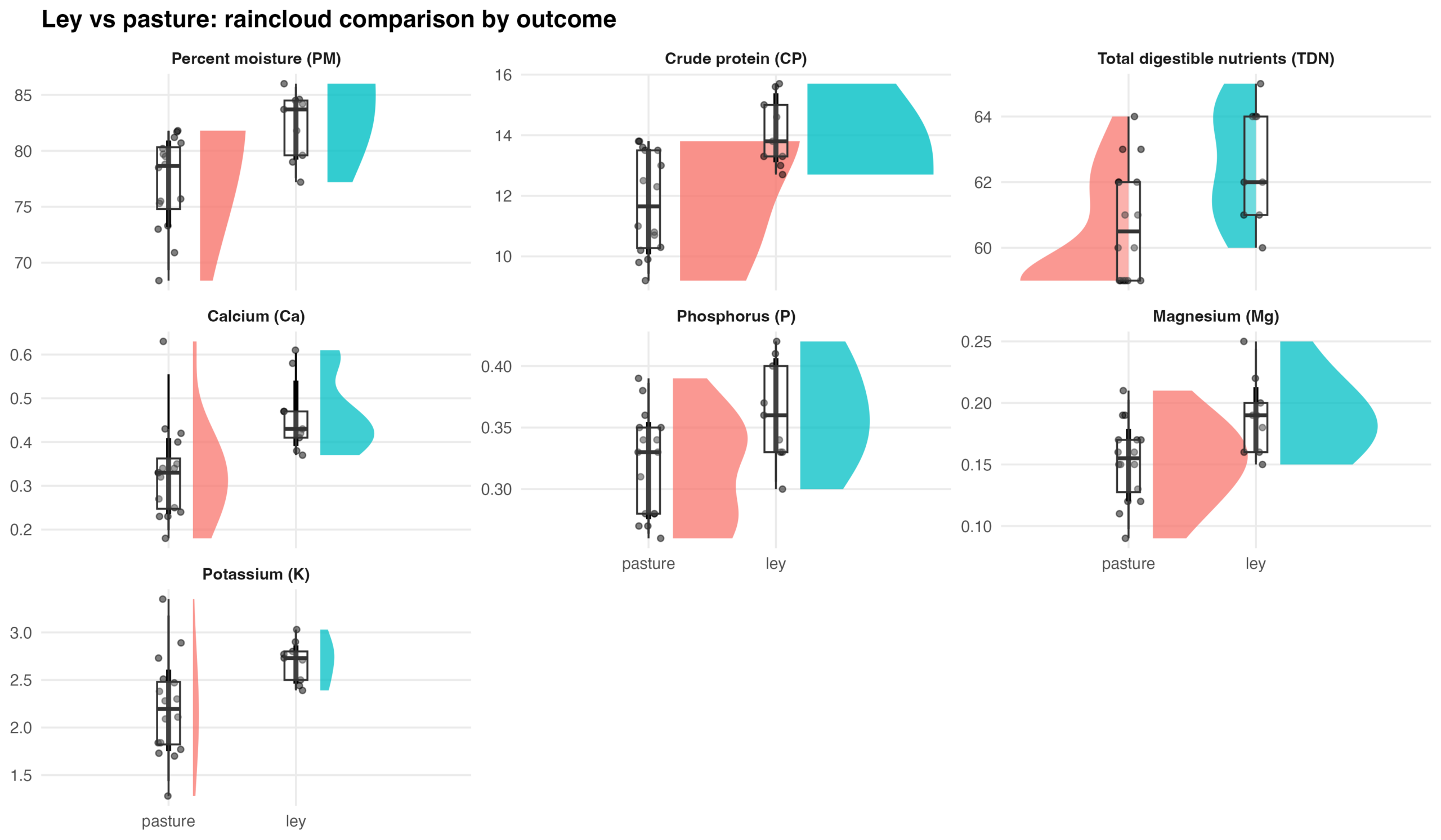 Figure 1. Raincloud plots comparing forage composition in ley and perennial cool-season pasture systems. For each outcome, half-violin density plots show the distribution of observations by management system (pasture vs. ley), overlaid with individual plot-level observations (points) and boxplots indicating the median and interquartile range. Outcomes include percent moisture (PM), crude protein (CP), total digestible nutrients (TDN), calcium (Ca), phosphorus (P), magnesium (Mg), and potassium (K). Facets are scaled independently to reflect differences in measurement units and ranges among variables.